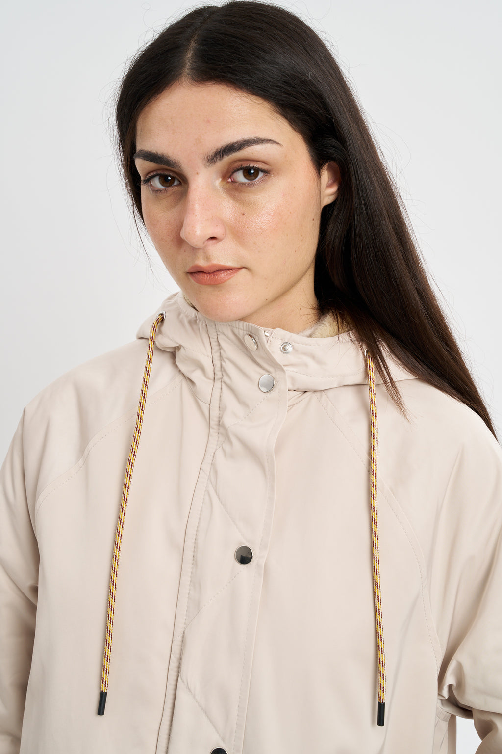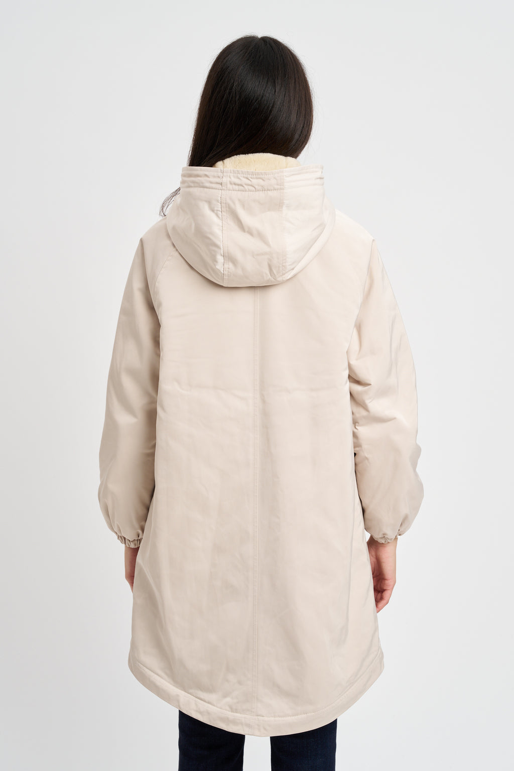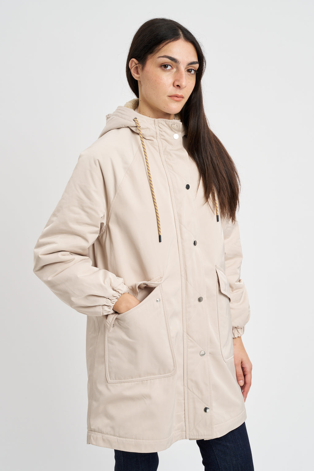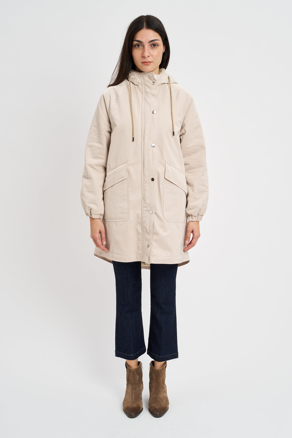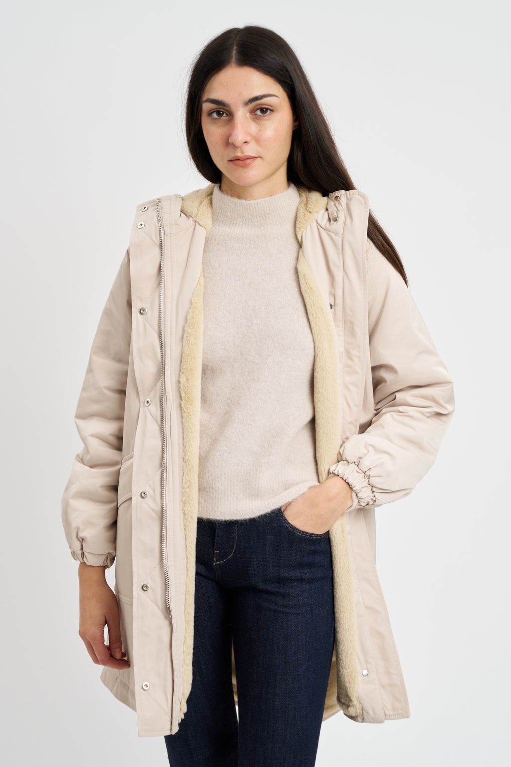 Parka con interno in eco pelliccia beige. La parte dietro è leggermente più lunga e crea asimmetria. Chiusura con zip e bottoni , doppia tasca sul davanti.