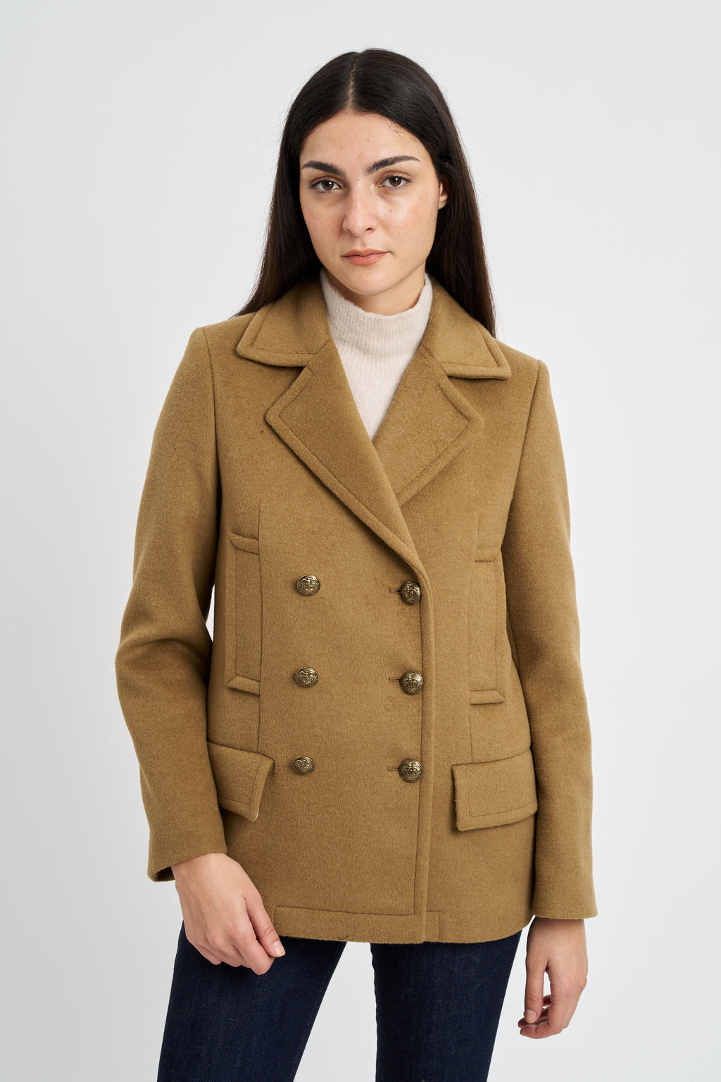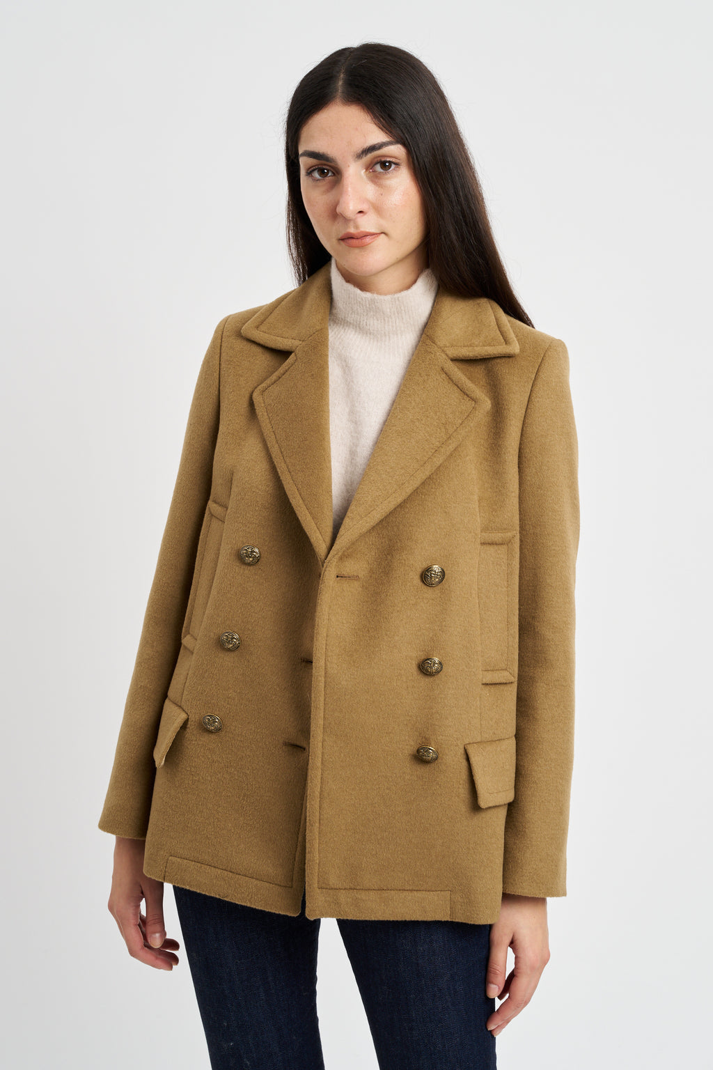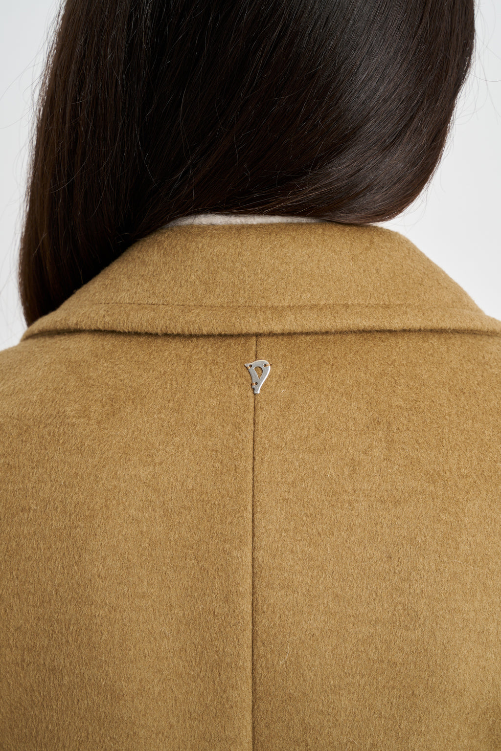 Peacoat doppiopetto regular a sei bottoni gioiello, con tasche a filetto e tasche con pattina. Velour misto lana. Logo Dondup. Made in Italy
