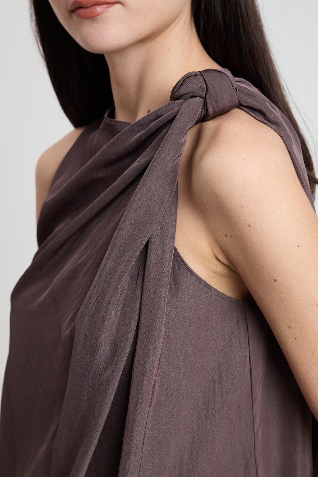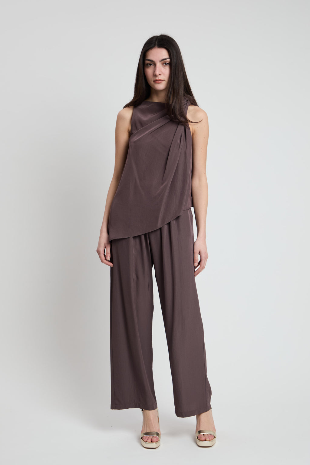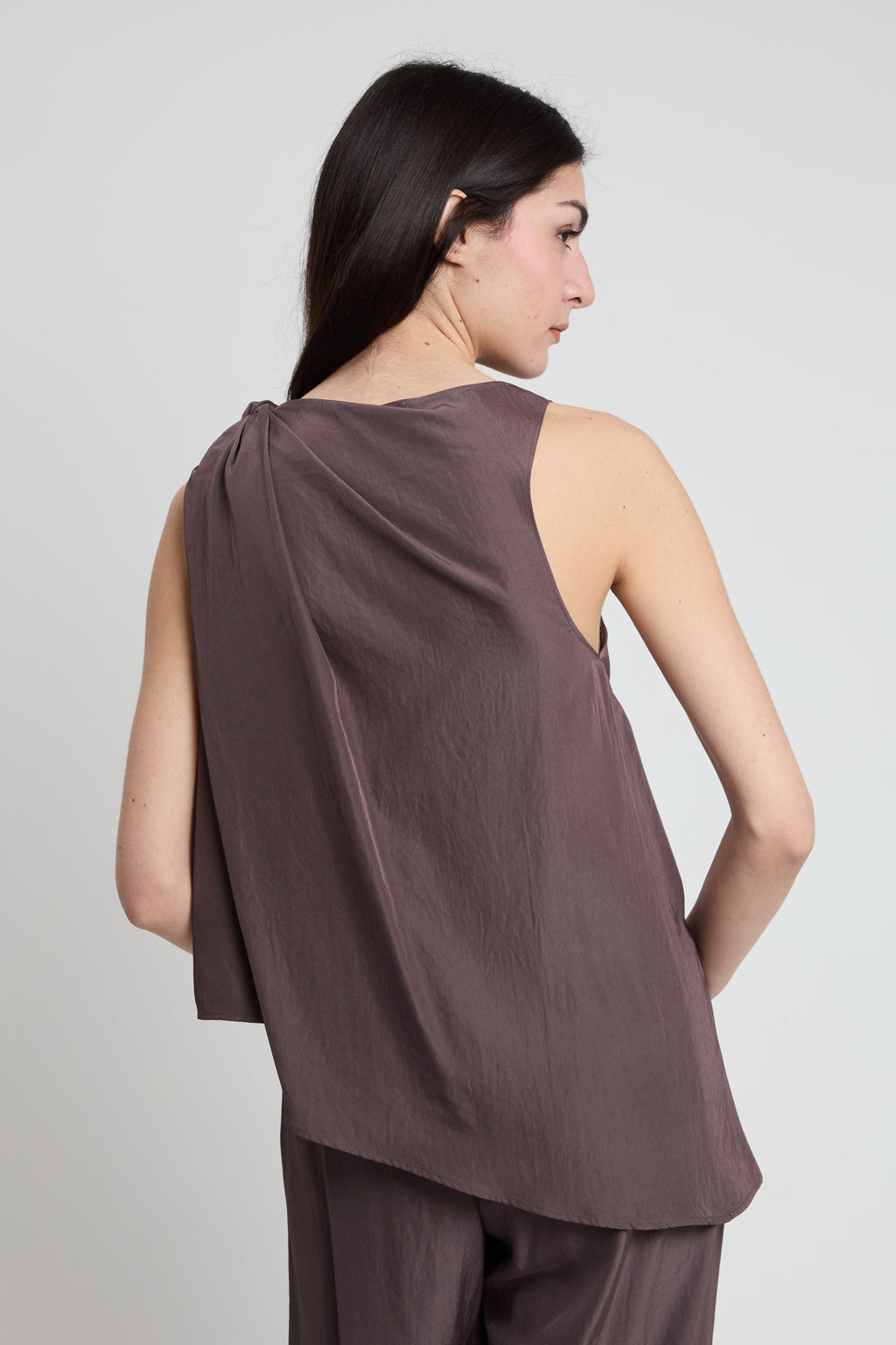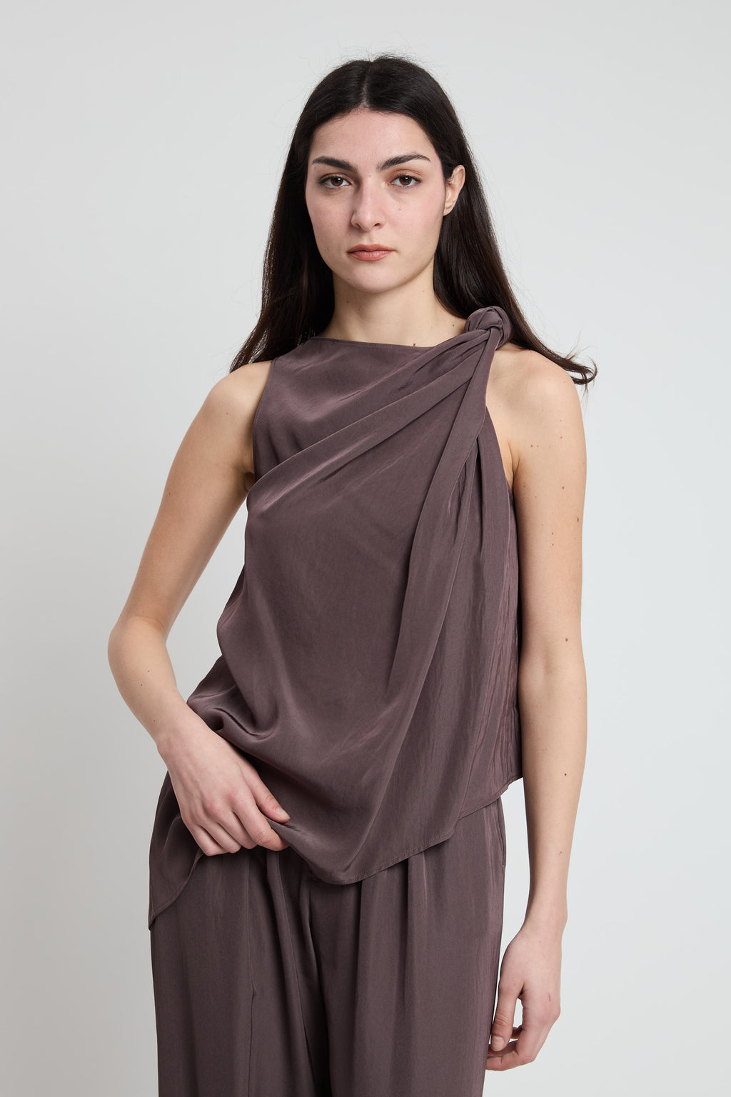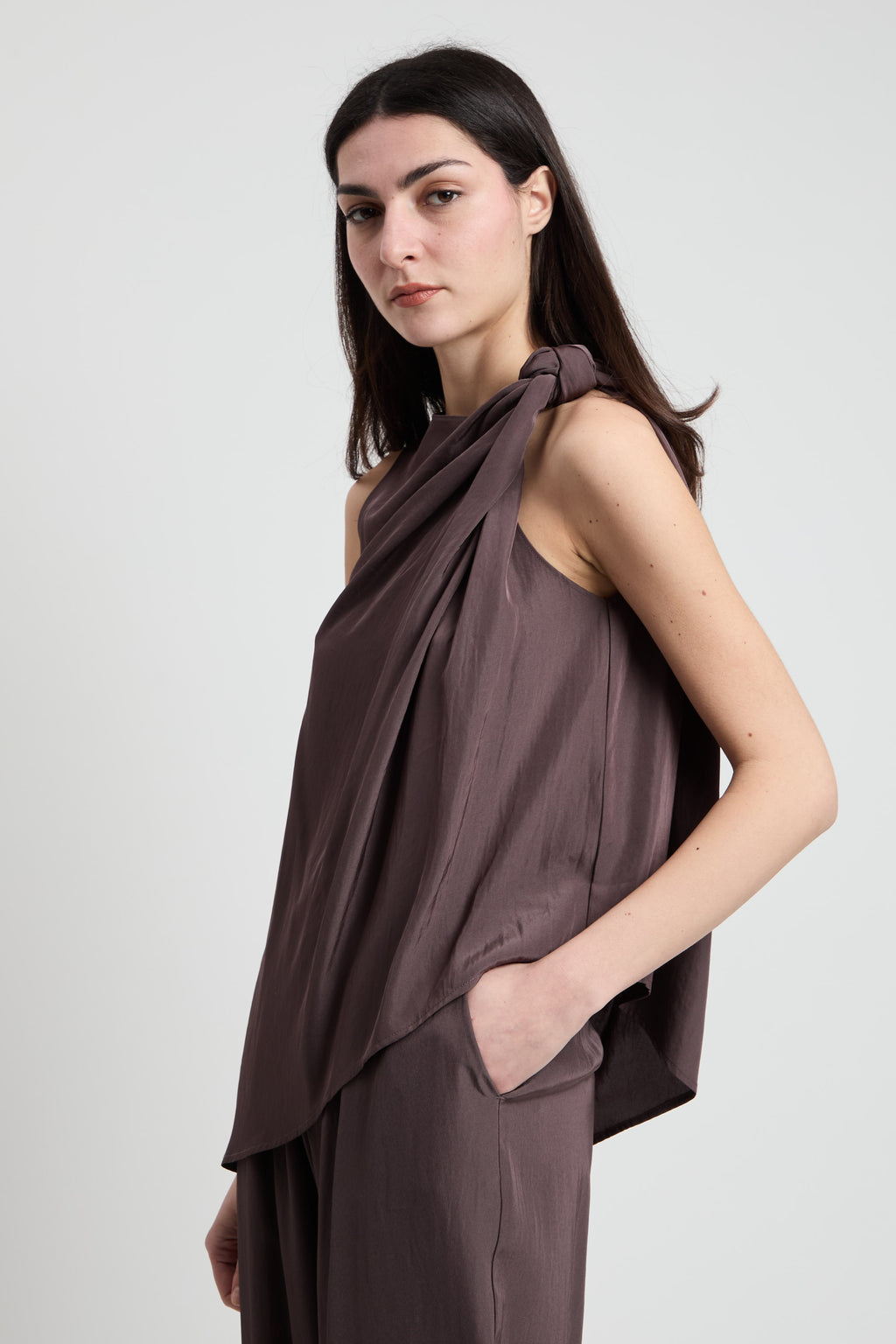 Top smanicato in tessuto morbido e versatile, caratterizzato da un elegante motivo a nodo sulla spalla che aggiunge un tocco di originalità al vostro look. Perfetto per creare outfit sofisticati sia in occasioni casual che più formali. La silhouette senza maniche lo rende ideale per le mezze stagioni, permettendovi di indossarlo da solo o in abbinamento a giacche e cardigan. Un capo essenziale che combina stile e praticità.