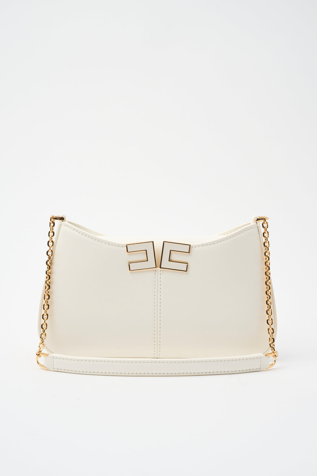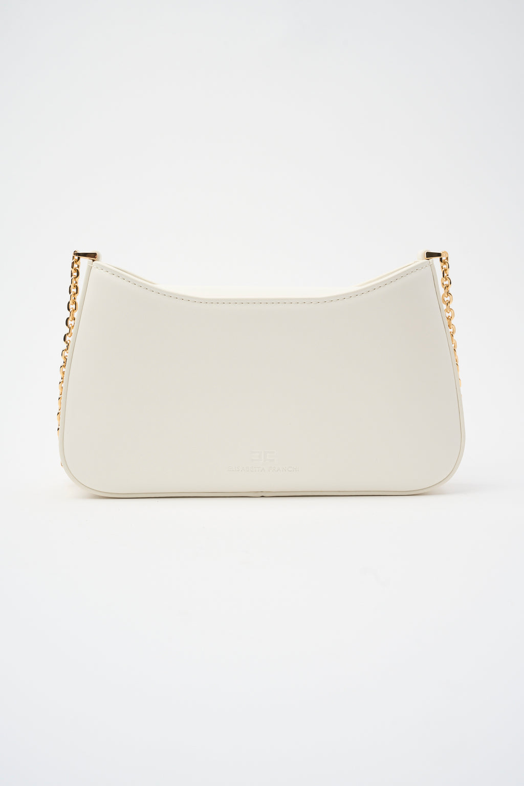 Borsa a spalla con tracolla in metallo dorato completa di spallaccio. Il taglio a V sul davanti è impreziosito dal logo in metallo dorato e smaltato internamente.