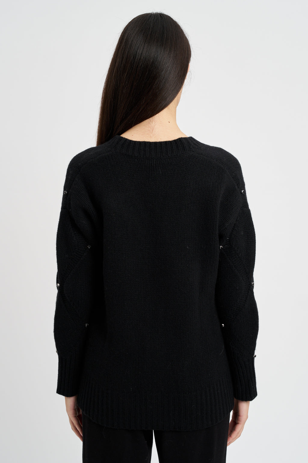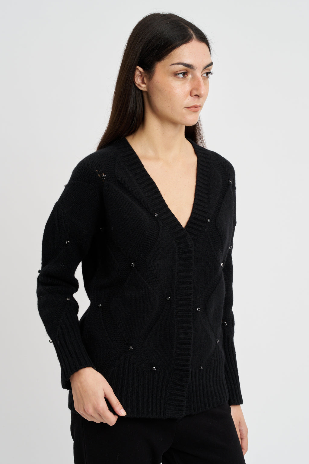 Maglia collo a cratere con motivo a losanghe e strass applicati.