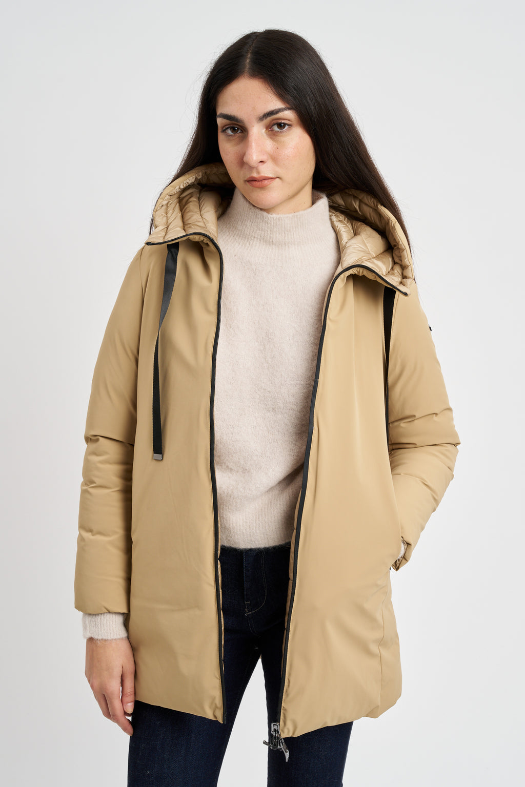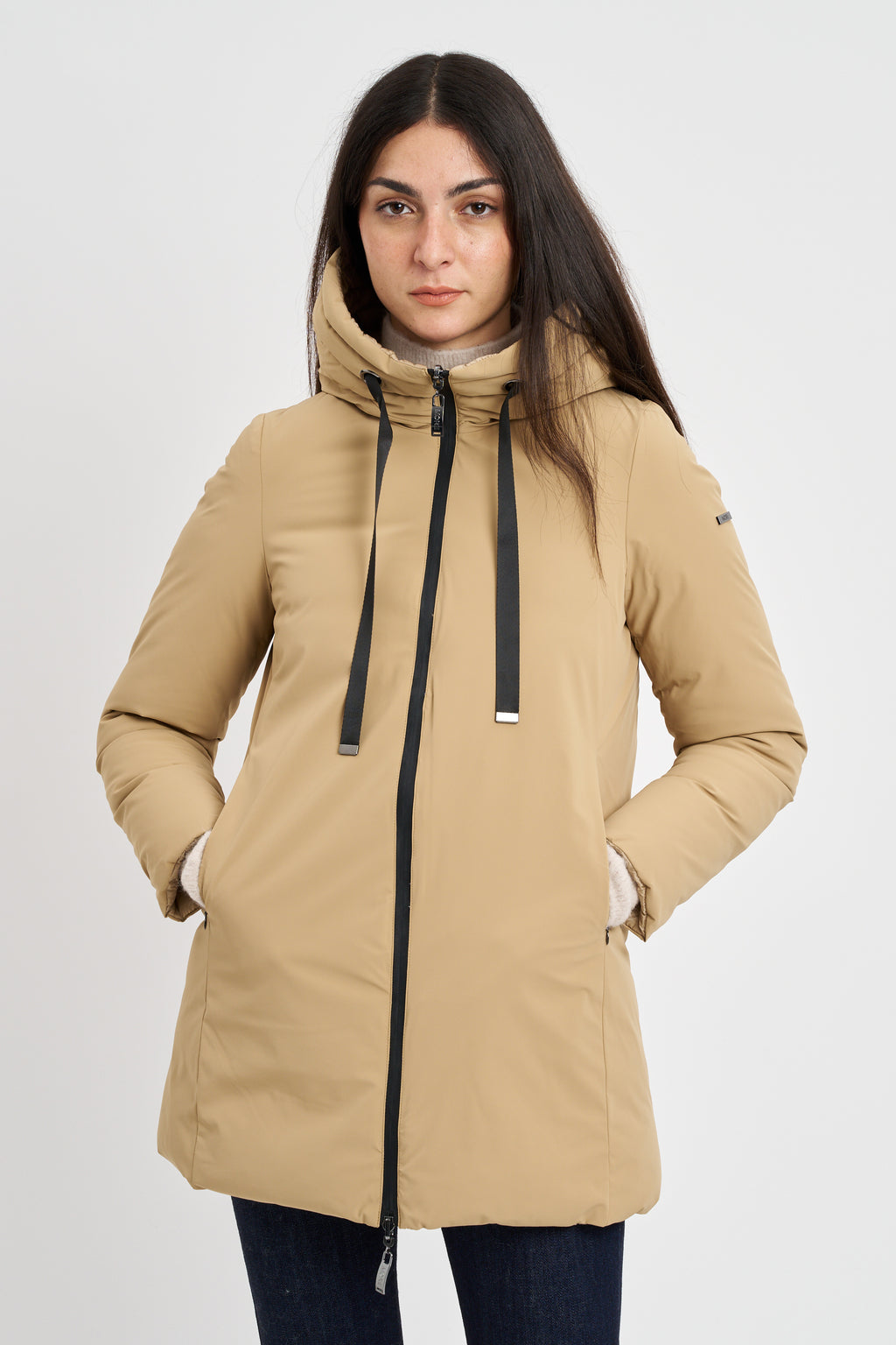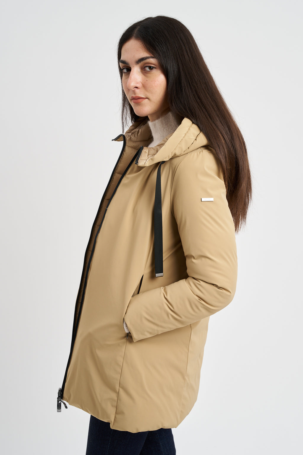 Piumino midi reversibile impermeabile. cappuccio con coulisse e doppia tasca a filetto.