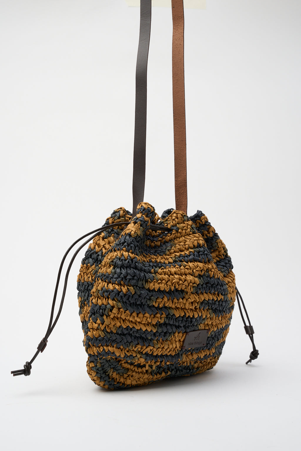 Borsa secchiello in raffia con fodera in cotone, caratterizzata da coulisse e tracolla in cuoio. Il design a righe multicolor conferisce un'estetica fresca e versatile, perfetto per l'uso quotidiano. La chiusura con lacci garantisce praticità e sicurezza, mantenendo uno stile elegante e naturale. Un accessorio funzionale che combina materiali di qualità con un'estetica senza tempo.