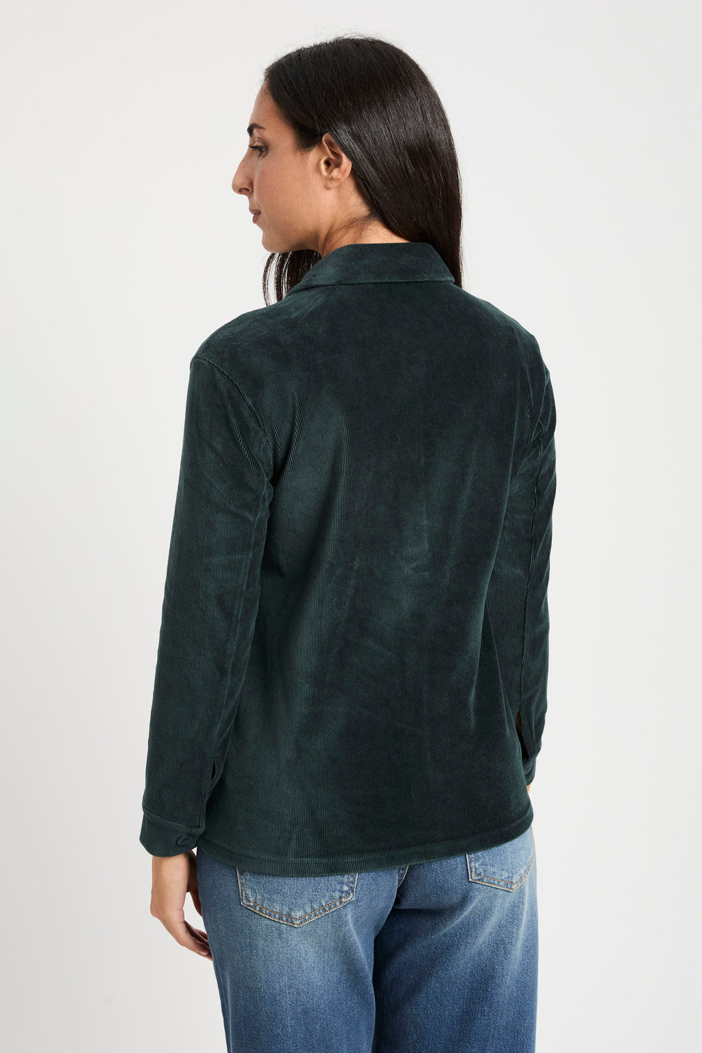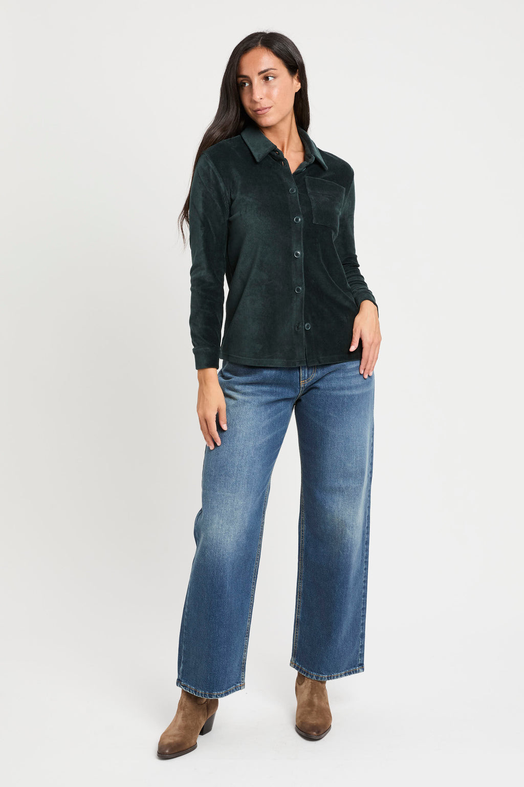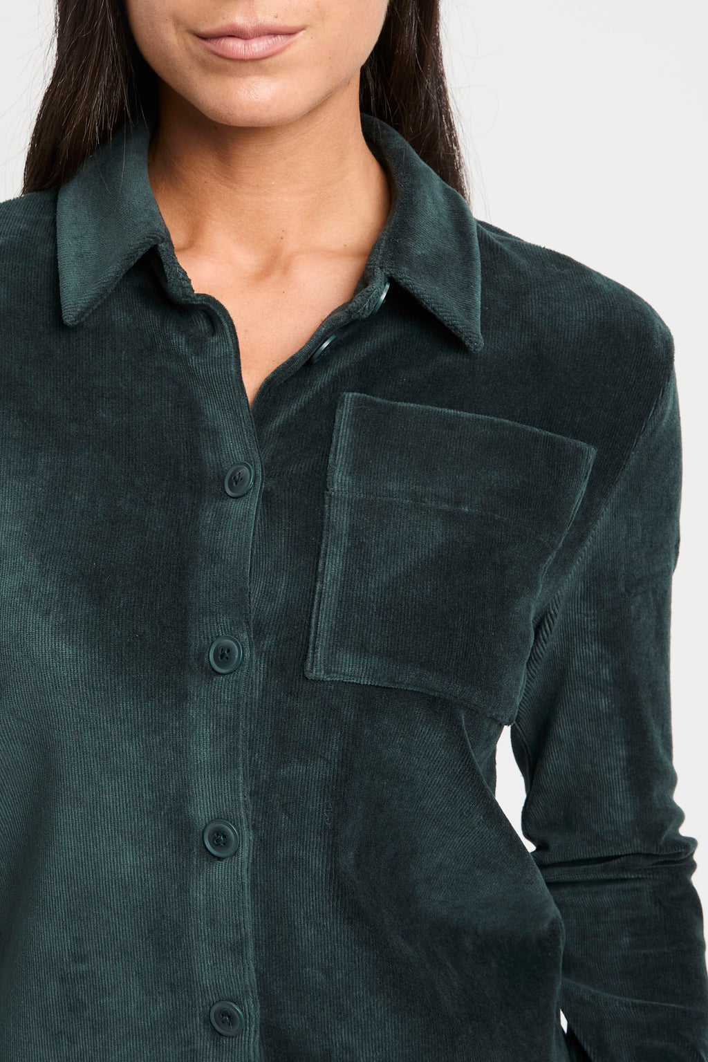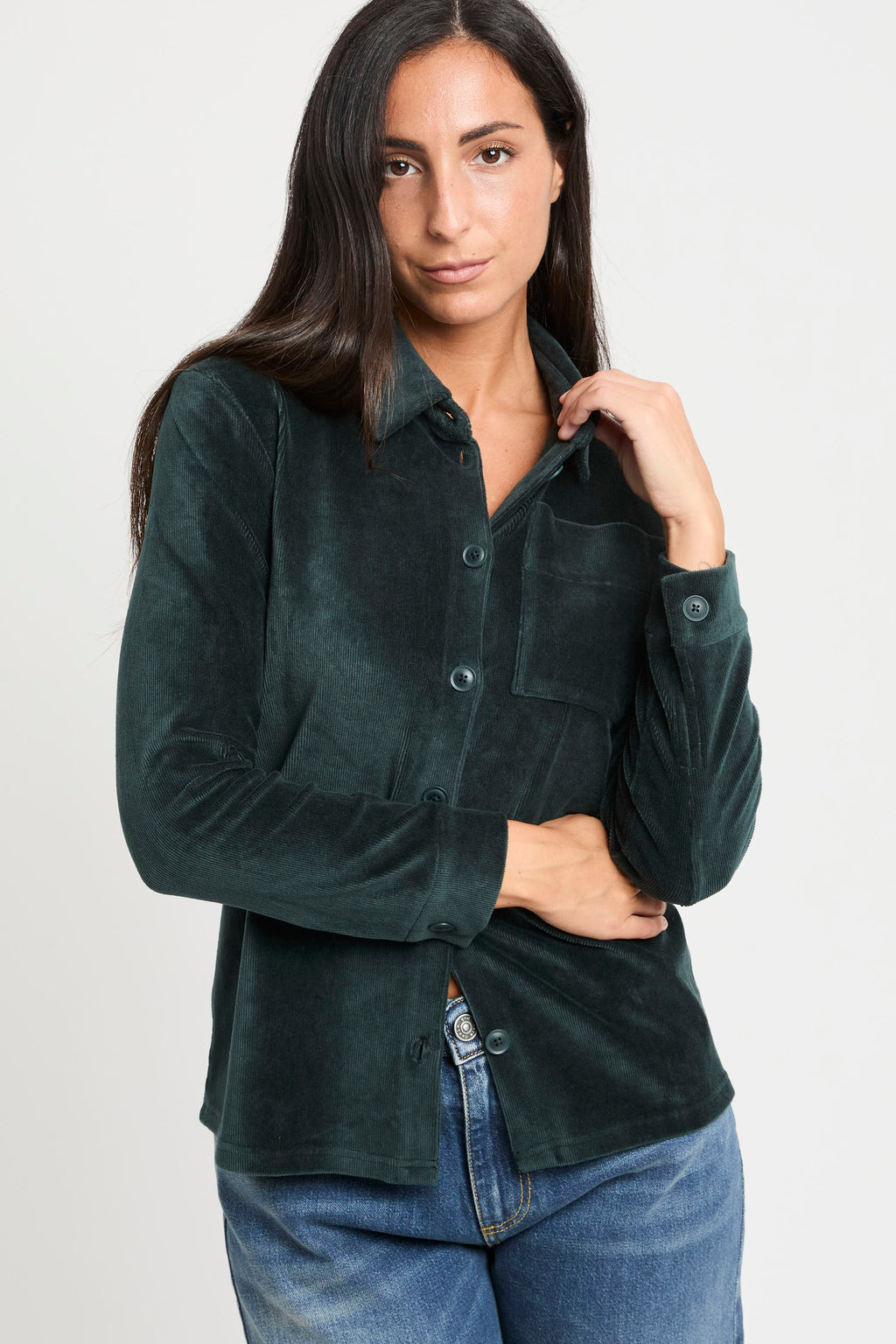 Camicia in velluto verdone: tessuto ricco che dà profondità al colore, con bottoni coordinati e taschino sul petto. Ideale per aggiungere un tocco caldo al look, da abbinare a denim o gonne nell’ottica di uno stile casual raffinato.