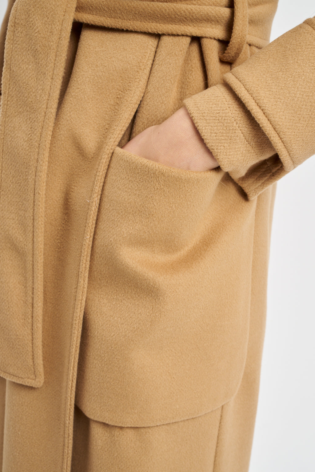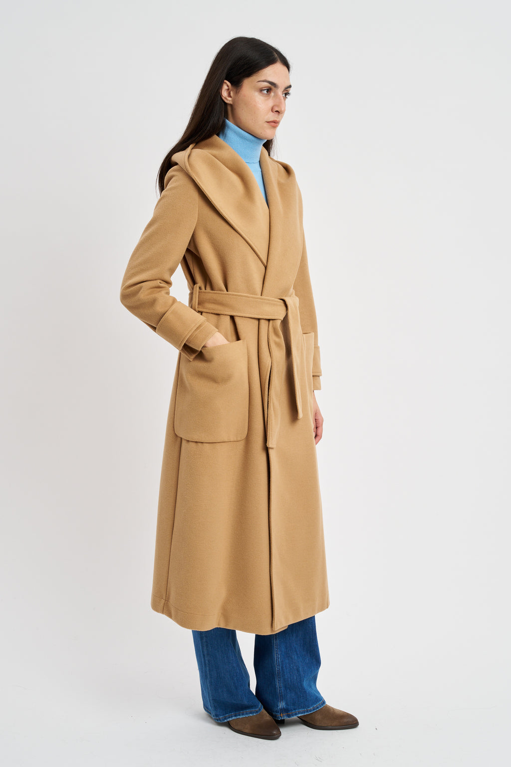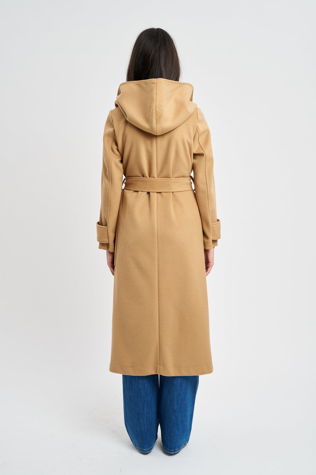 Cappotto Caldo ed avvolgente dal taglio a vestaglia con cintura e cappuccio. Doppia tasca a toppa sul davanti.