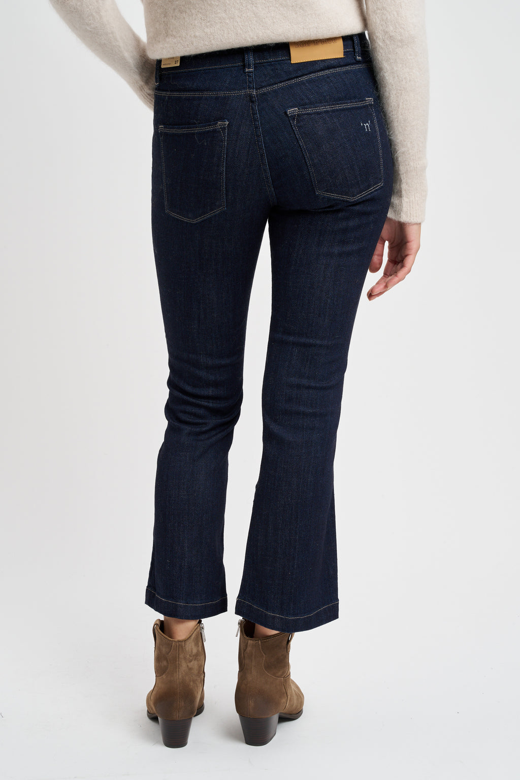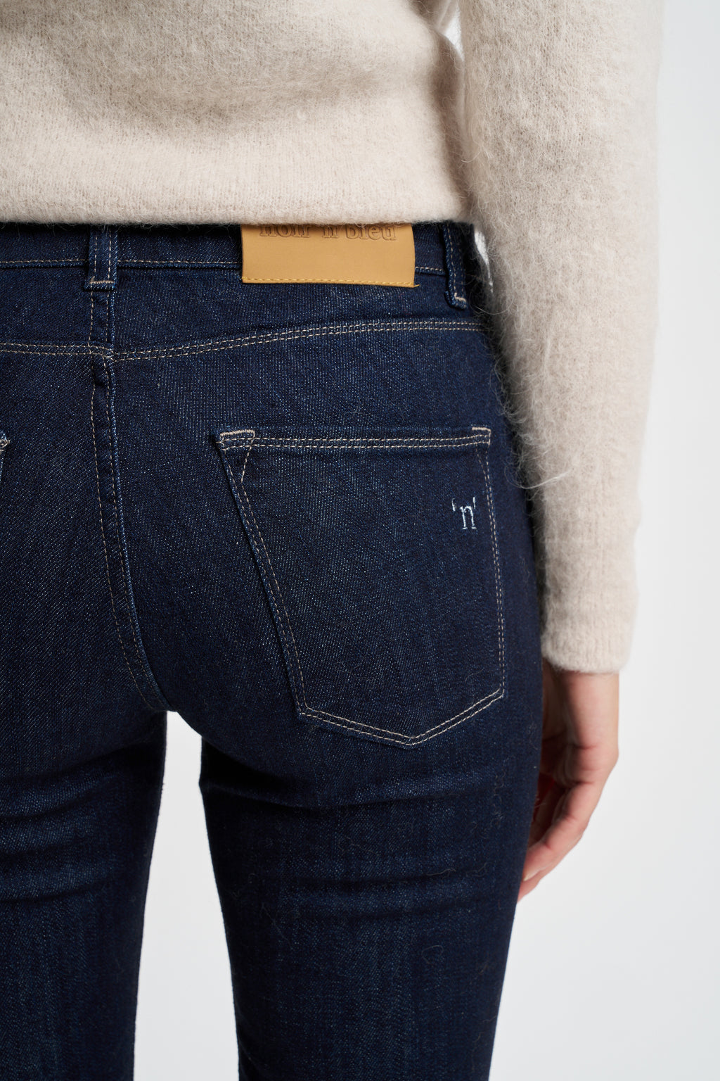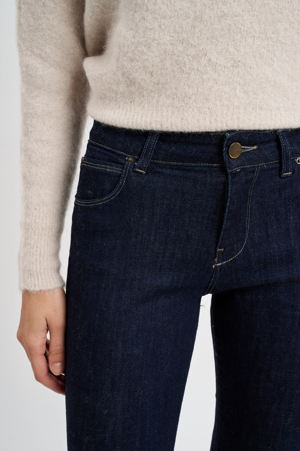 Jeans Blu scuro con vestibilità asciutta e fondo leggermente a trombetta.