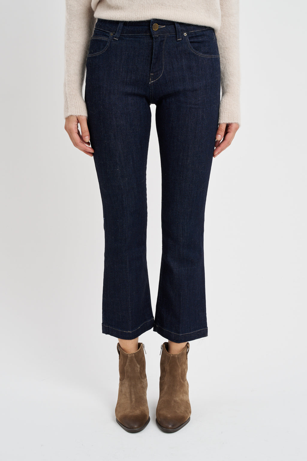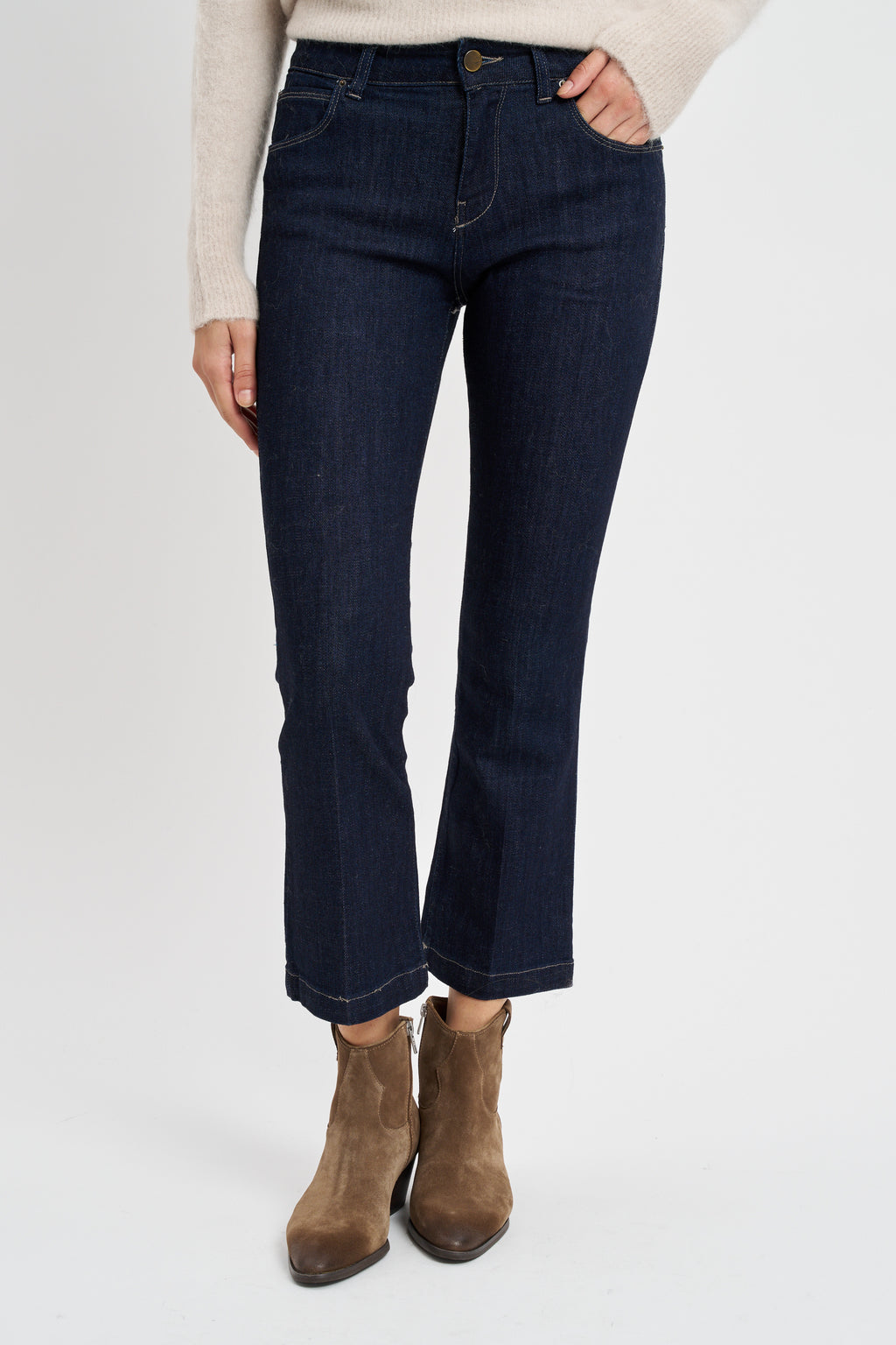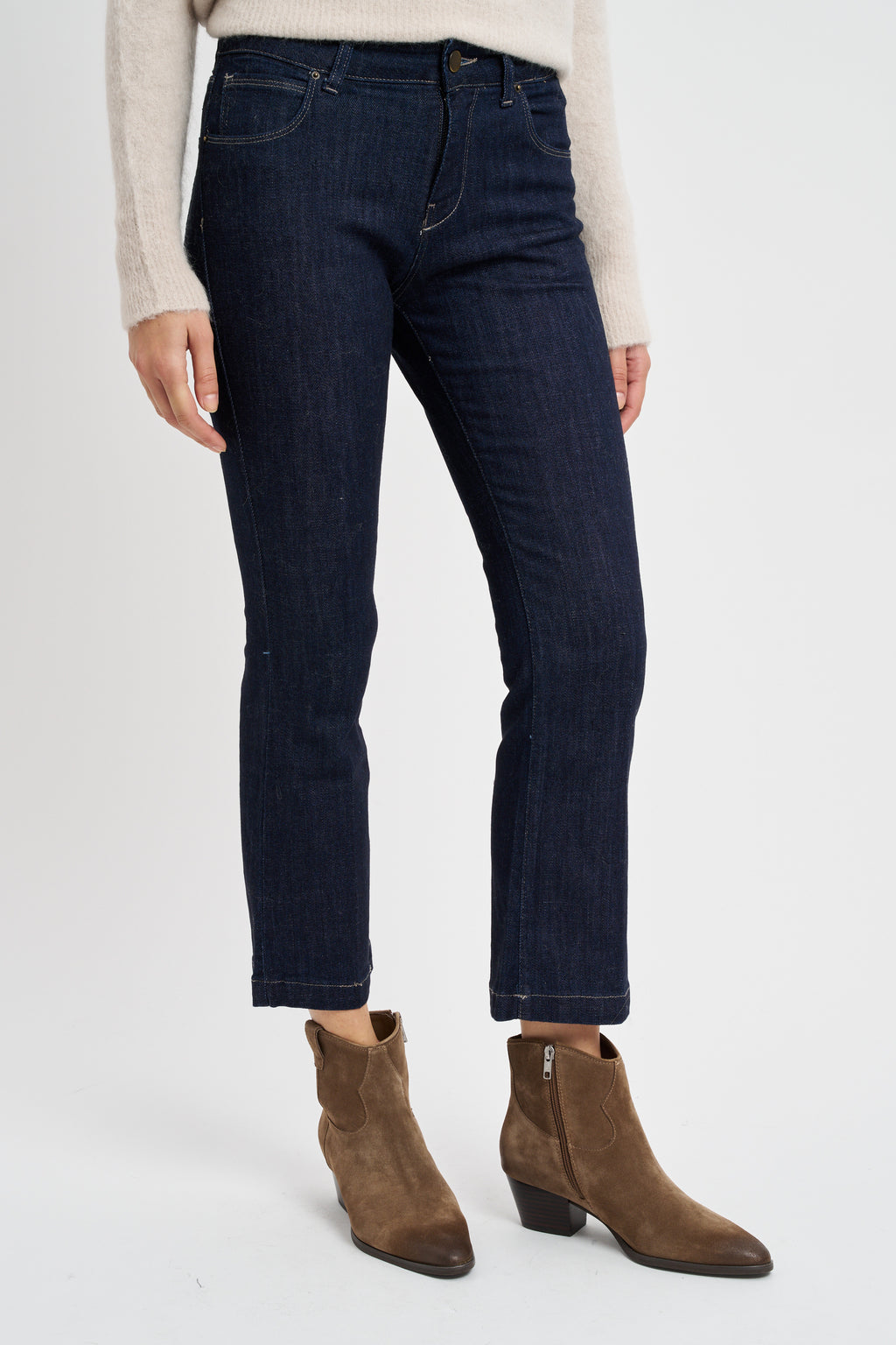 Jeans Blu scuro con vestibilità asciutta e fondo leggermente a trombetta.