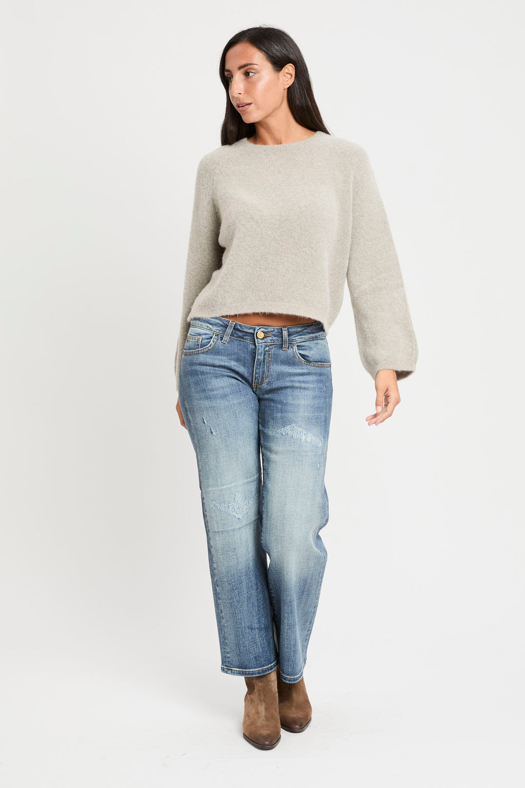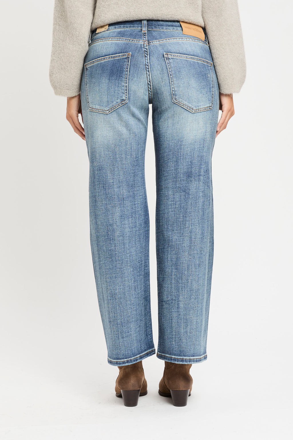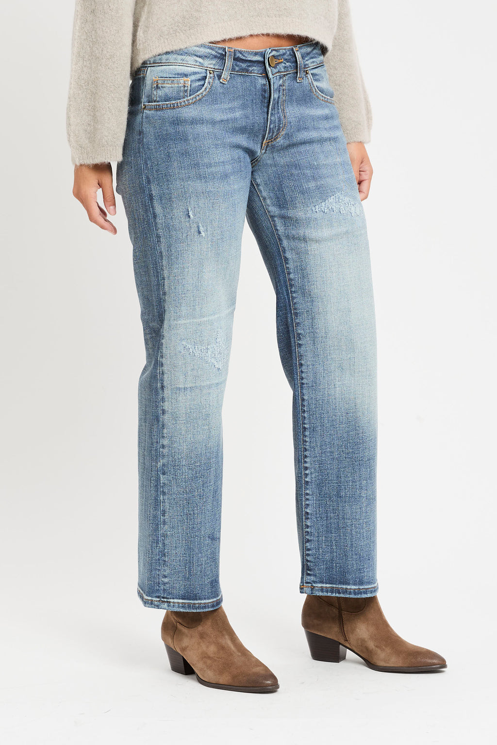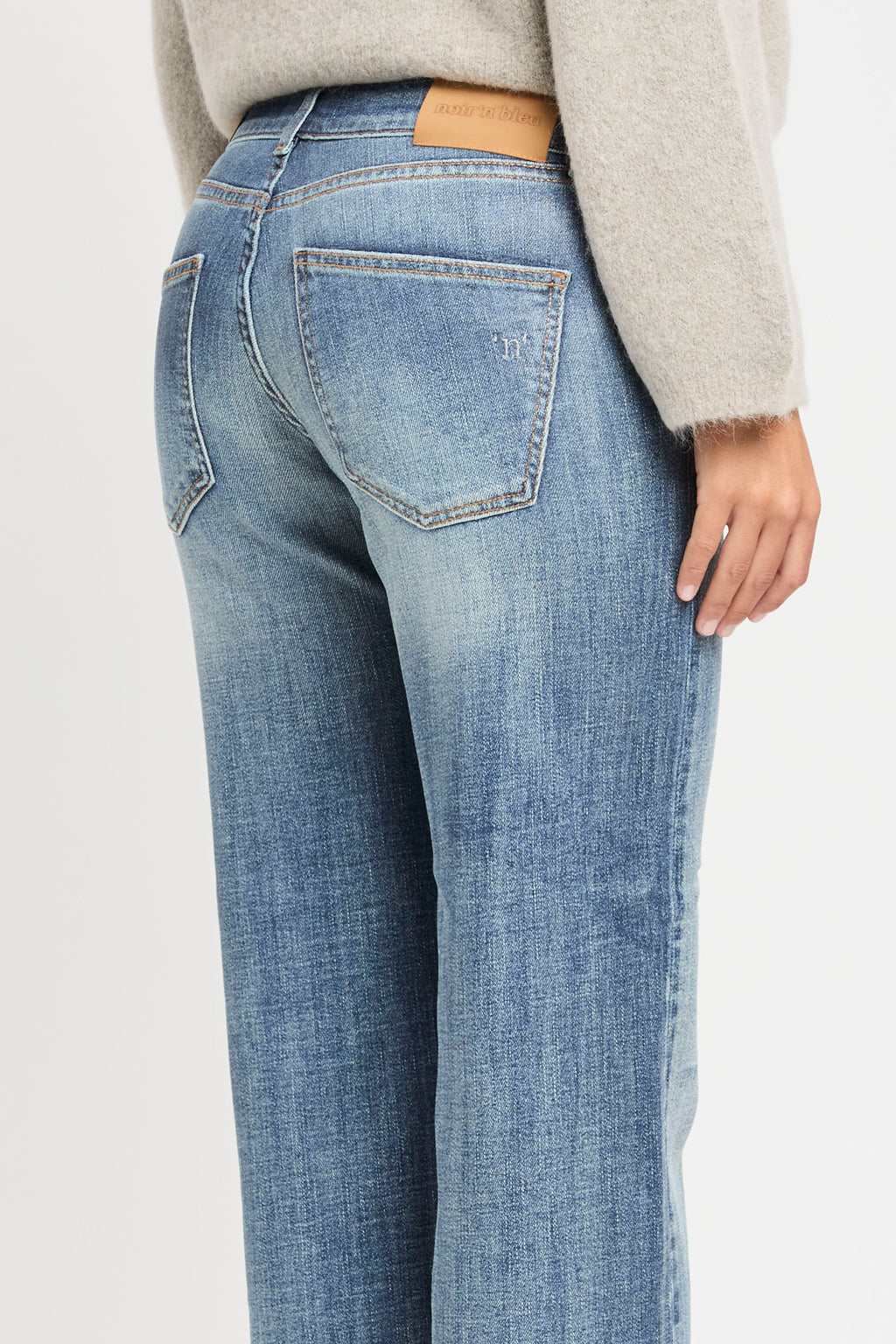 Denim 5 tasche a vita sotto l'ombelico con lavaggio medio/chiaro e leggero effetto gonnato.