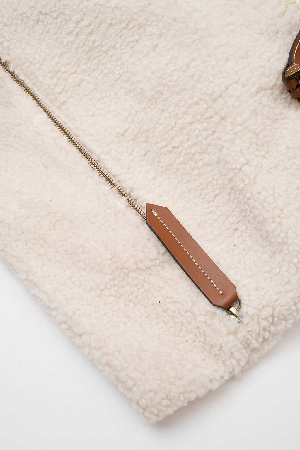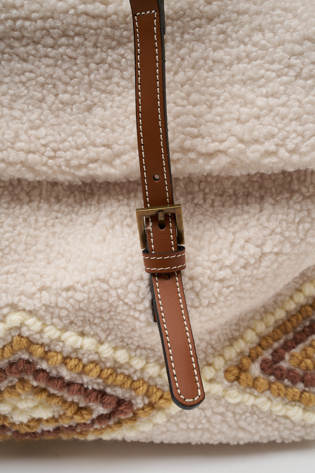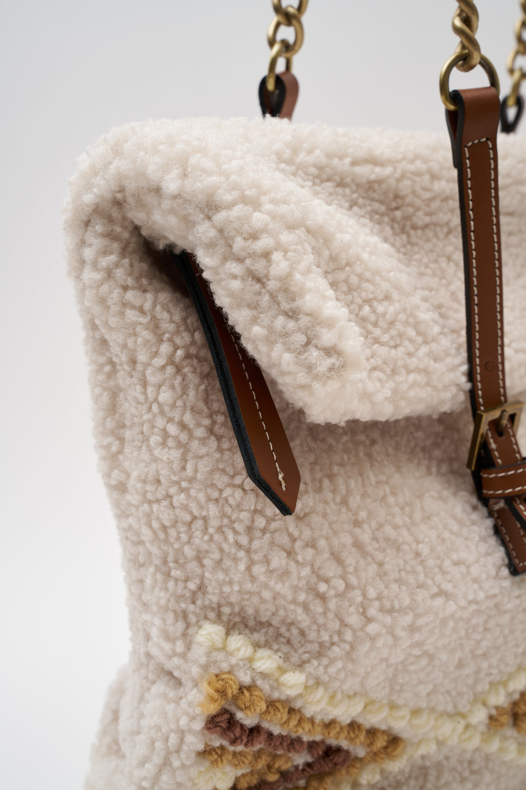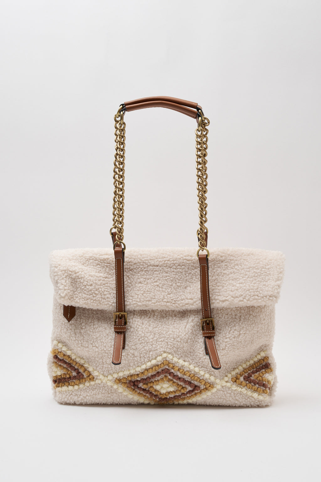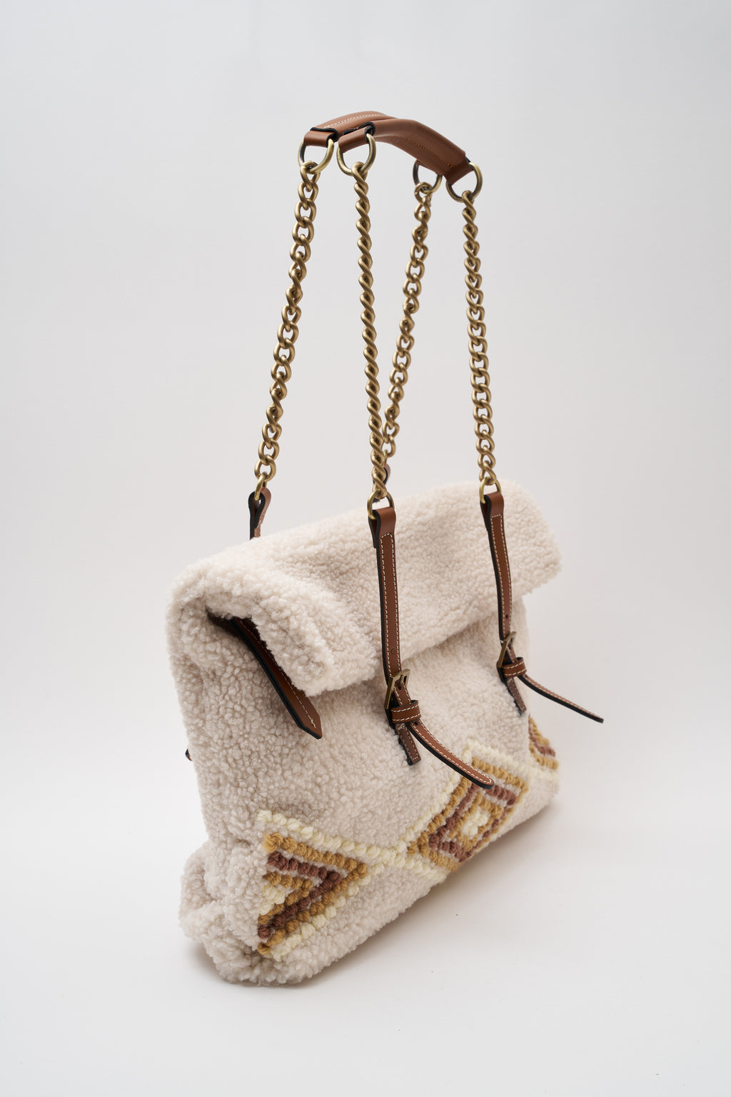 Borsa in eco-montone ricamato con dettagli in pelle, patta richiudibile con zio, tasca interna, manico con catena e pelle.