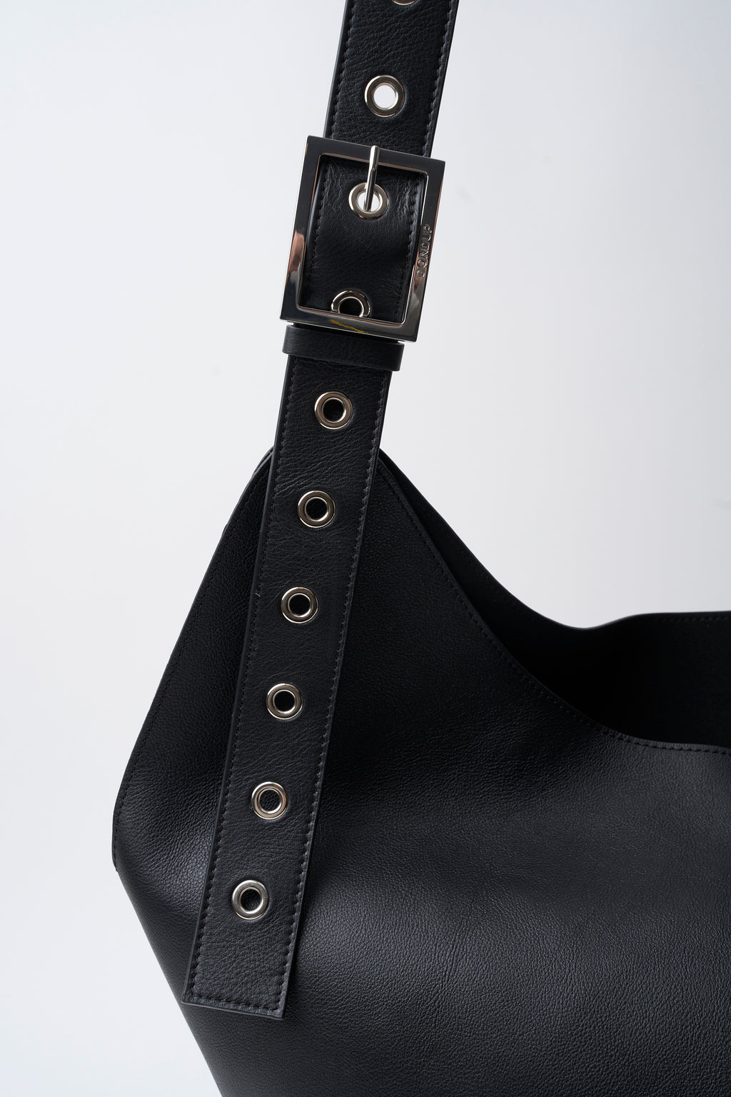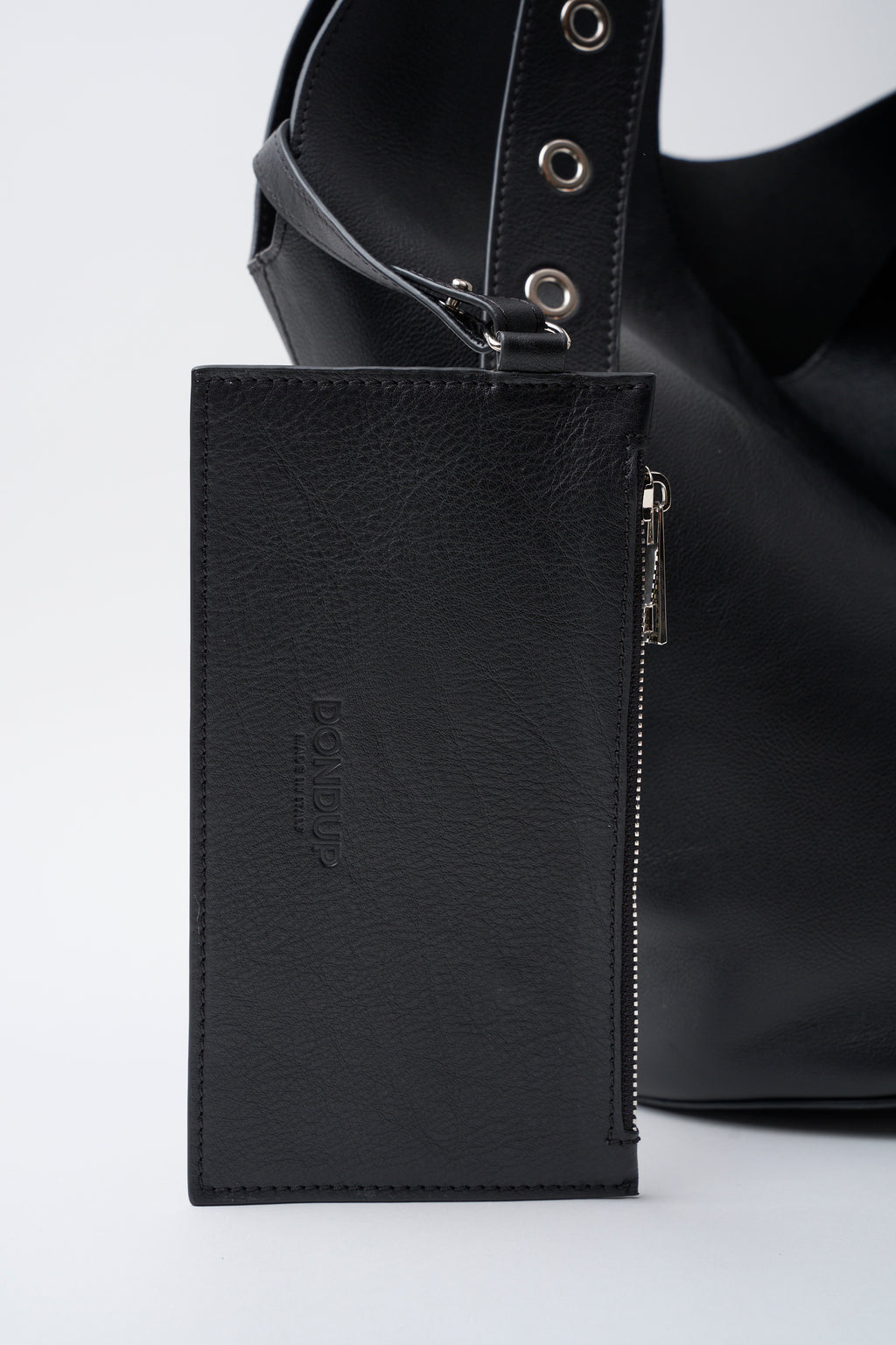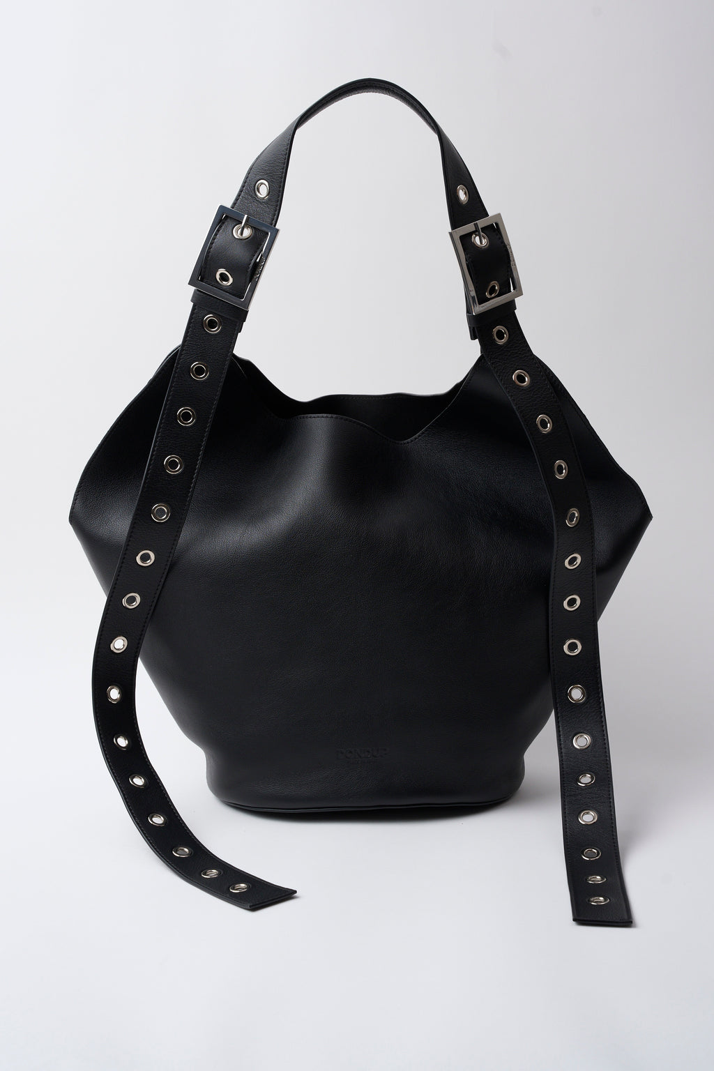 Big hobo con manico singolo regolabile, doppia fibbia logata ed occhielli, logo marchiato a caldo. Clutch interna removibile logata a caldo con chiusura a zip. Pelle. Logo Dondup. Made in Italy