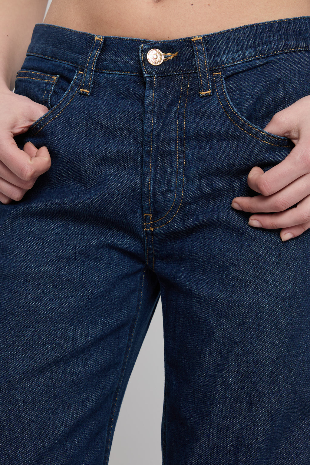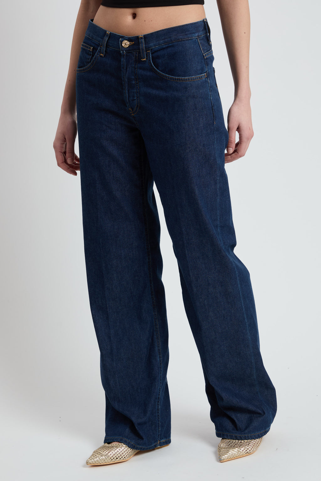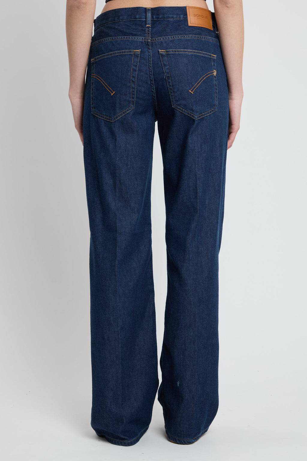 Jeans Jacklyn cinque tasche wide leg fit, vita leggermente bassa, gamba a palazzo. Denim blu 10.50 oz. Lavaggio pulito. Logo Dondup. Made in Italy