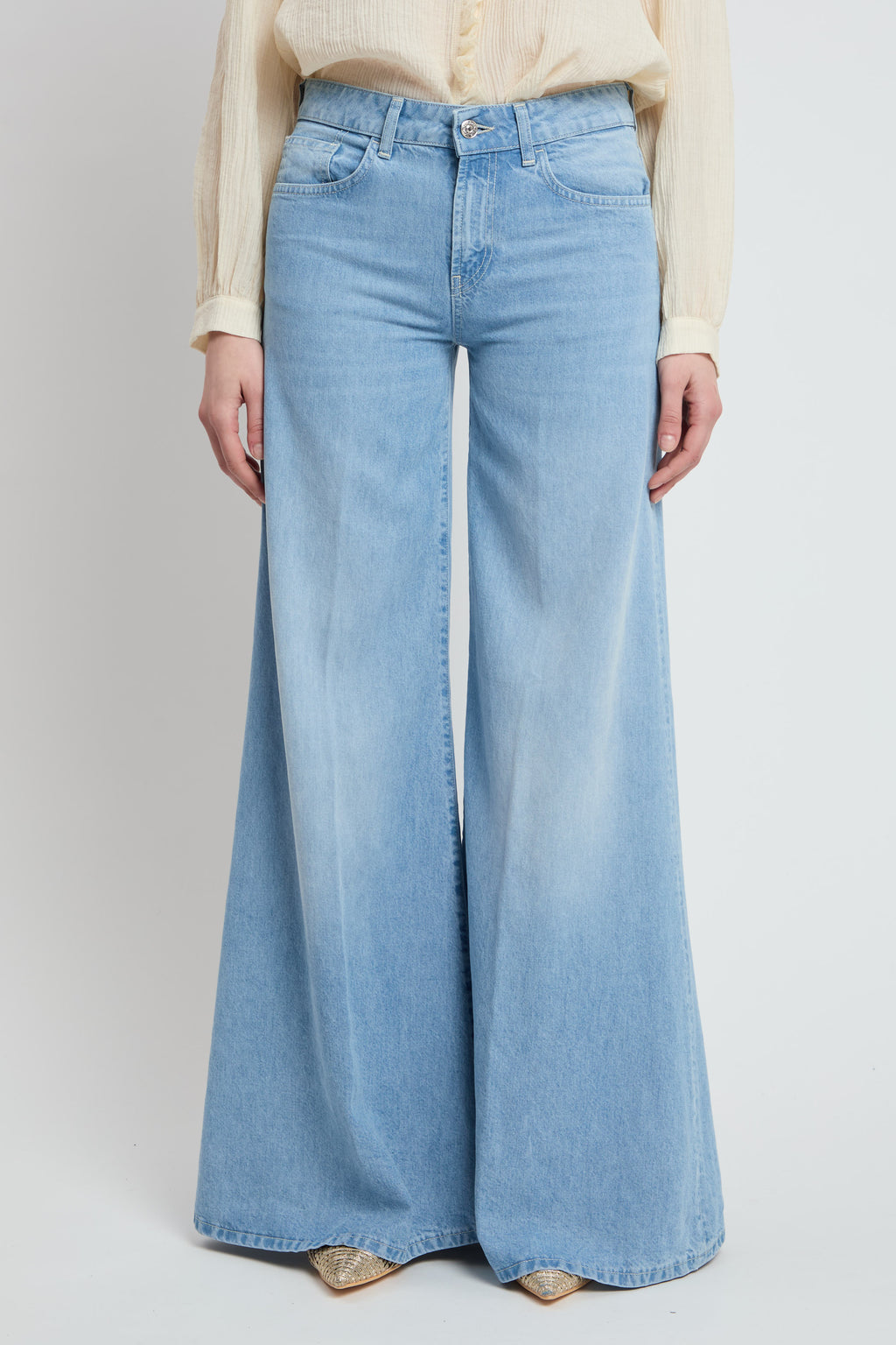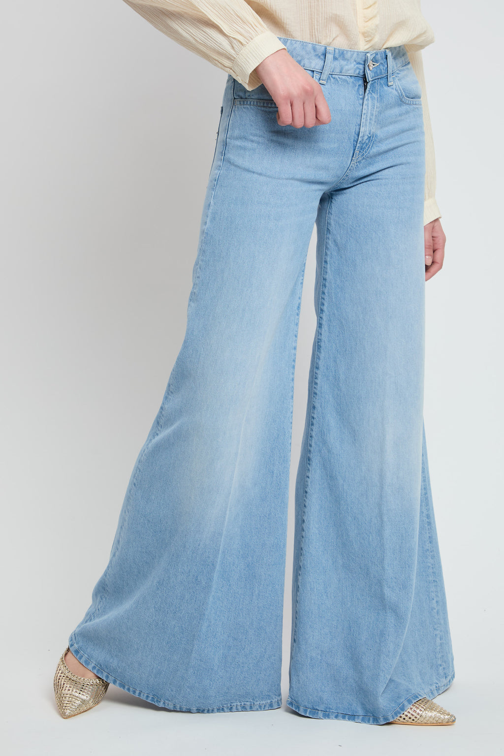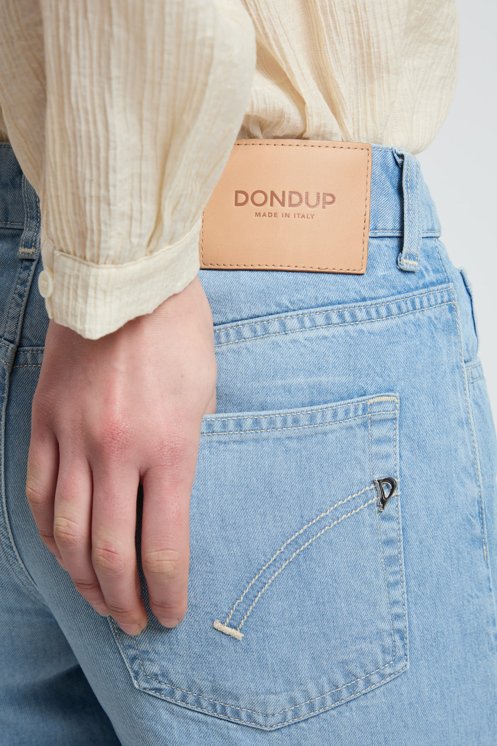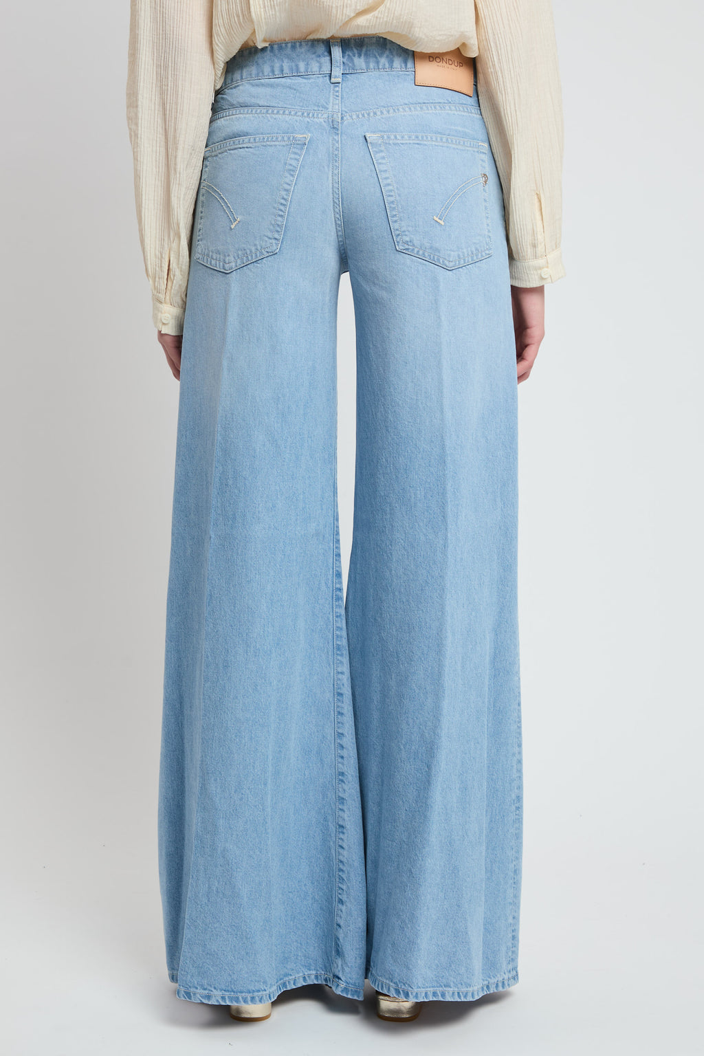 Jeans Marlen cinque tasche wide leg fit, vita regolare, gamba molto ampia. Denim lyocell blu 9 oz. Lavaggio chiaro pulito. Logo Dondup. Made in Italy