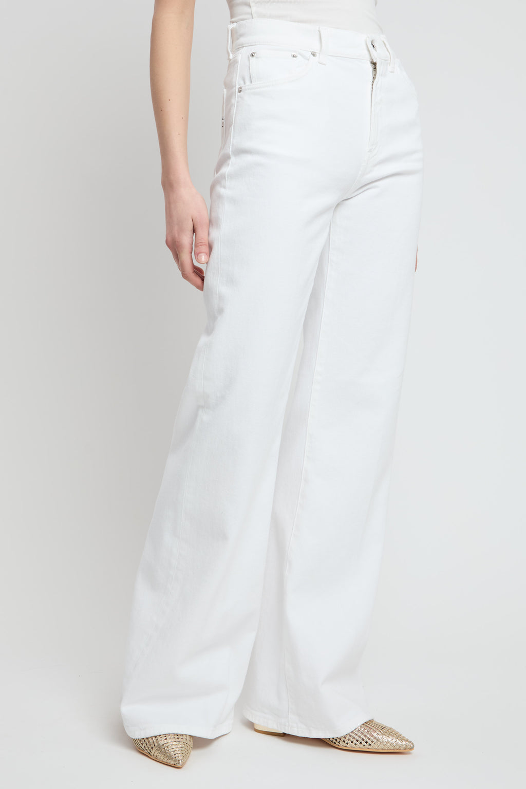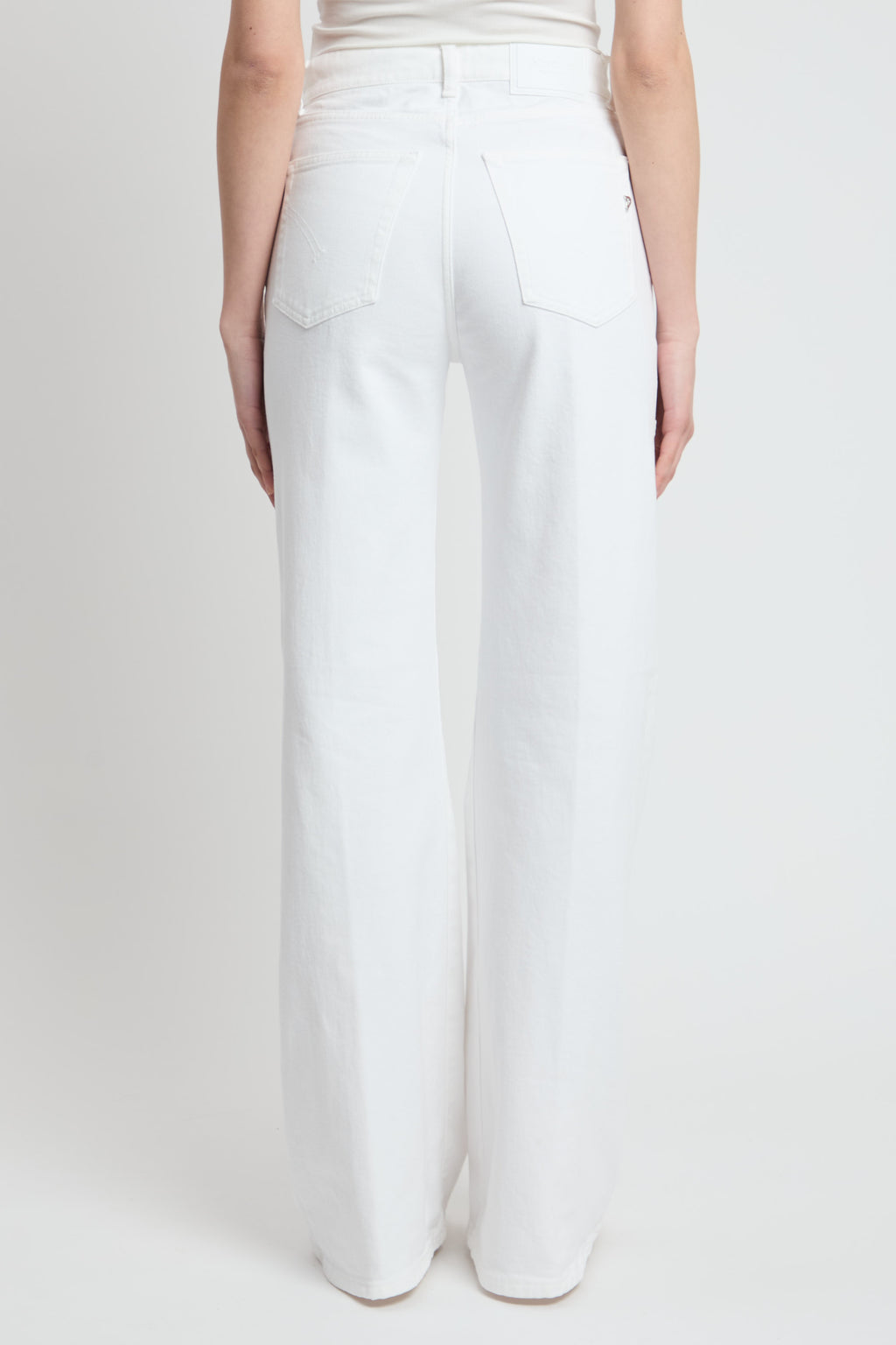 Jeans Amber cinque tasche wide leg fit, vita regolare, gamba ampia. Bull stretch . Tintura in capo bluesign. Logo Dondup. Made in Italy