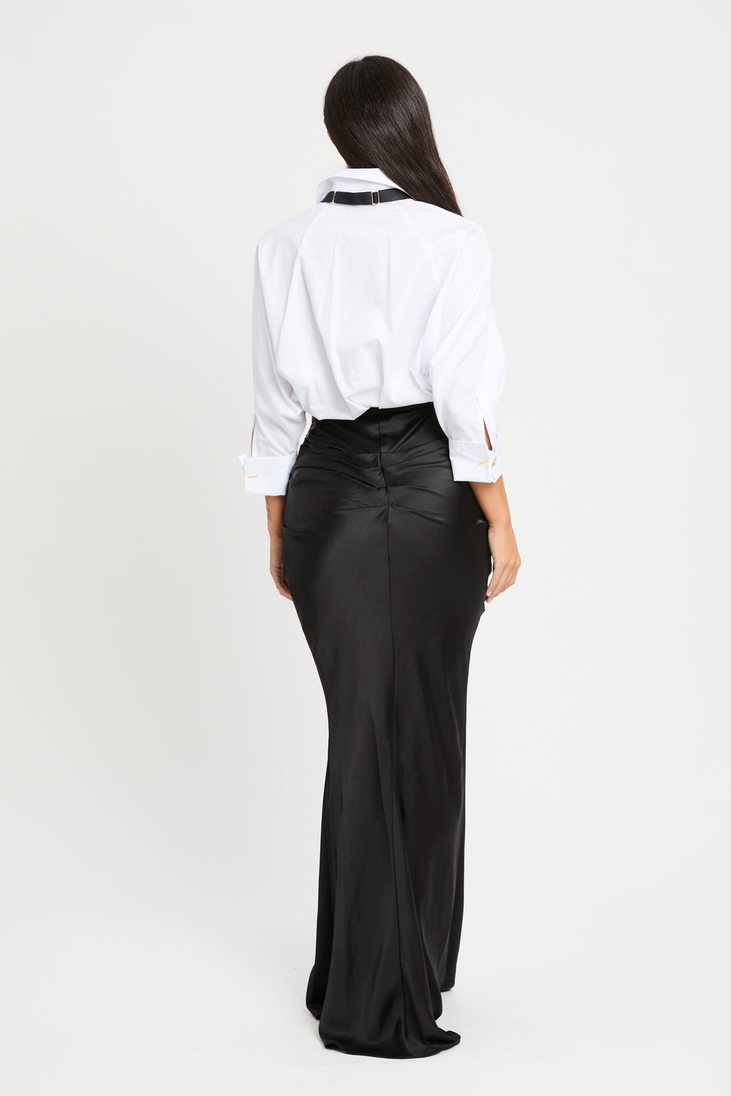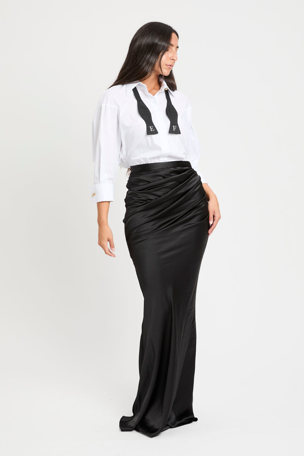 Abito da sera dalla vestibilità slim. Il vestito si distingue per il top con camicia amovibile, realizzato in popeline di cotone e arricchita dal papillon in raso. I gemelli con logo gioiello illuminano i polsi. La gonna in raso ha linea a sirena e regala un andamento sinuoso con raffinati drappeggi in vita.