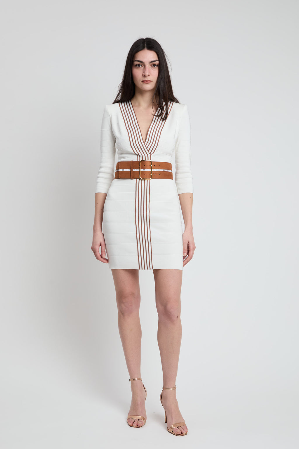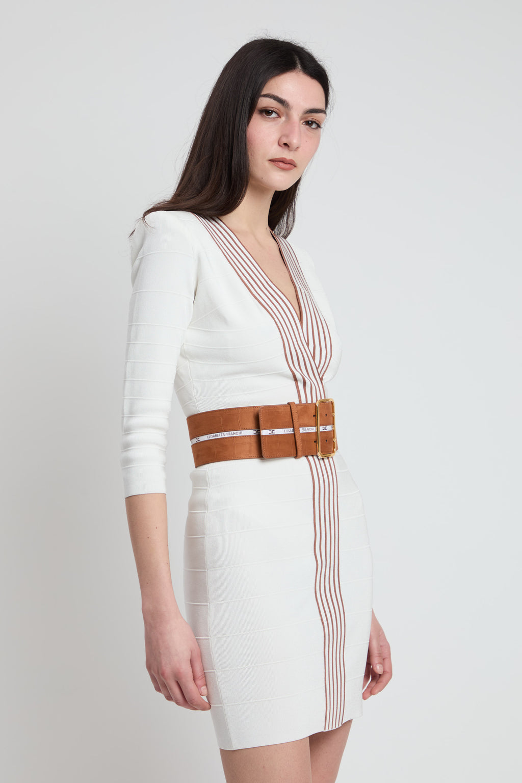 Abito in maglia dalla vestibilità aderente. Il vestito ha maniche ¾ e spalle strutturate per una silhouette geometrica. Si distingue per le bande decorative che incorniciano il busto con righe a contrasto. La lavorazione a costine e le nervature orizzontali rendono la trama vibrante. Cintura alta in vita.