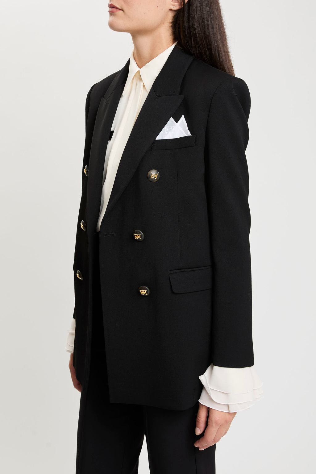 Giacca doppiopetto in gabardina di cotone dalla vestibilità regular. Di ispirazione maschile, il blazer ha spalle strutturate, rever a lancia e taschino con pochette in mussola di cotone ricamata con logo. Dettagli di carattere con la trama diagonale e i bottoni con logo a rilievo.