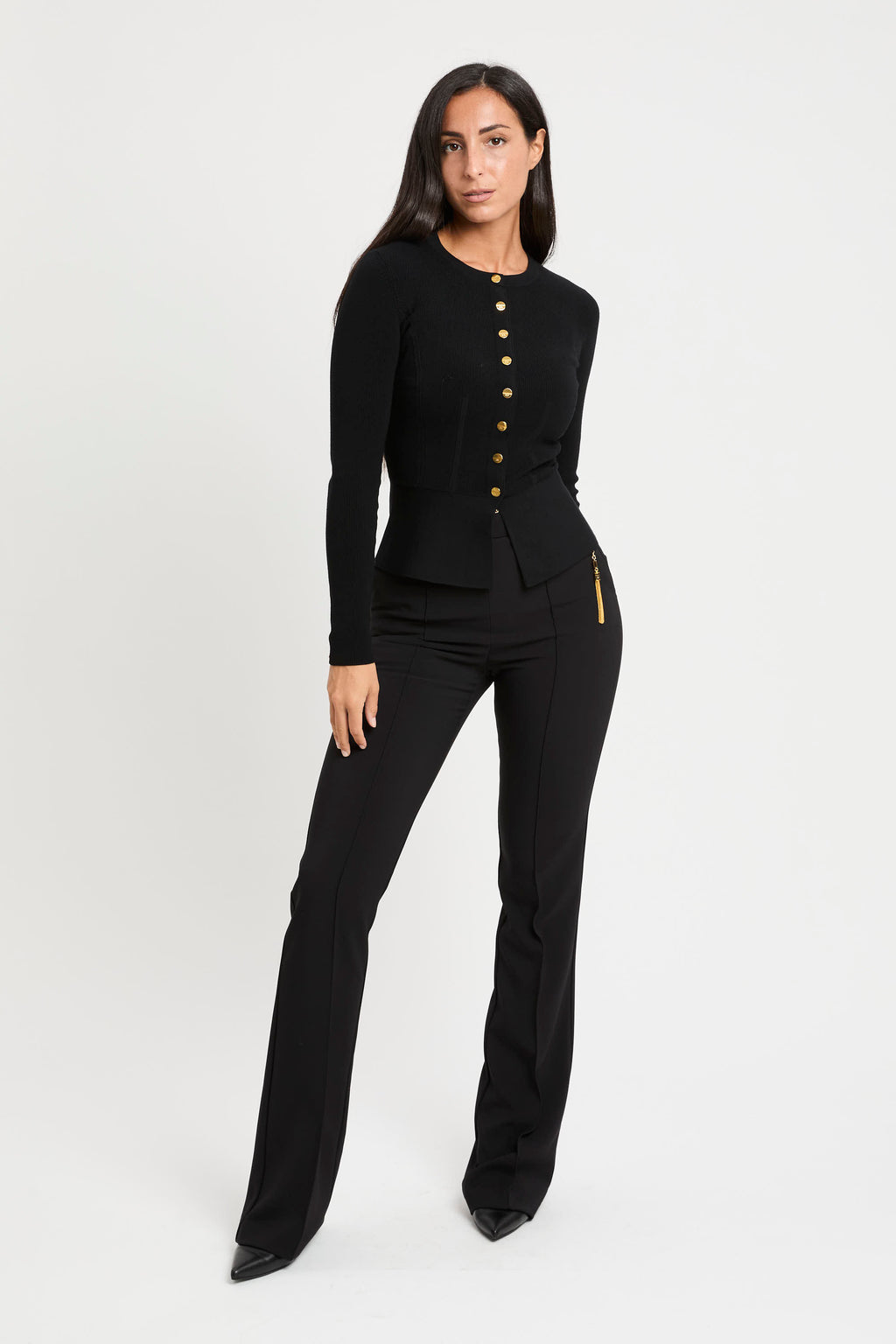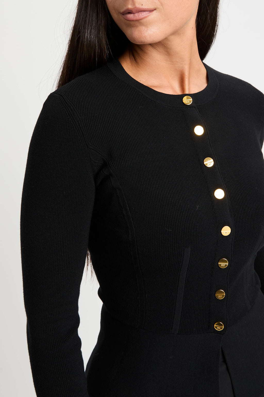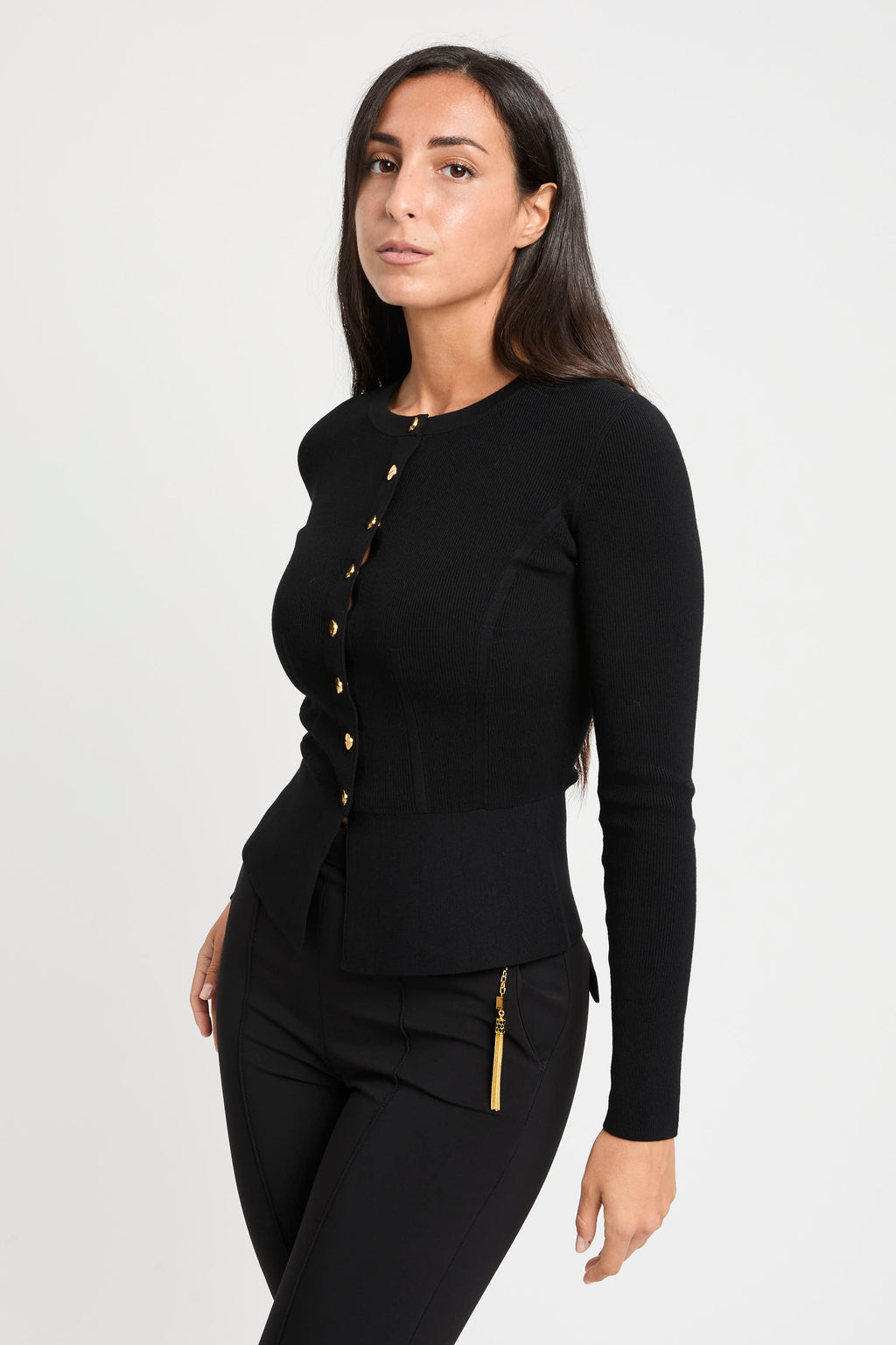 Questa giacca in maglia dalla vestibilità aderente si presenta con spalle strutturate, uno scollo rotondo, dettagli come le nervature e la baschina al fondo che donano una linea definita e armoniosa e una chiusura con bottoni in metallo dorato.