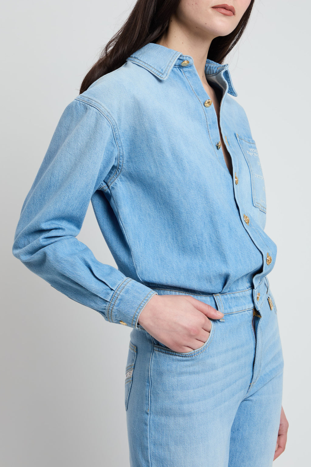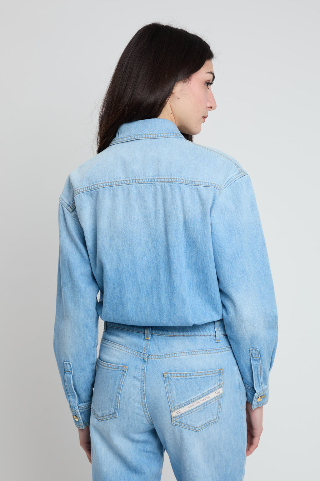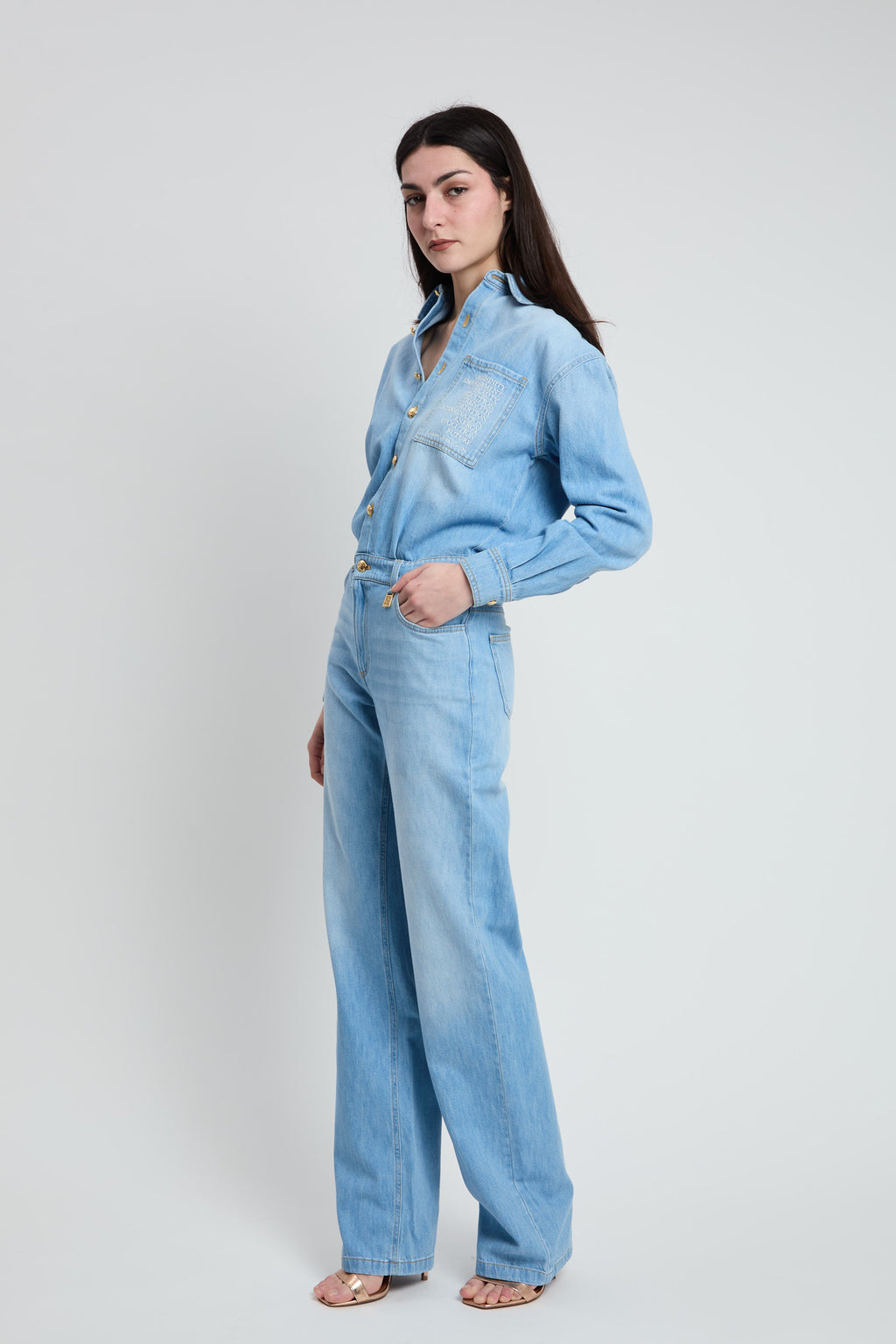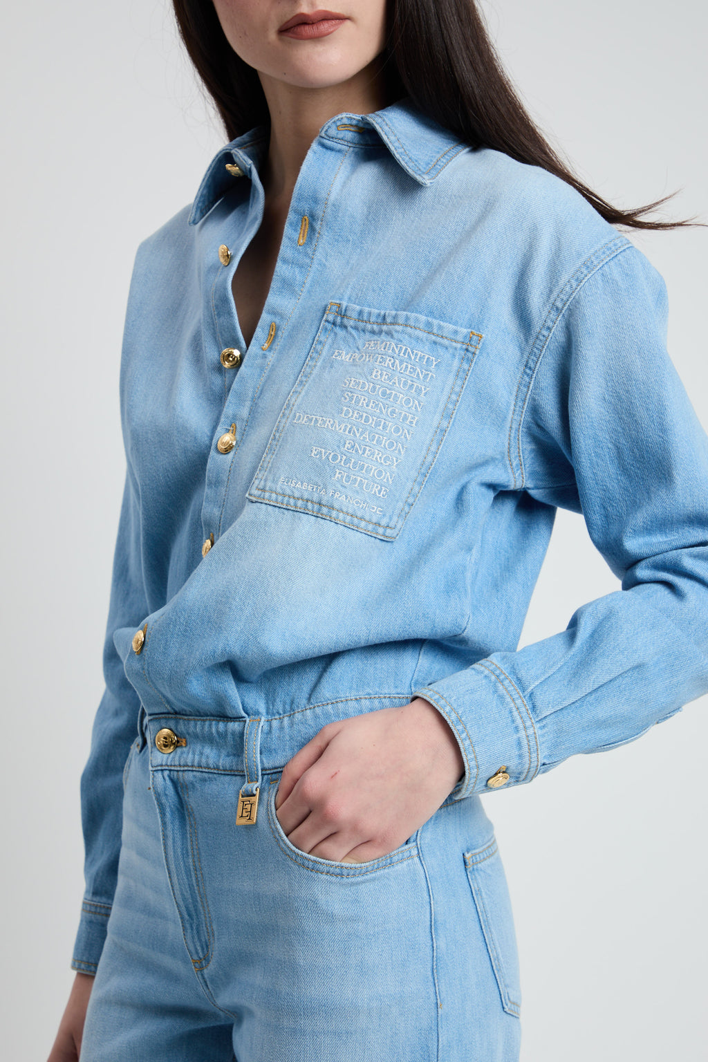 Tuta in denim con maniche lunghe, colletto a camicia e pantaloni cinque tasche. È impreziosita dal lettering sul busto e dal dettaglio con logo in metallo dorato su un passante. Tasche posteriori di cui una personalizzata dal nastro diagonale con logo. Vestibilità over.