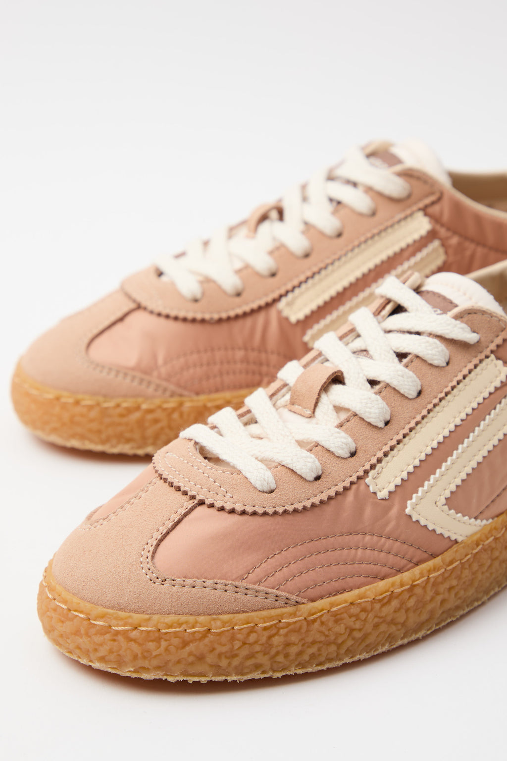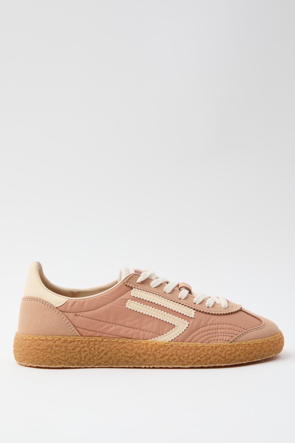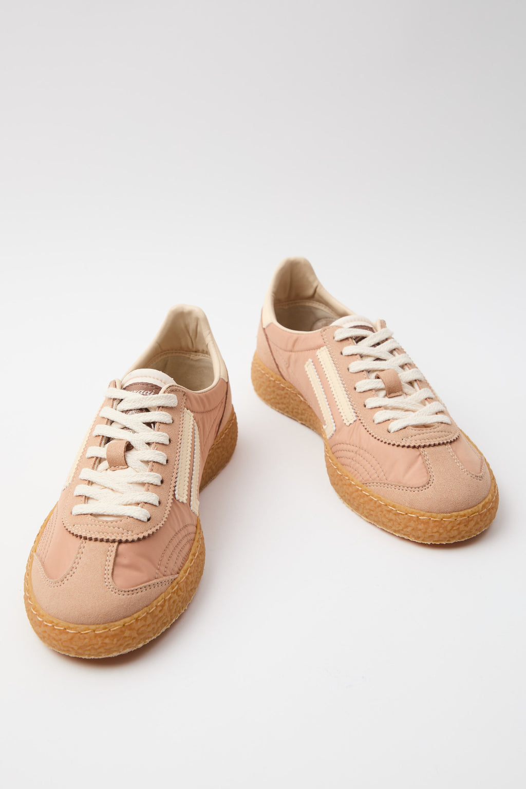 Sneaker in nylon stropicciato rosa antico abbinata a microsuede, impreziosita dal logo e dettagli in panna che catturano la luce. La suola esterna in tonalità ambra conferisce carattere e versatilità, mentre i lacci bianchi completano un design sofisticato e contemporaneo. Un modello che unisce comfort e stile, perfetto per chi cerca una scarpa che sappia distinguersi con eleganza discreta.