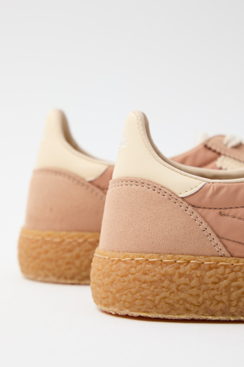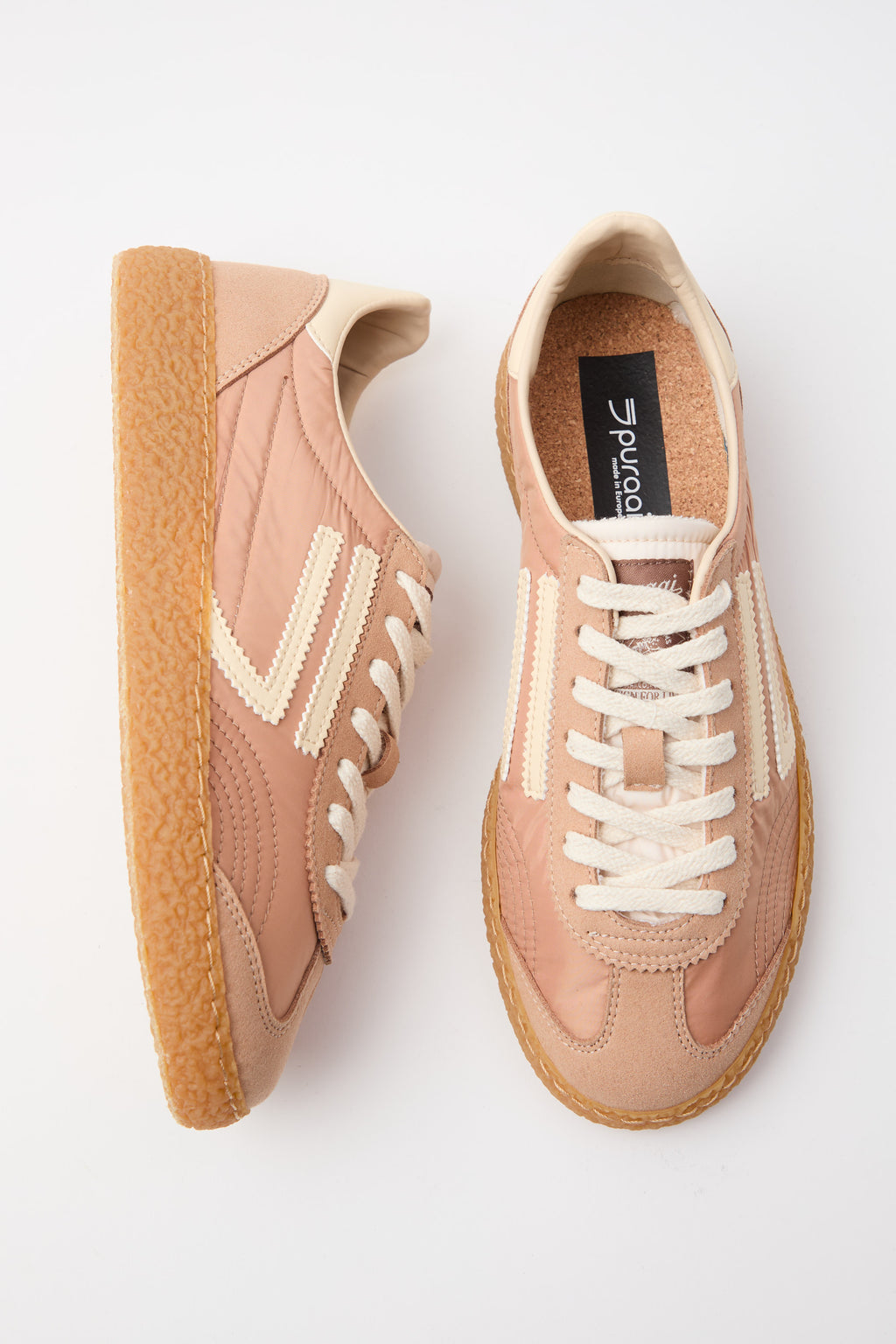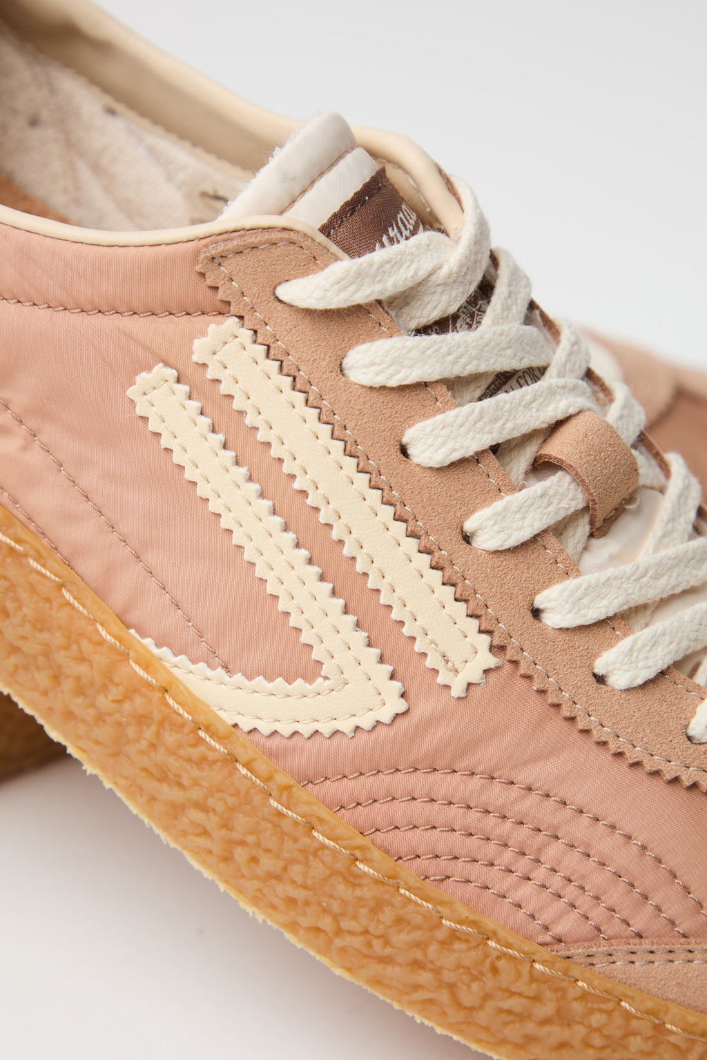 Sneaker in nylon stropicciato rosa antico abbinata a microsuede, impreziosita dal logo e dettagli in panna che catturano la luce. La suola esterna in tonalità ambra conferisce carattere e versatilità, mentre i lacci bianchi completano un design sofisticato e contemporaneo. Un modello che unisce comfort e stile, perfetto per chi cerca una scarpa che sappia distinguersi con eleganza discreta.