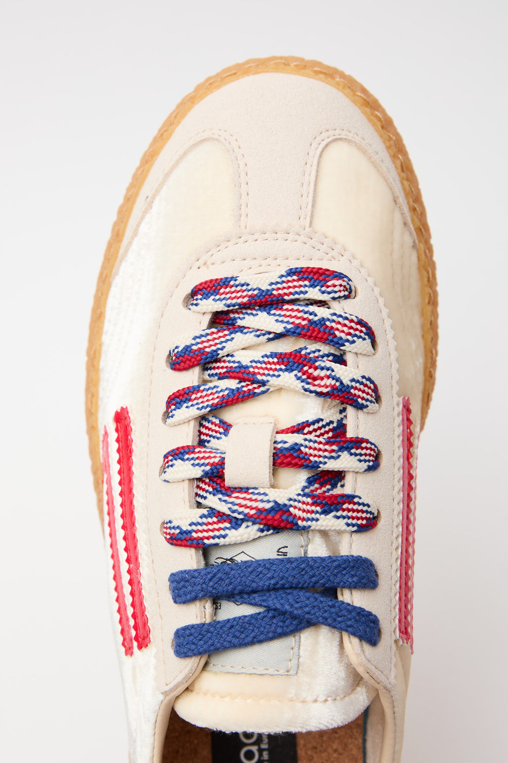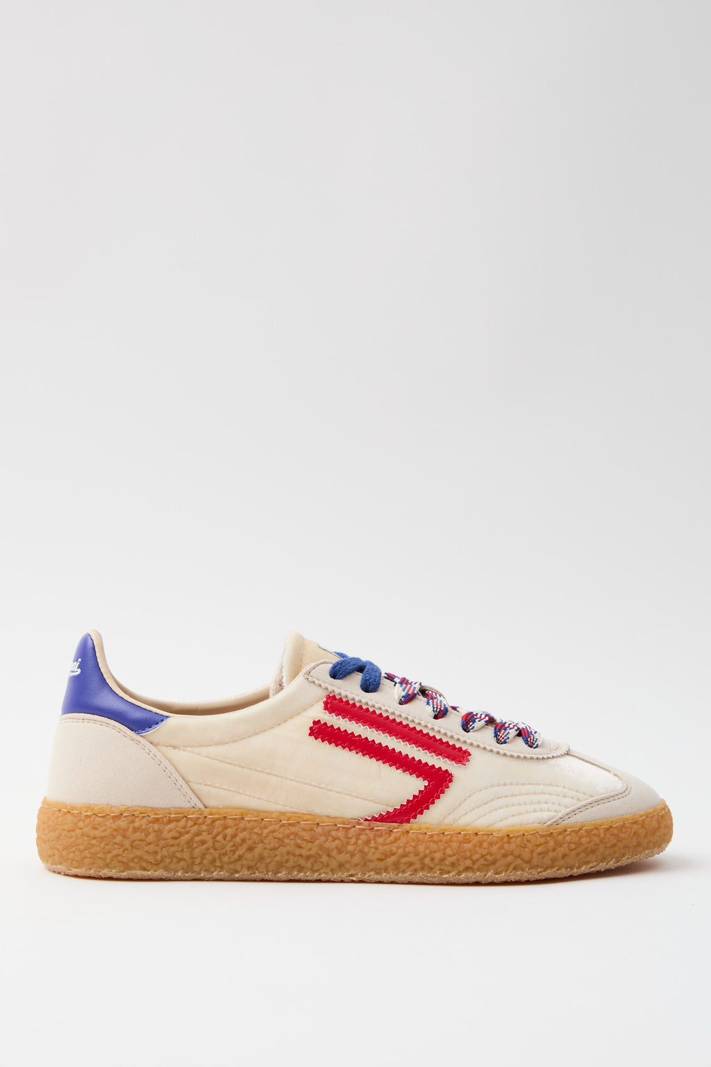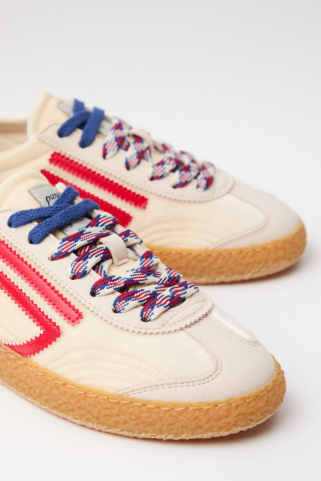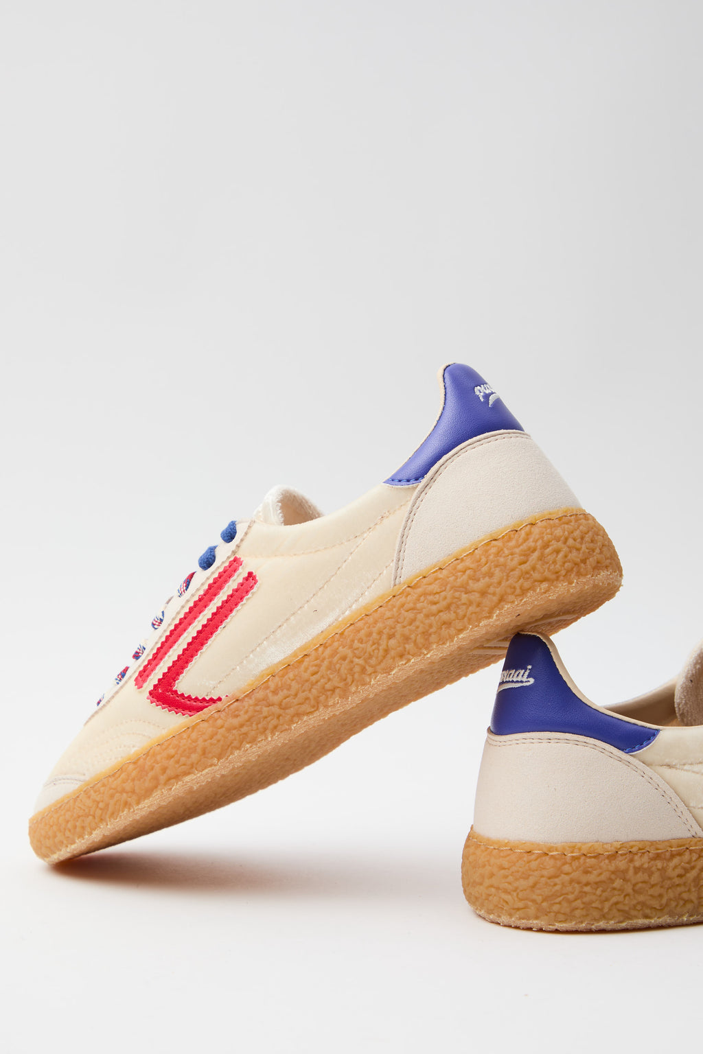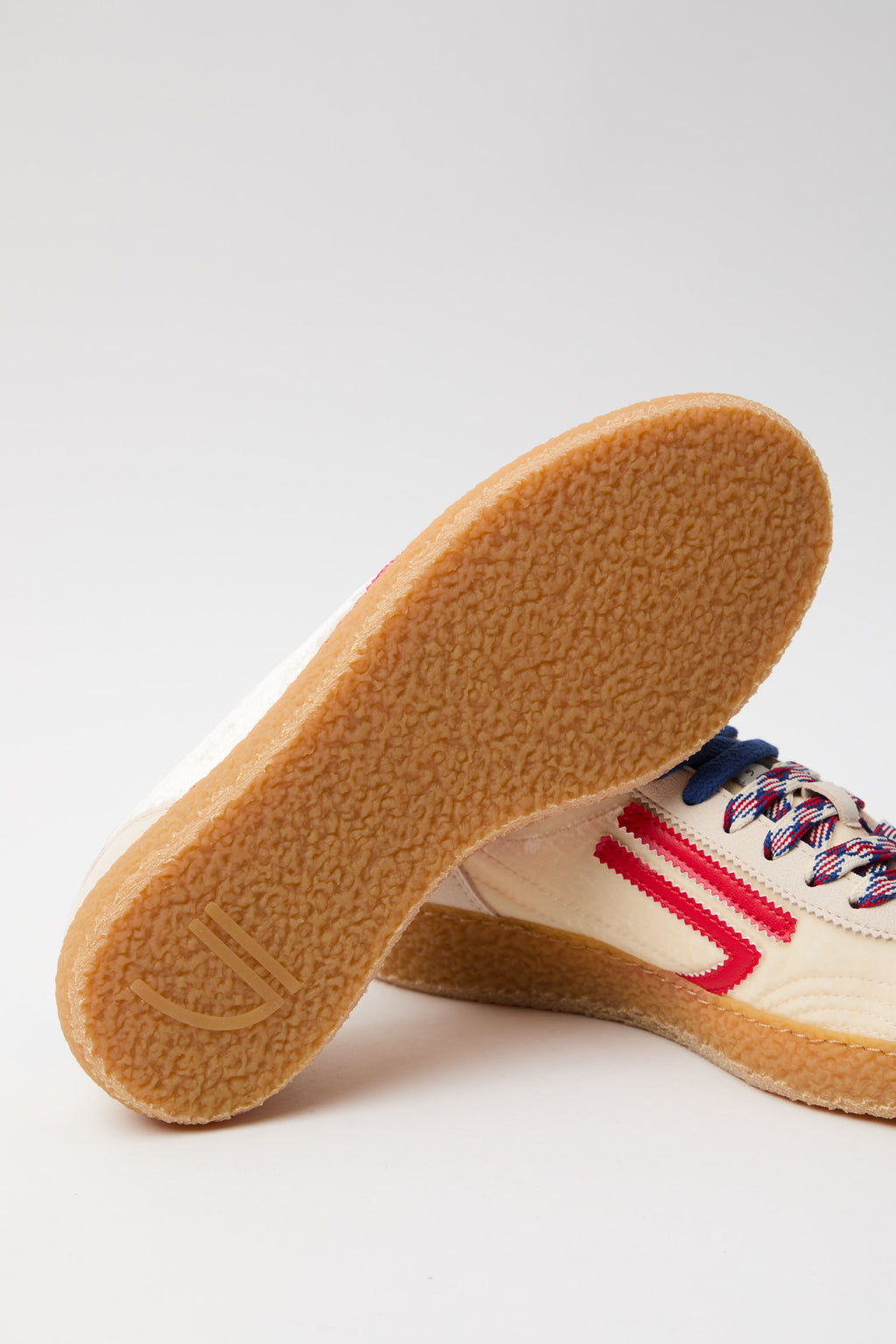 Queste sneaker uniscono eleganza e versatilità con una costruzione raffinata. Il beige chiaro in raso e microsuede crea una base sofisticata, mentre gli accenti rossi e blu aggiungono carattere distintivo. La suola ambra conferisce calore al design, perfettamente completata dai lacci bianco-rossi che catturano l'attenzione. Ideali per chi ricerca una scarpa che bilancia stile contemporaneo e comfort quotidiano.