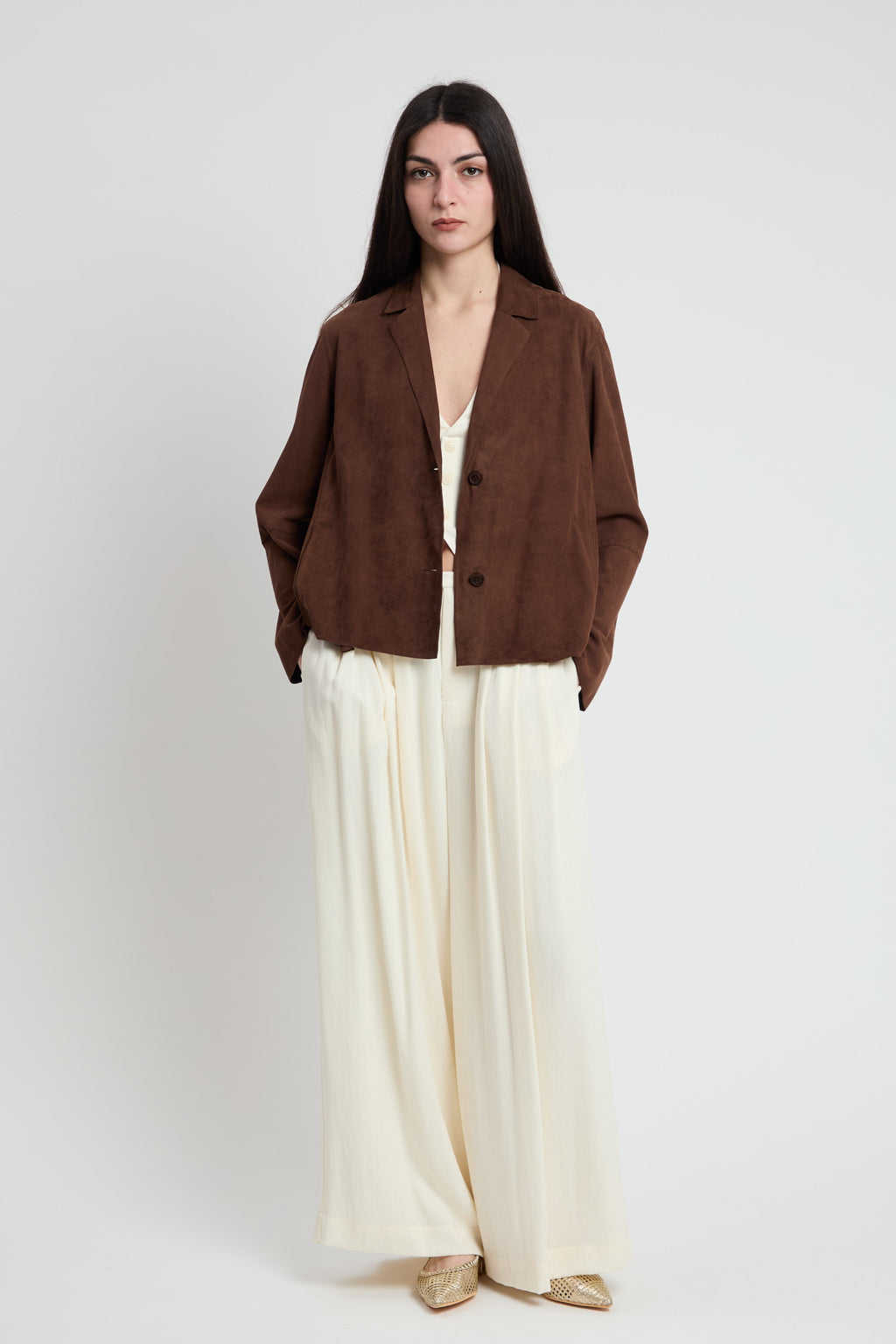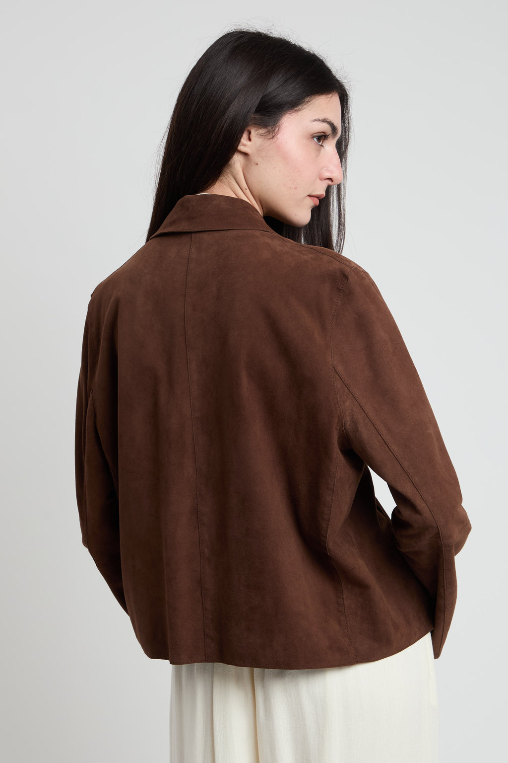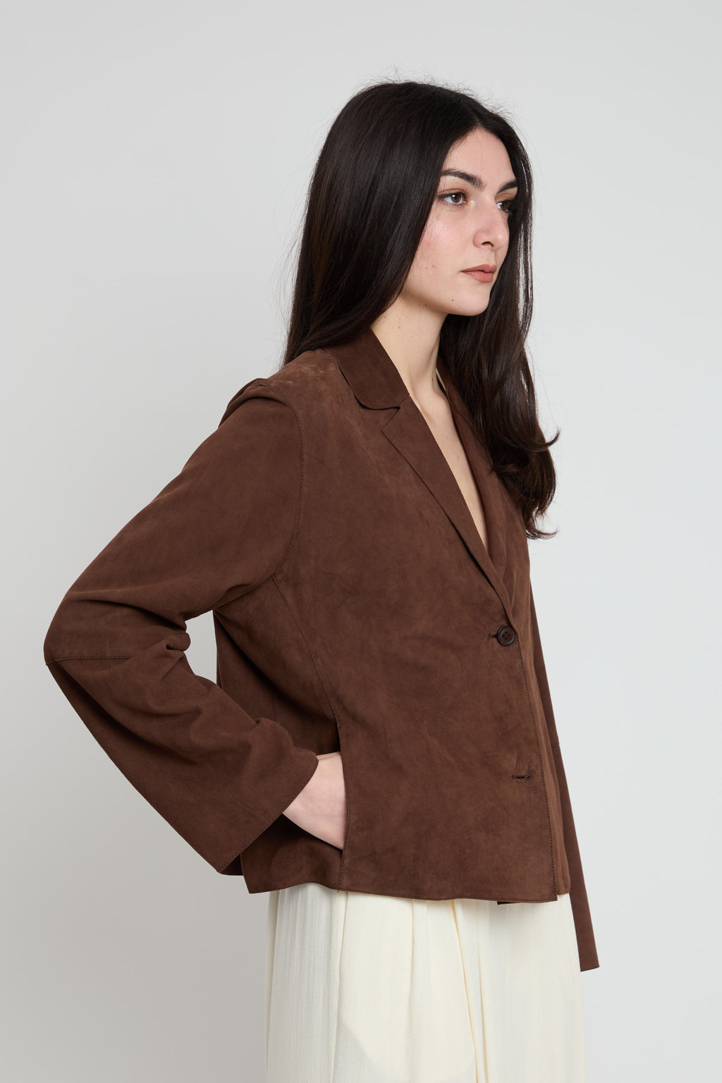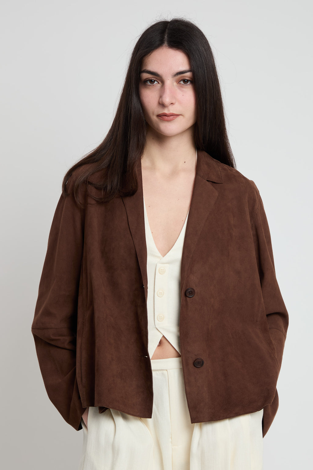 Giacchina leggera in pelle scamosciata dal taglio squadrato e moderno. Realizzata in cuoio naturale, offre morbidezza e durabilità nel tempo. Chiusura pratica a due bottoni per un indosso facile e sicuro. La vestibilità comoda la rende perfetta per un look casual elegante, adatta a molteplici occasioni. Un capo versatile che combina stile e funzionalità.