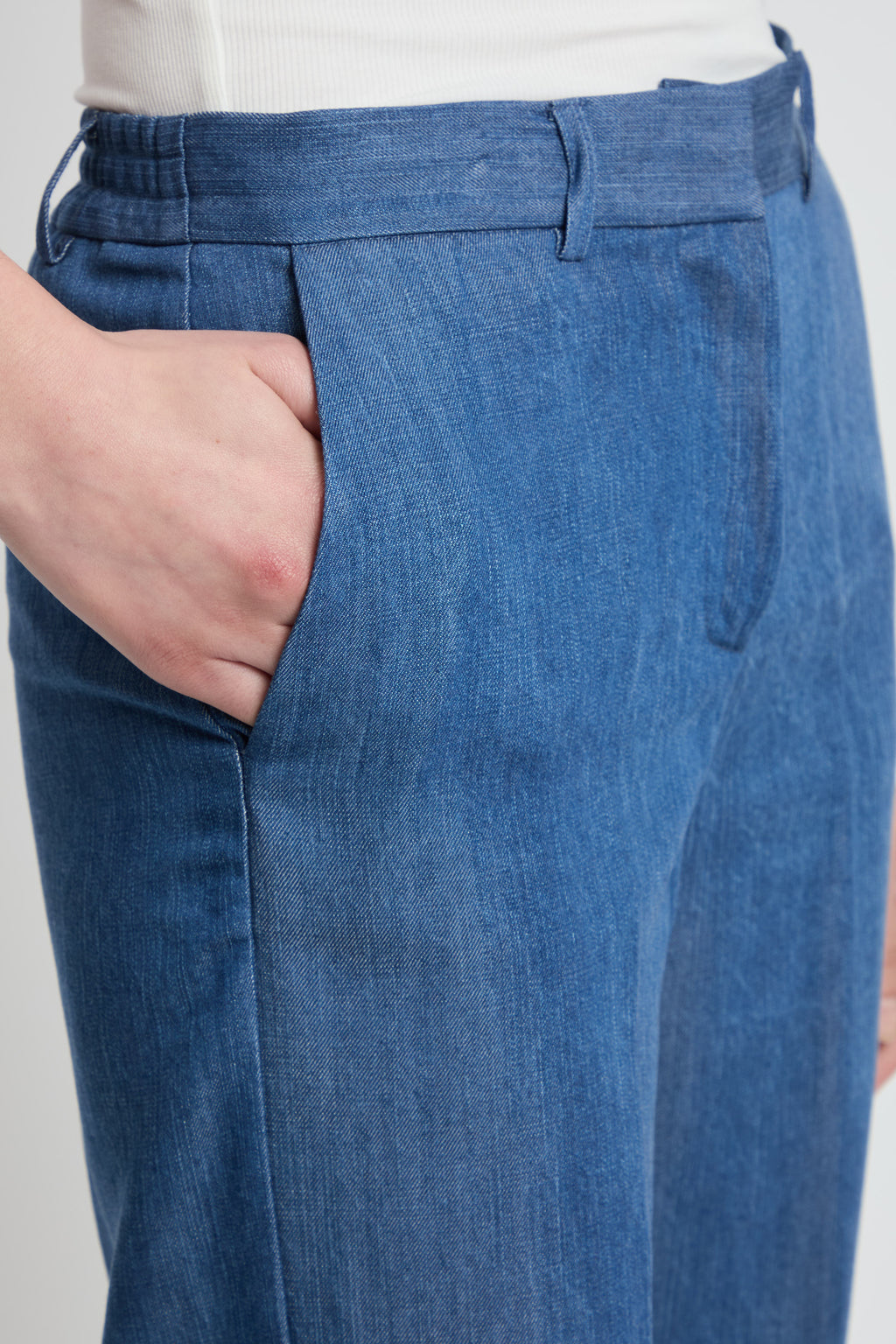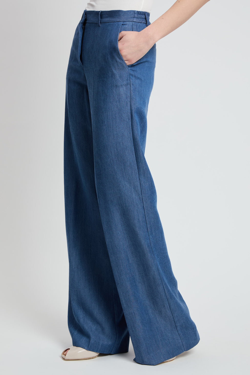 Pantaloni a palazzo con elastico sul fascione sul retro, tasche ai lati e doppia tasca a filetto sul retro.