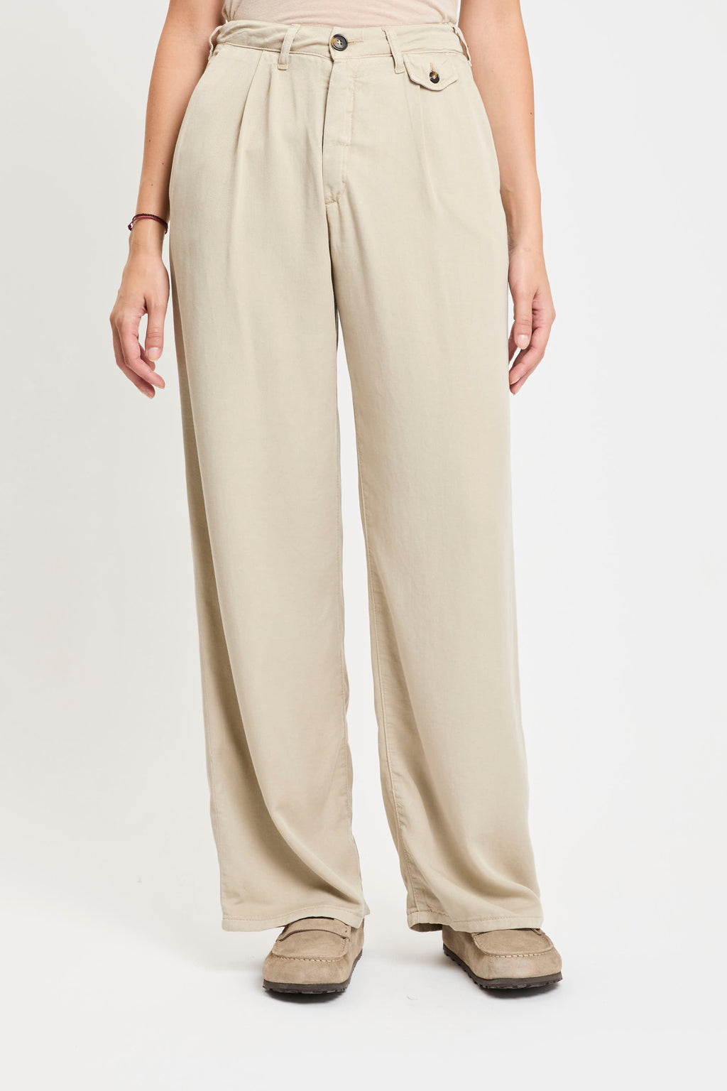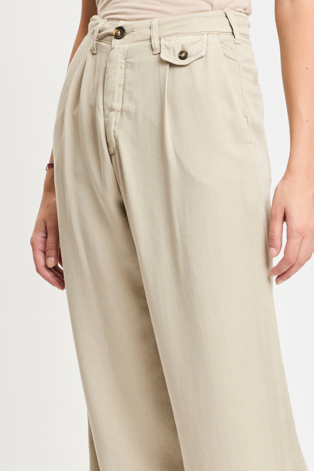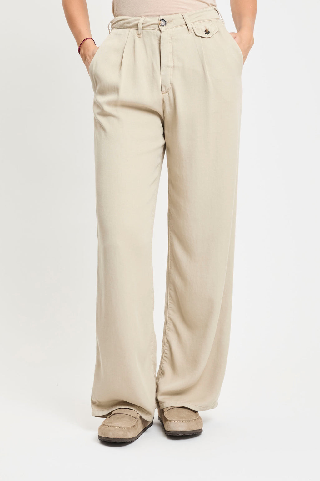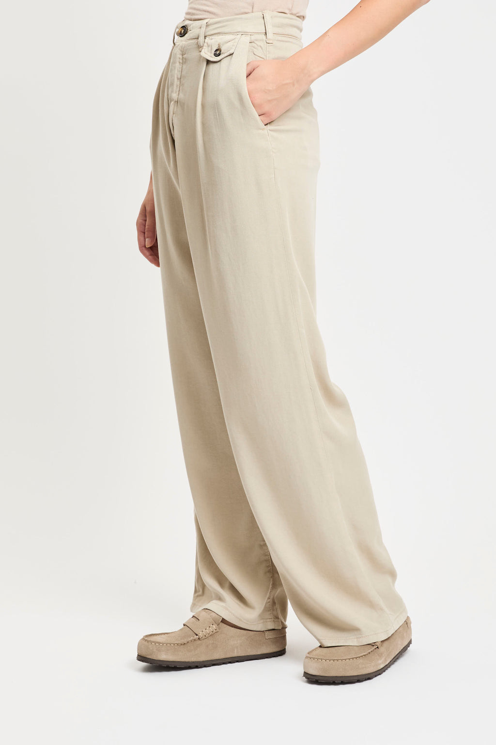 Pantaloni in tessuto leggero color beige, caratterizzati da vita alta con passanti per cintura e pinces frontali che donano un tocco di eleganza al modello. Presentano tasche laterali oblique e una piccola pattina con bottone sul lato destro. La gamba è dritta e ampia, cadendo morbida fino alla caviglia per un effetto fluido e rilassato.