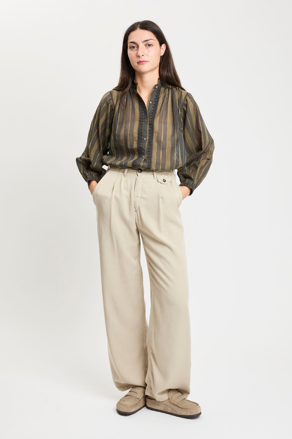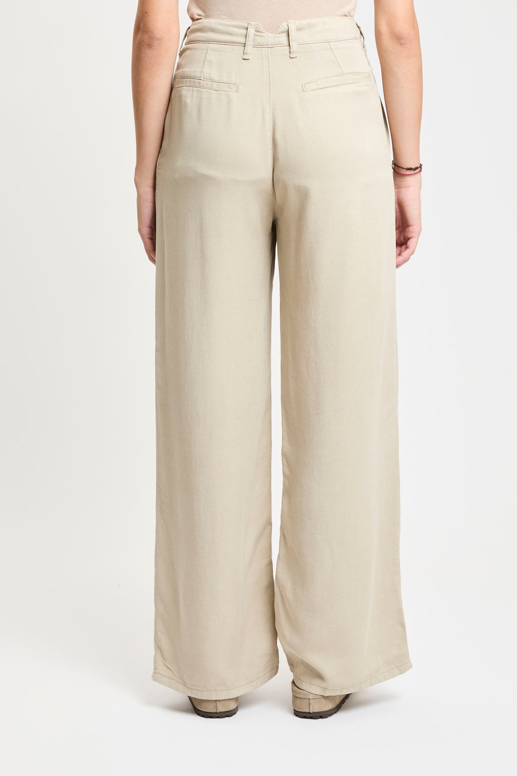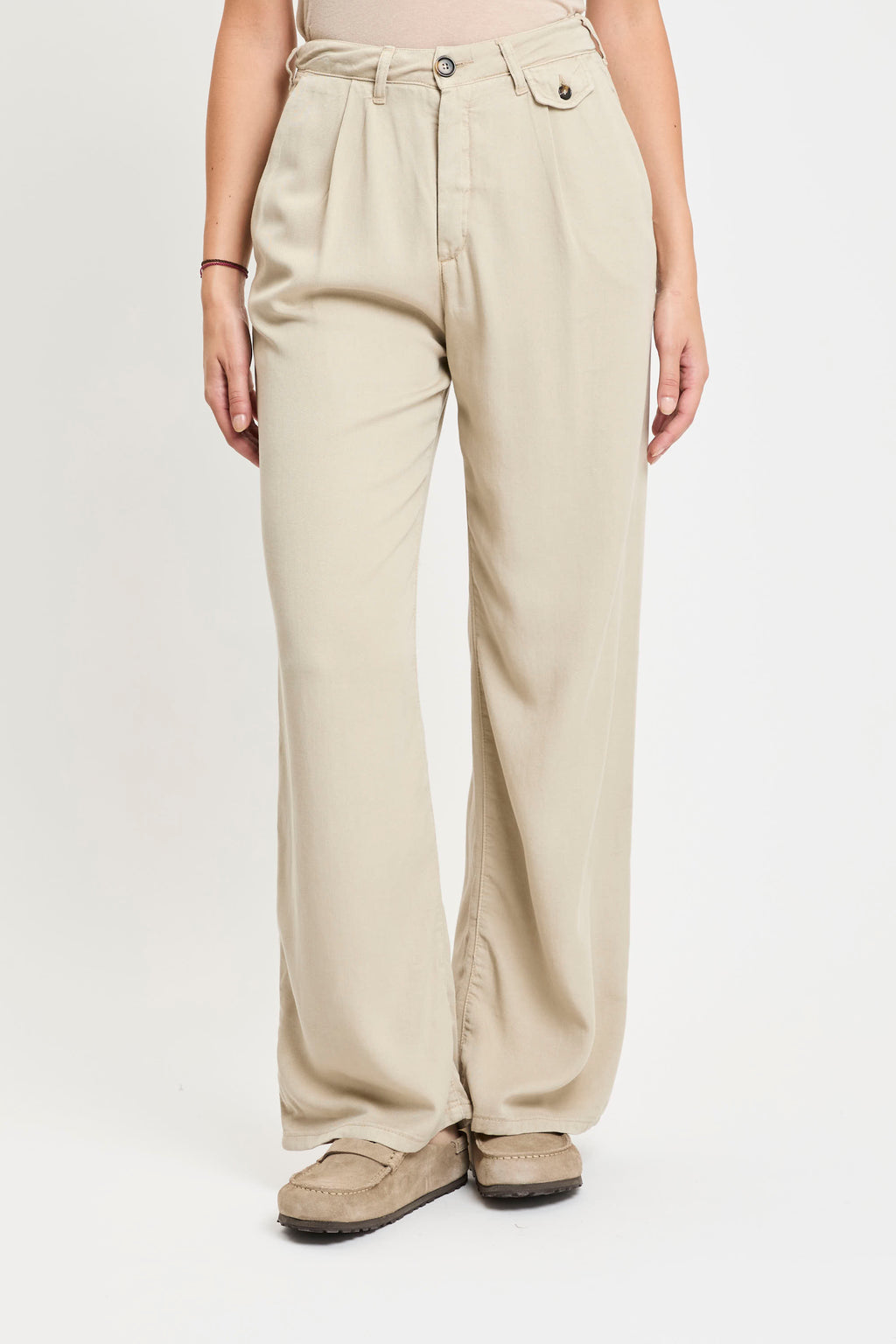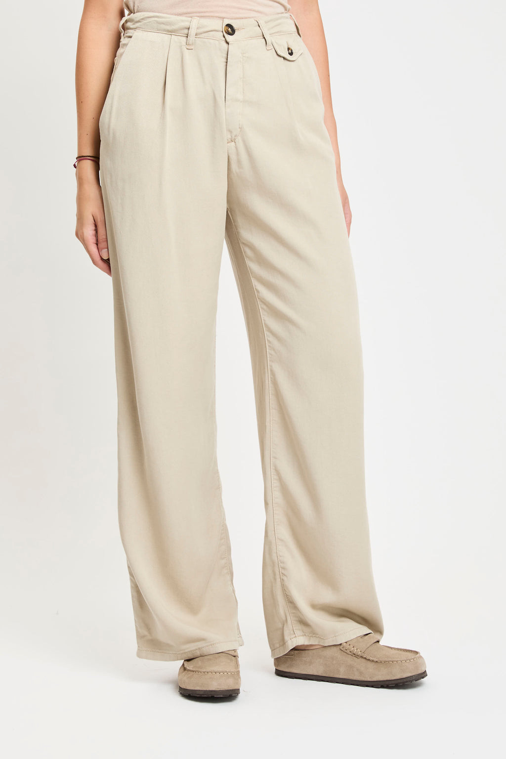 Pantaloni in tessuto leggero color beige, caratterizzati da vita alta con passanti per cintura e pinces frontali che donano un tocco di eleganza al modello. Presentano tasche laterali oblique e una piccola pattina con bottone sul lato destro. La gamba è dritta e ampia, cadendo morbida fino alla caviglia per un effetto fluido e rilassato.
