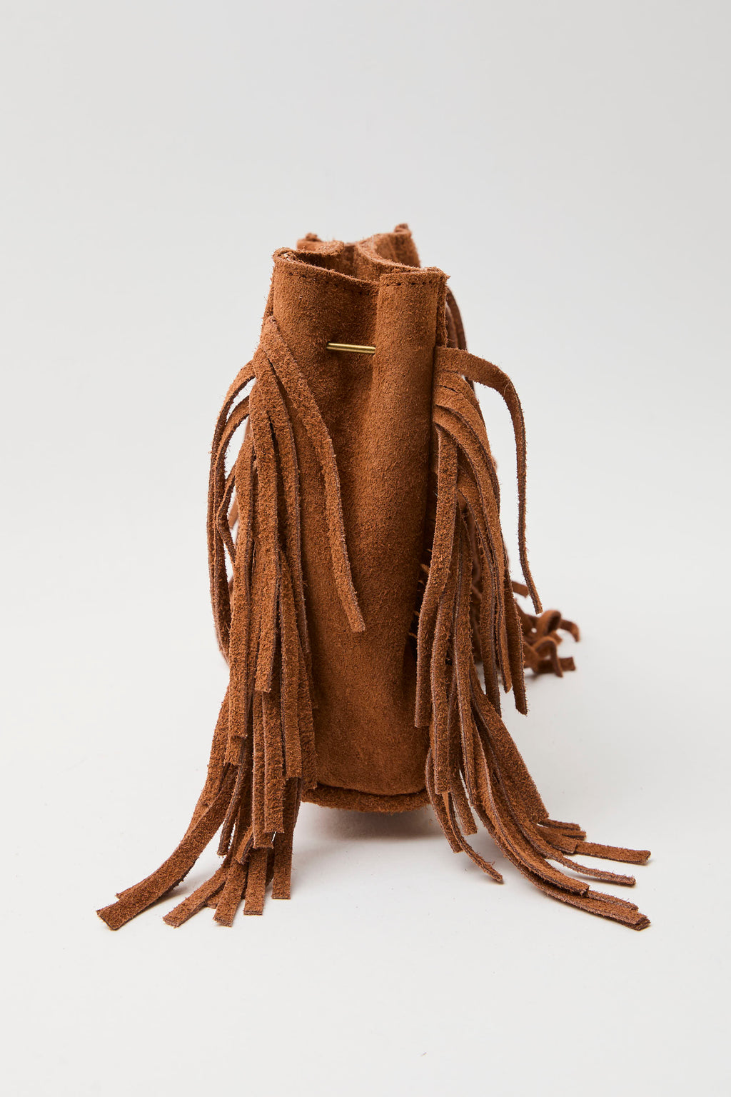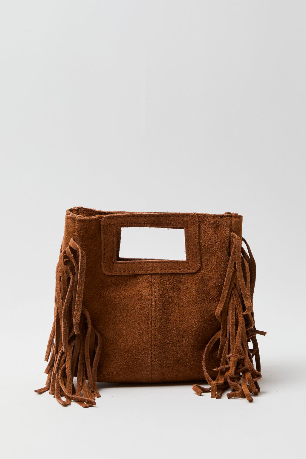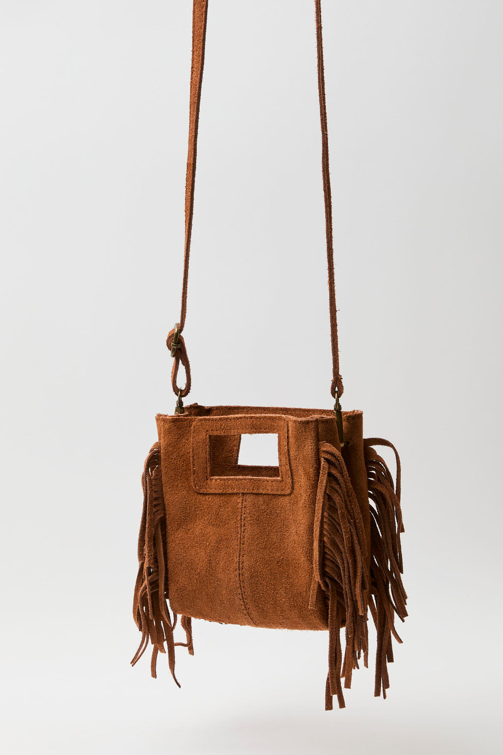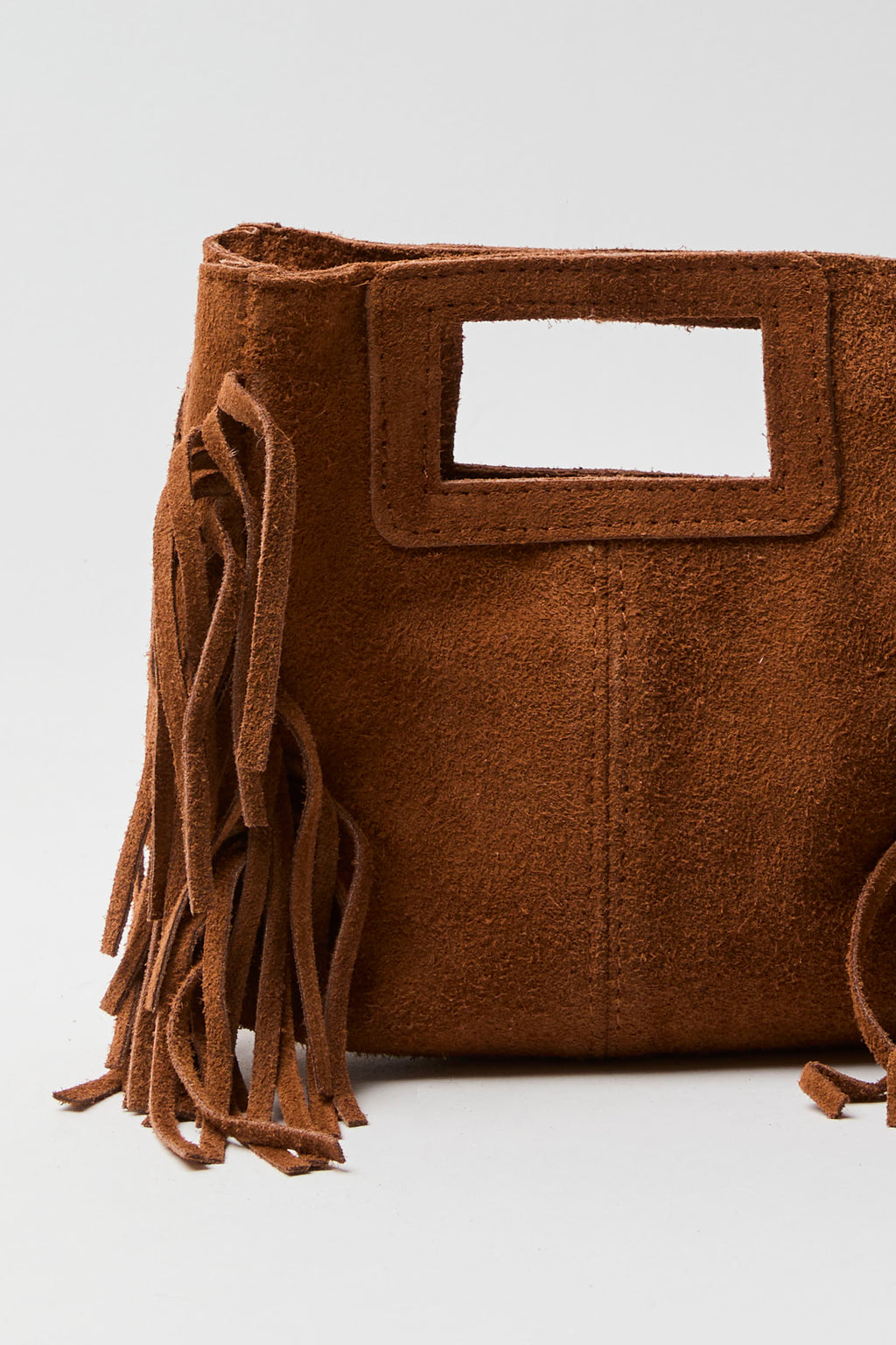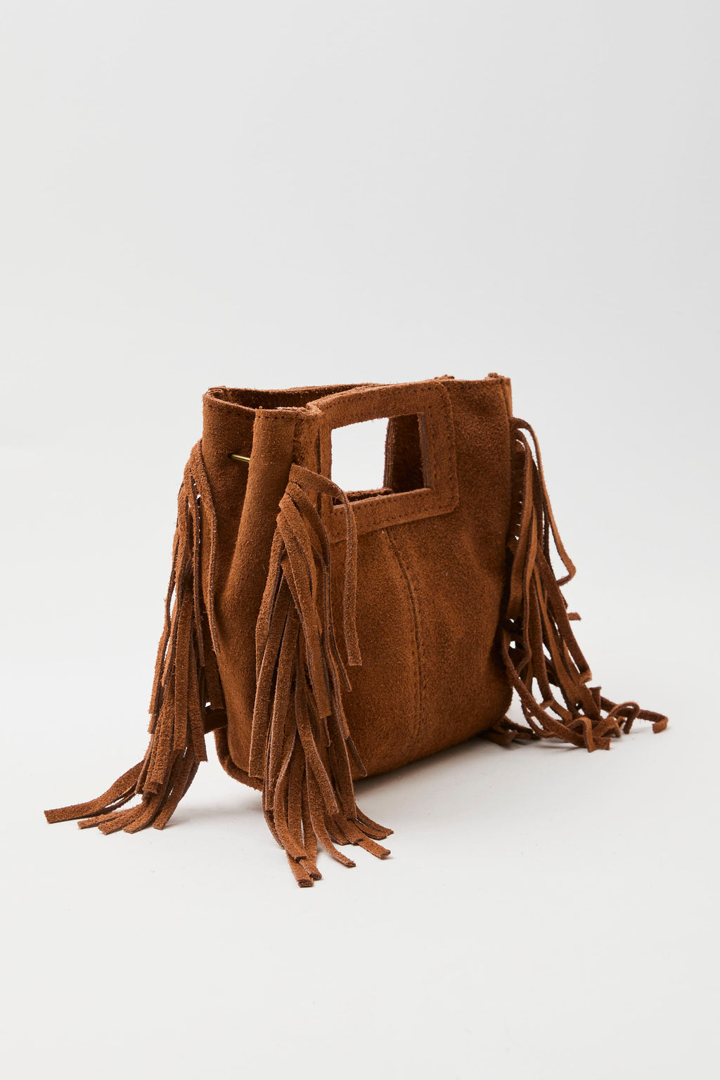 Borsa in pelle con tracolla, motivo frange sui lati.