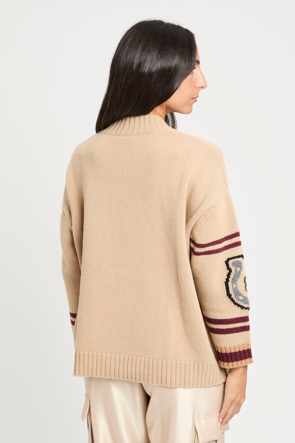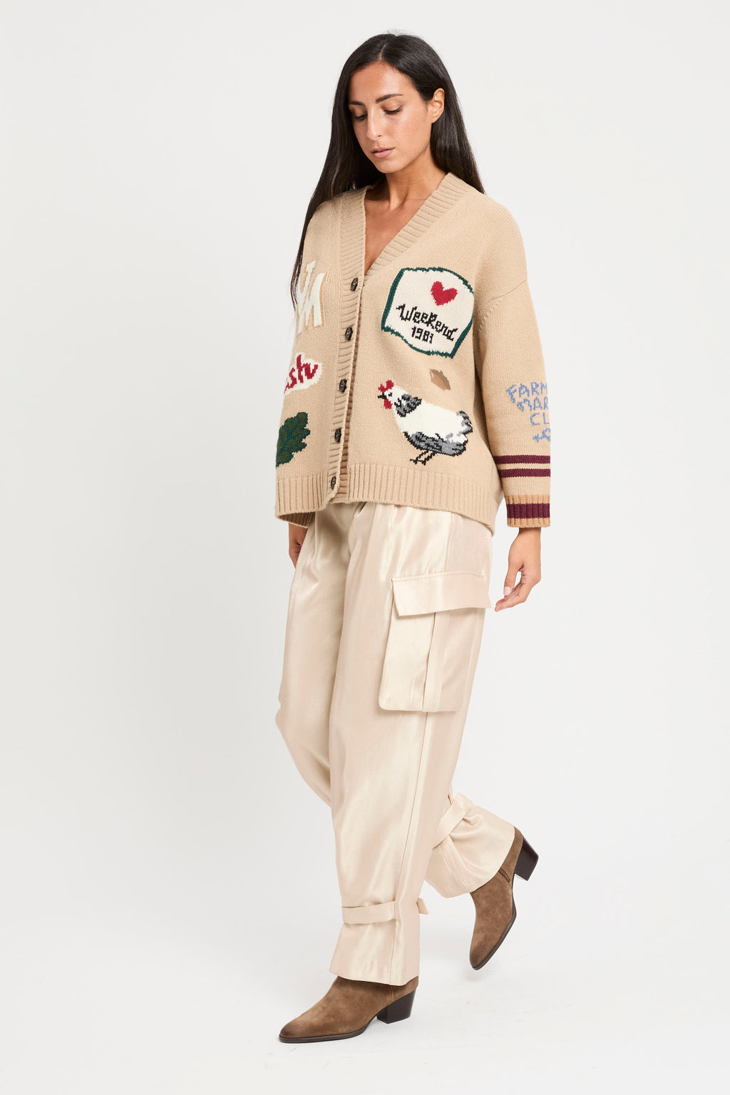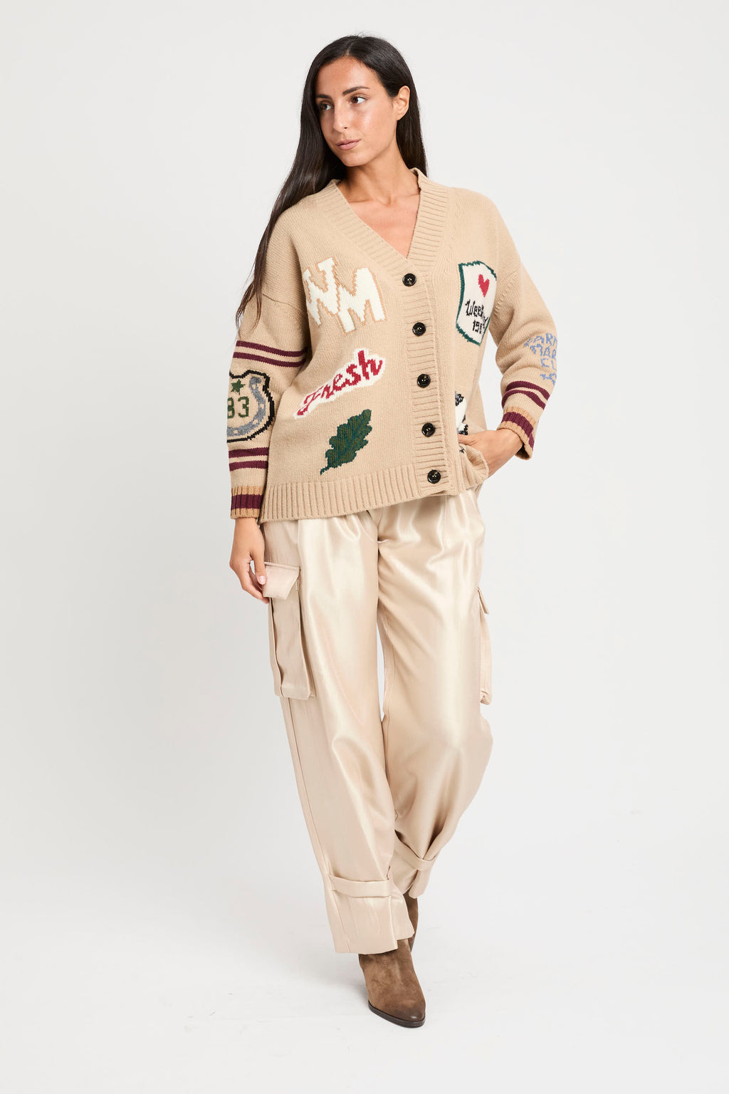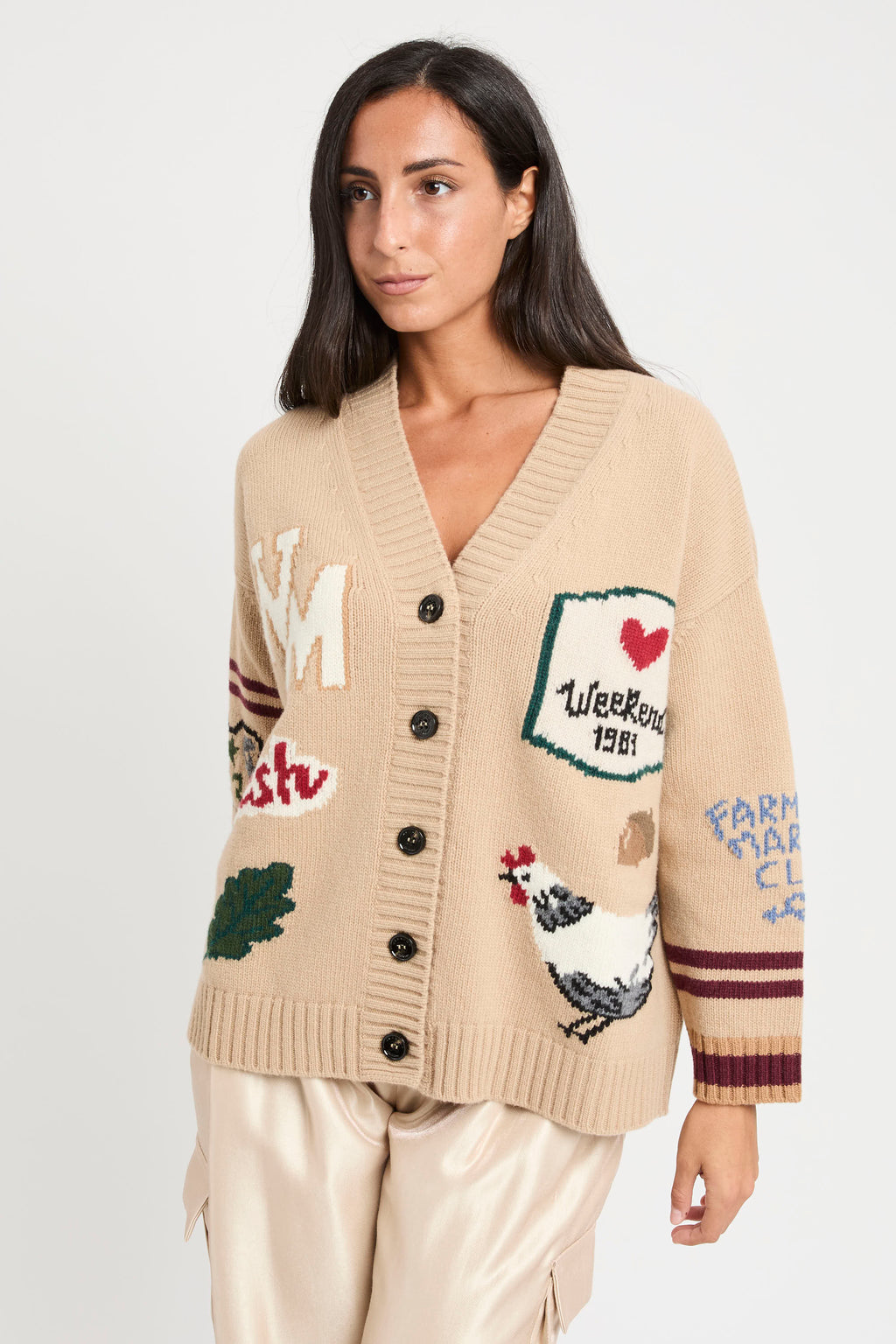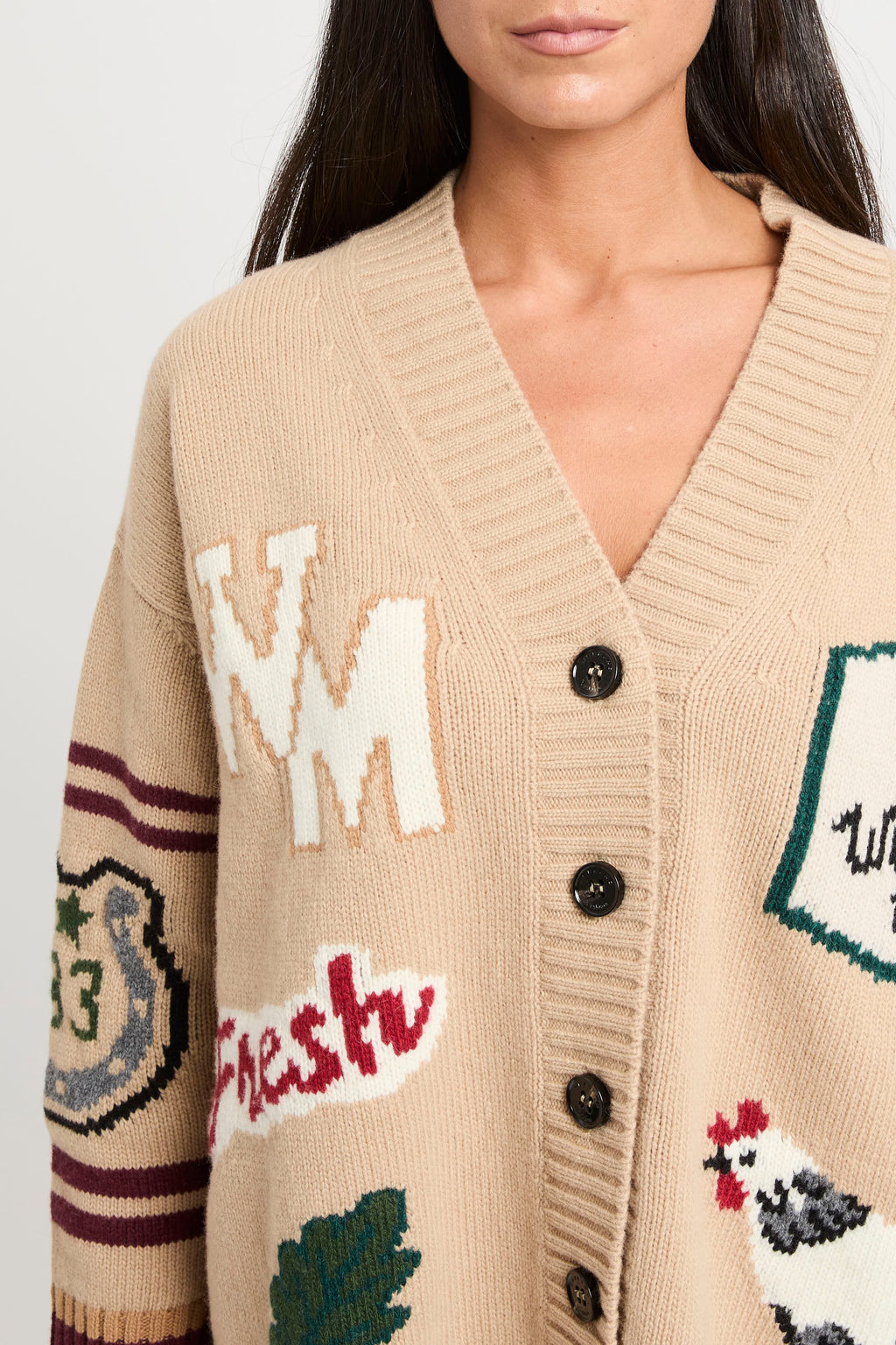 Cardigan overfit, impreziosito da una lavorazione ad intarsio con disegni sul davanti e le maniche.