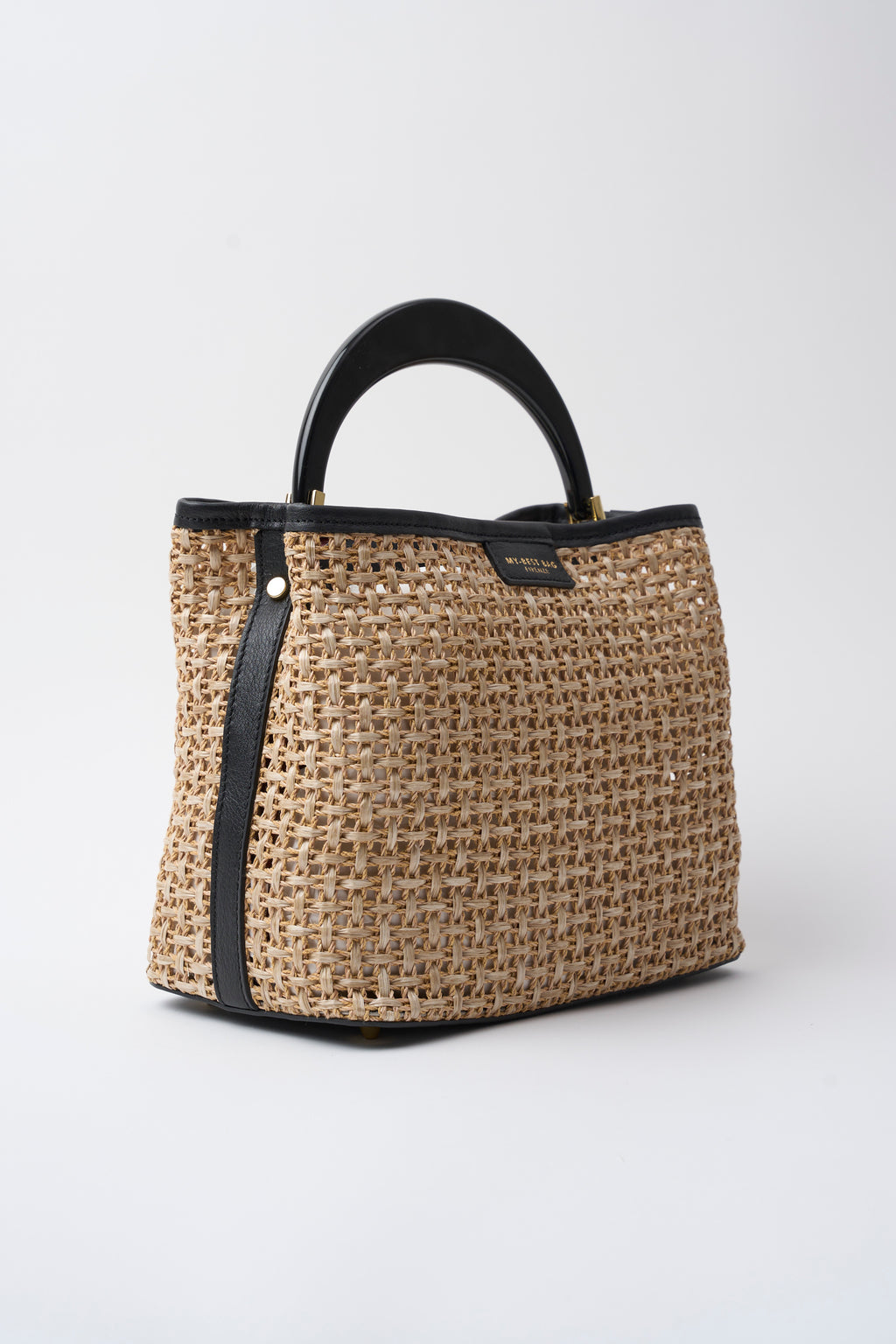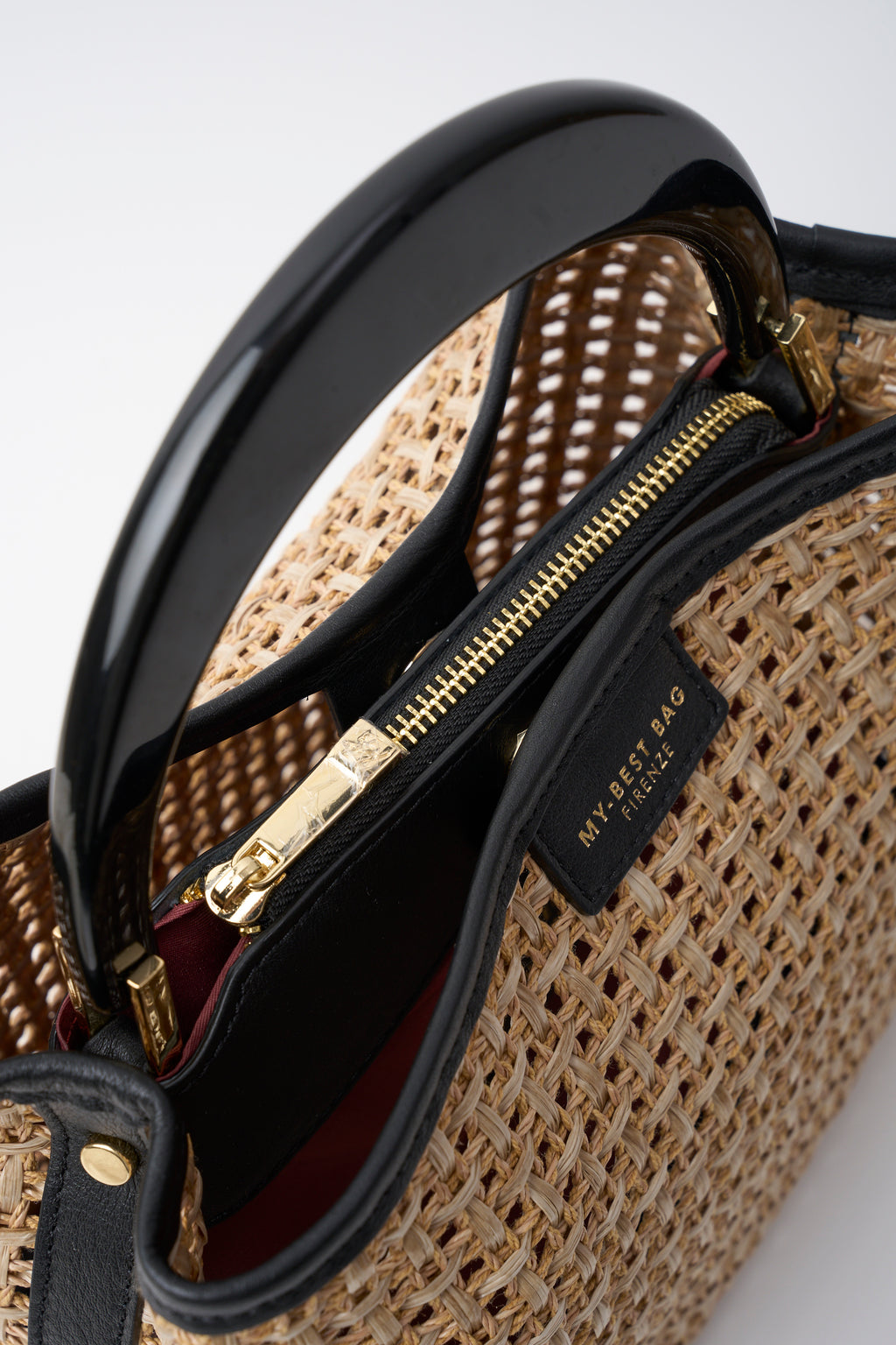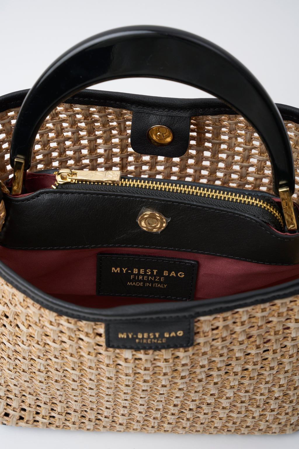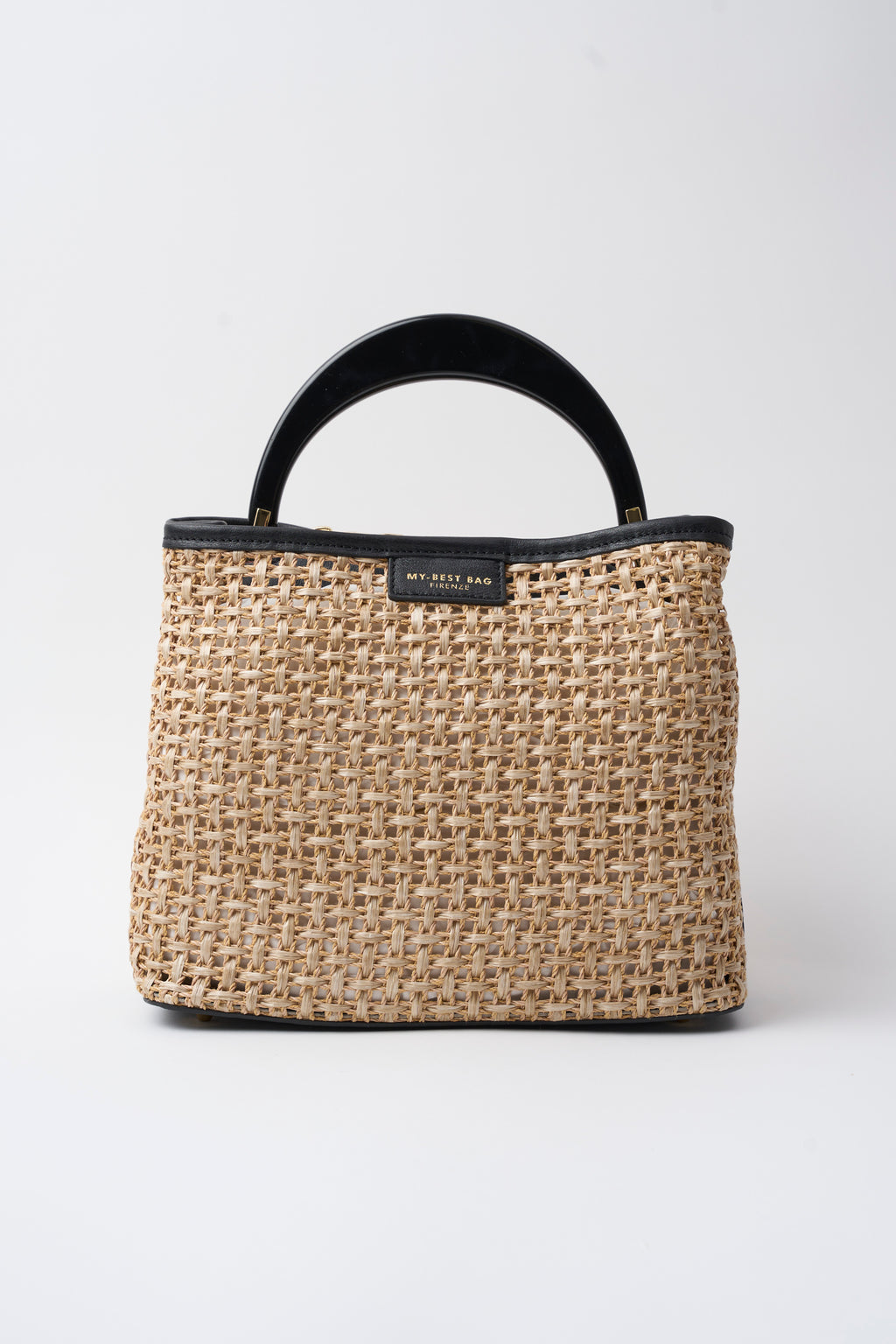 Borsa a mano elegante in pelle e paglia intrecciata, modello Ingrid in nero. Caratterizzata da manico rigido strutturato e tracolla regolabile per versatilità d'uso. Chiusura sicura con zip e dettagli in oro che aggiungono un tocco di raffinatezza. Dimensioni pratiche 25x24x16 cm, perfetta per il giorno. Un accessorio sofisticato che combina materiali nobili e design contemporaneo.
