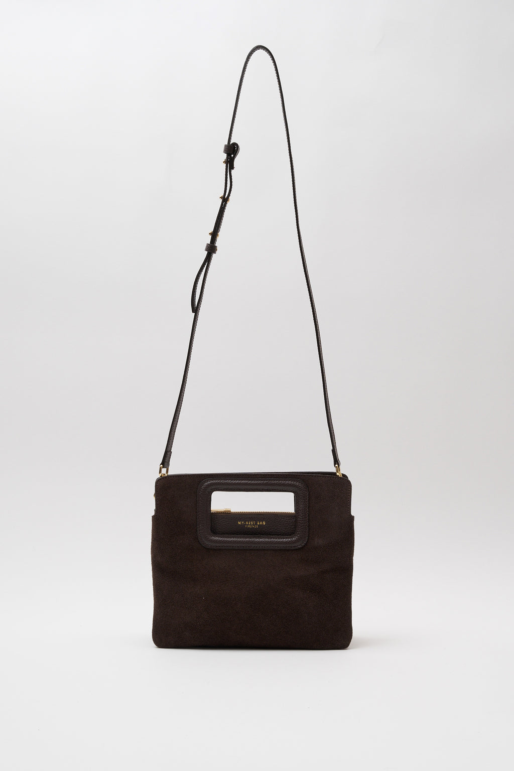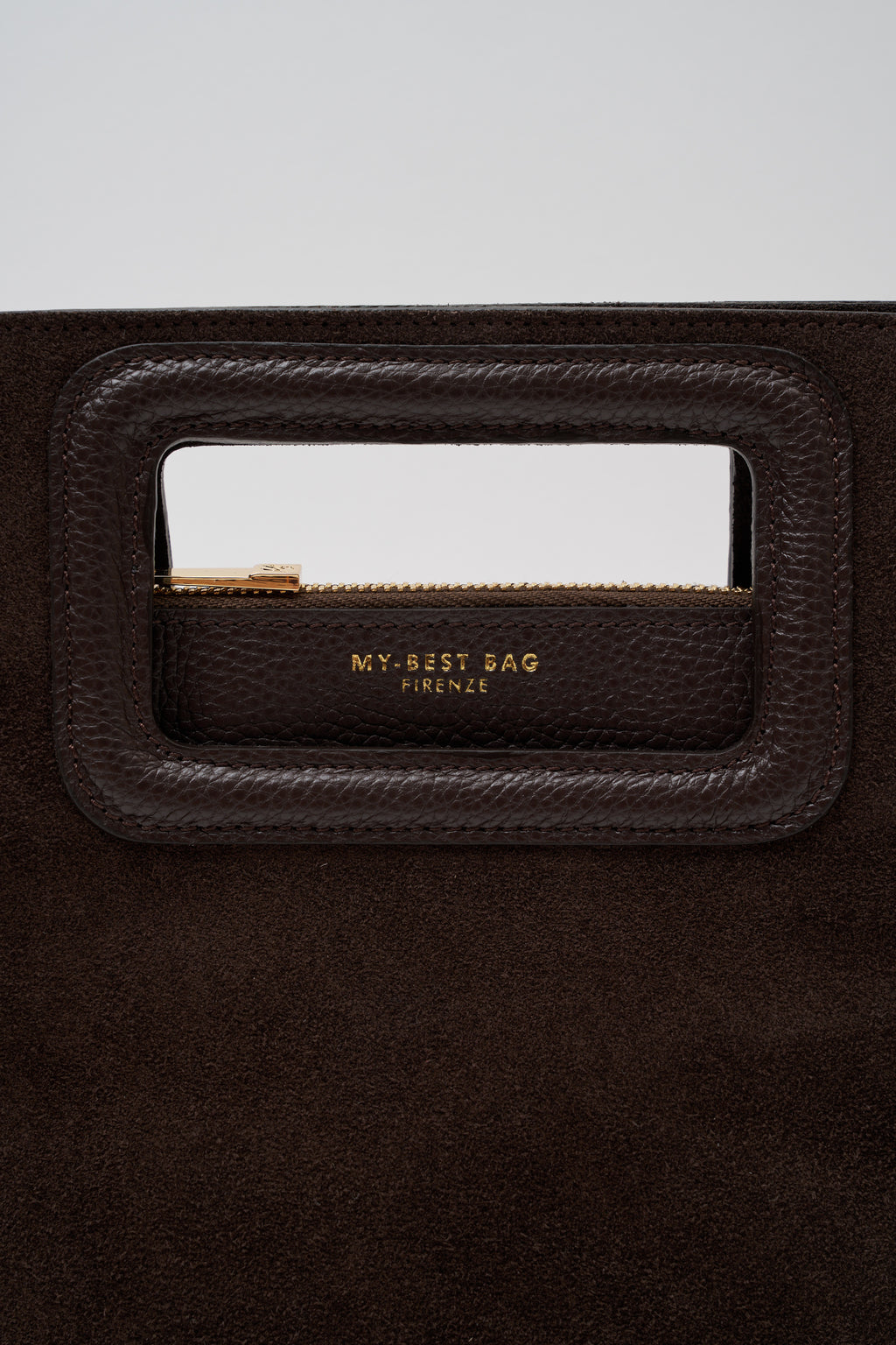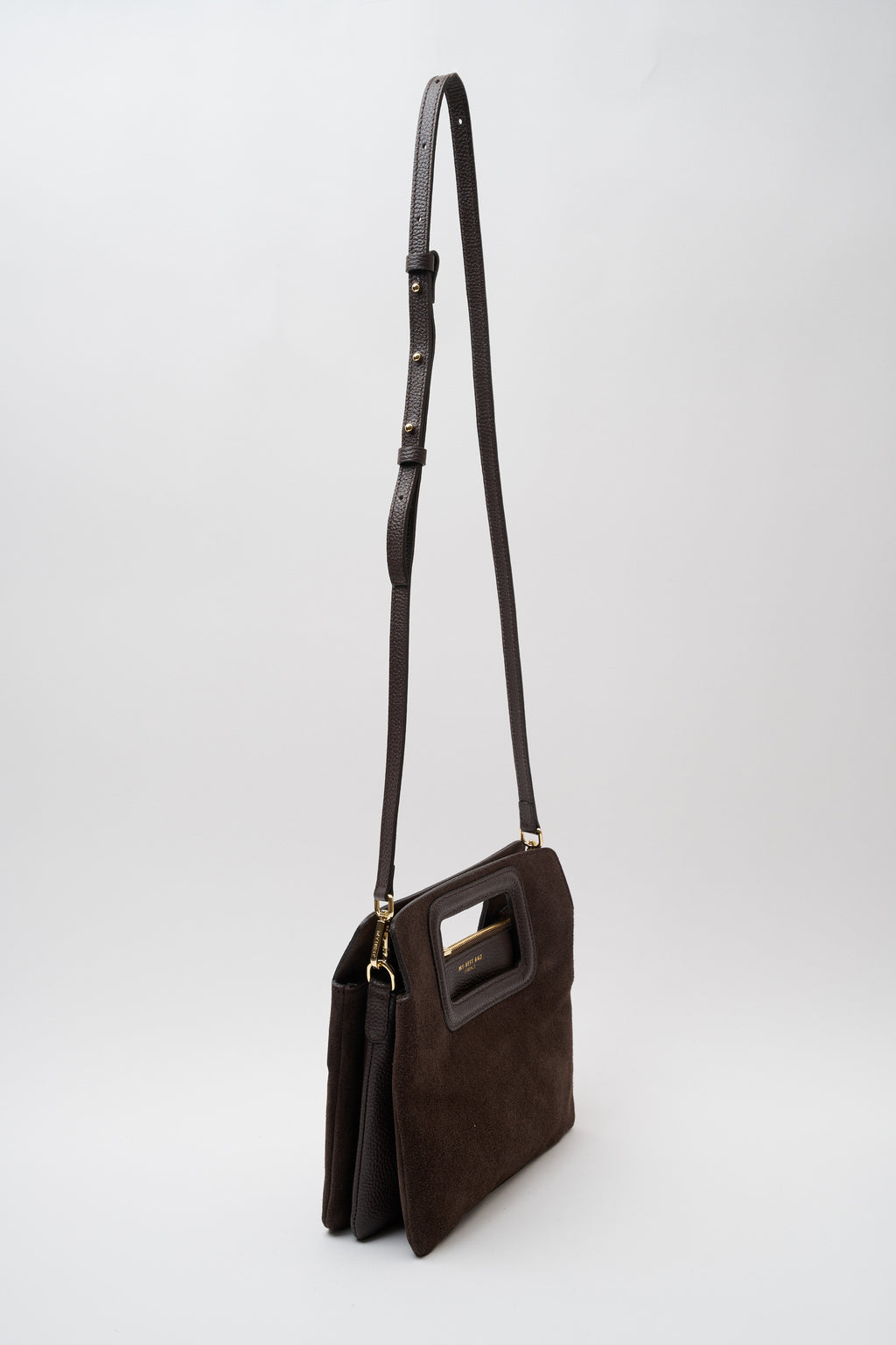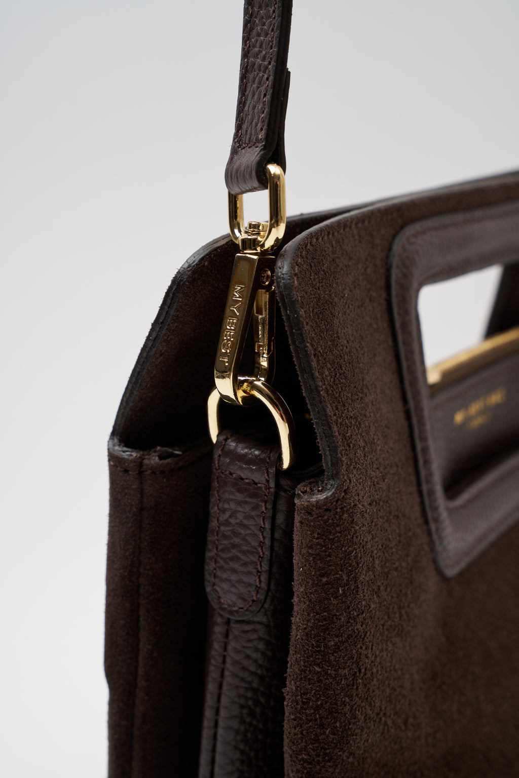 Borsa in camoscio con inserti in pelle, fodera interna in tessuto, scompartata con tasche e zip, misure: 26 x 22 x 9.