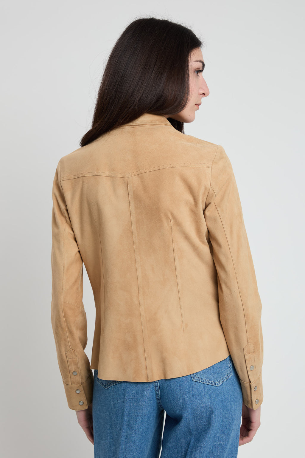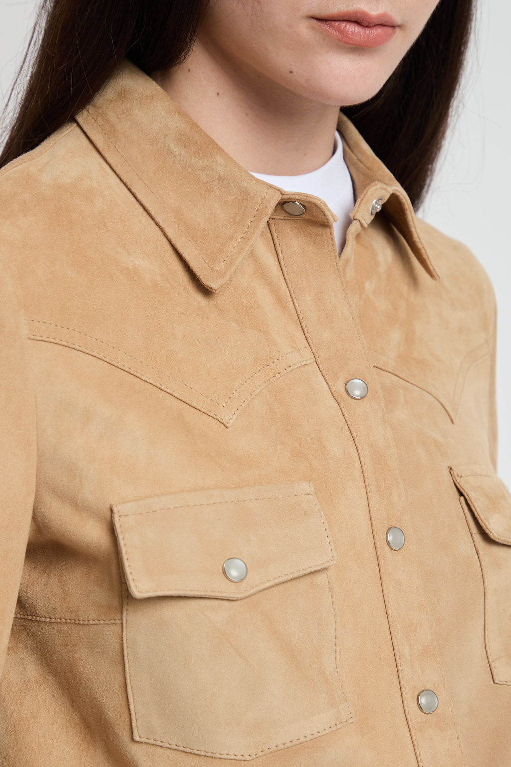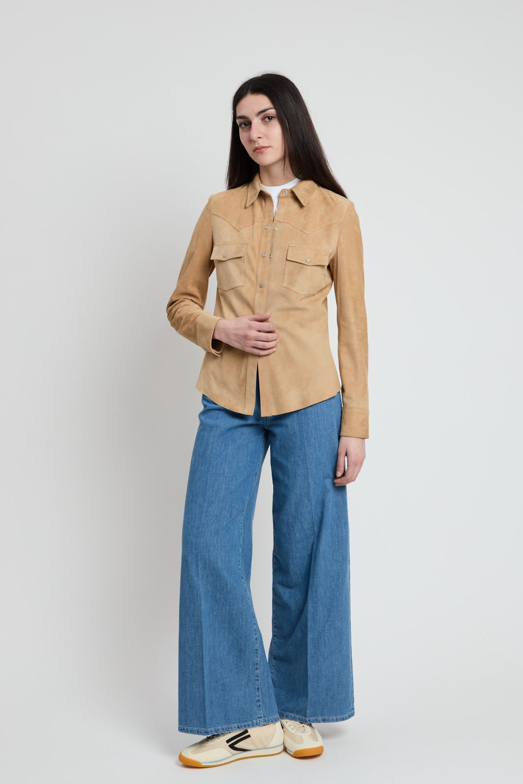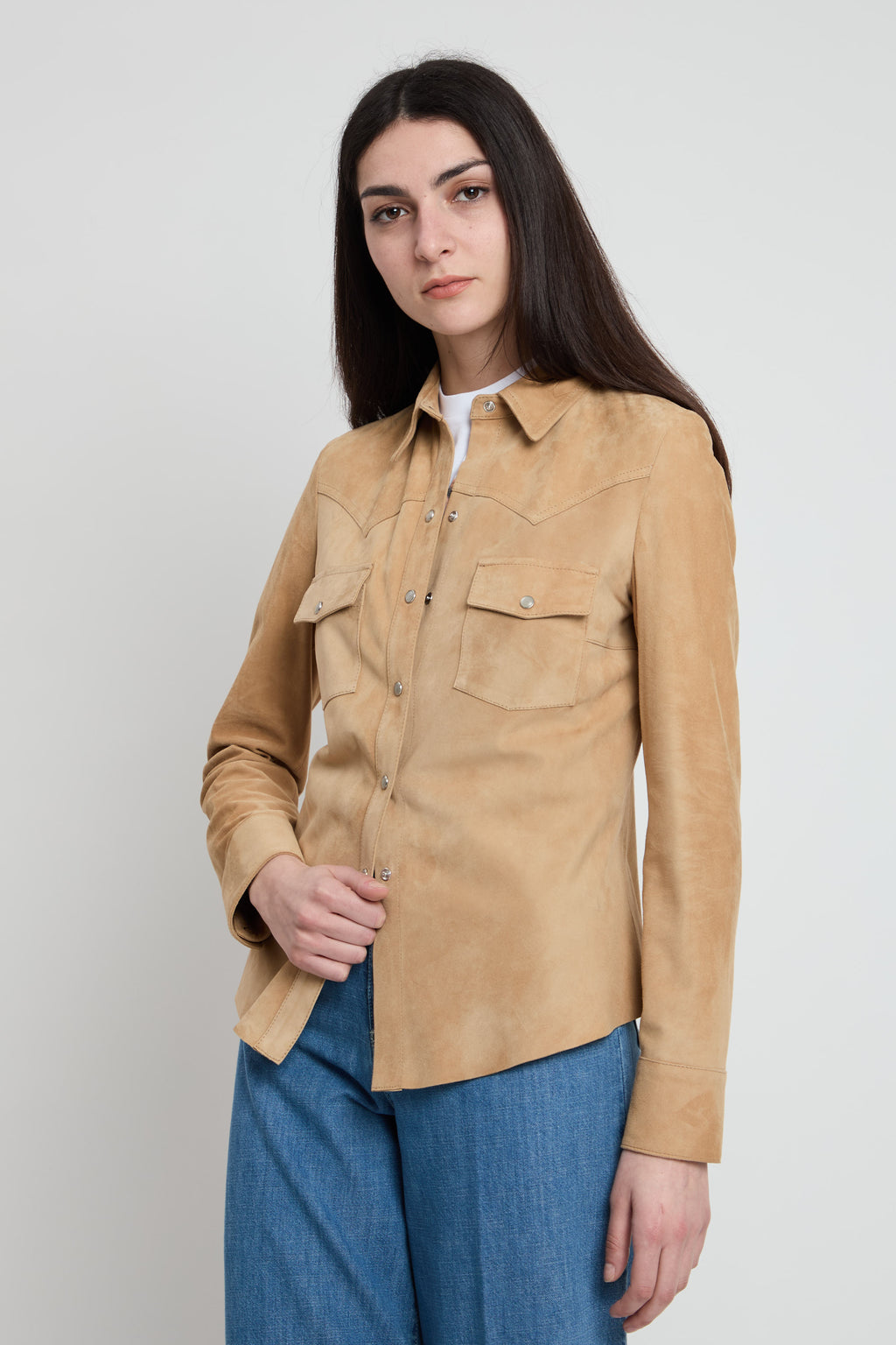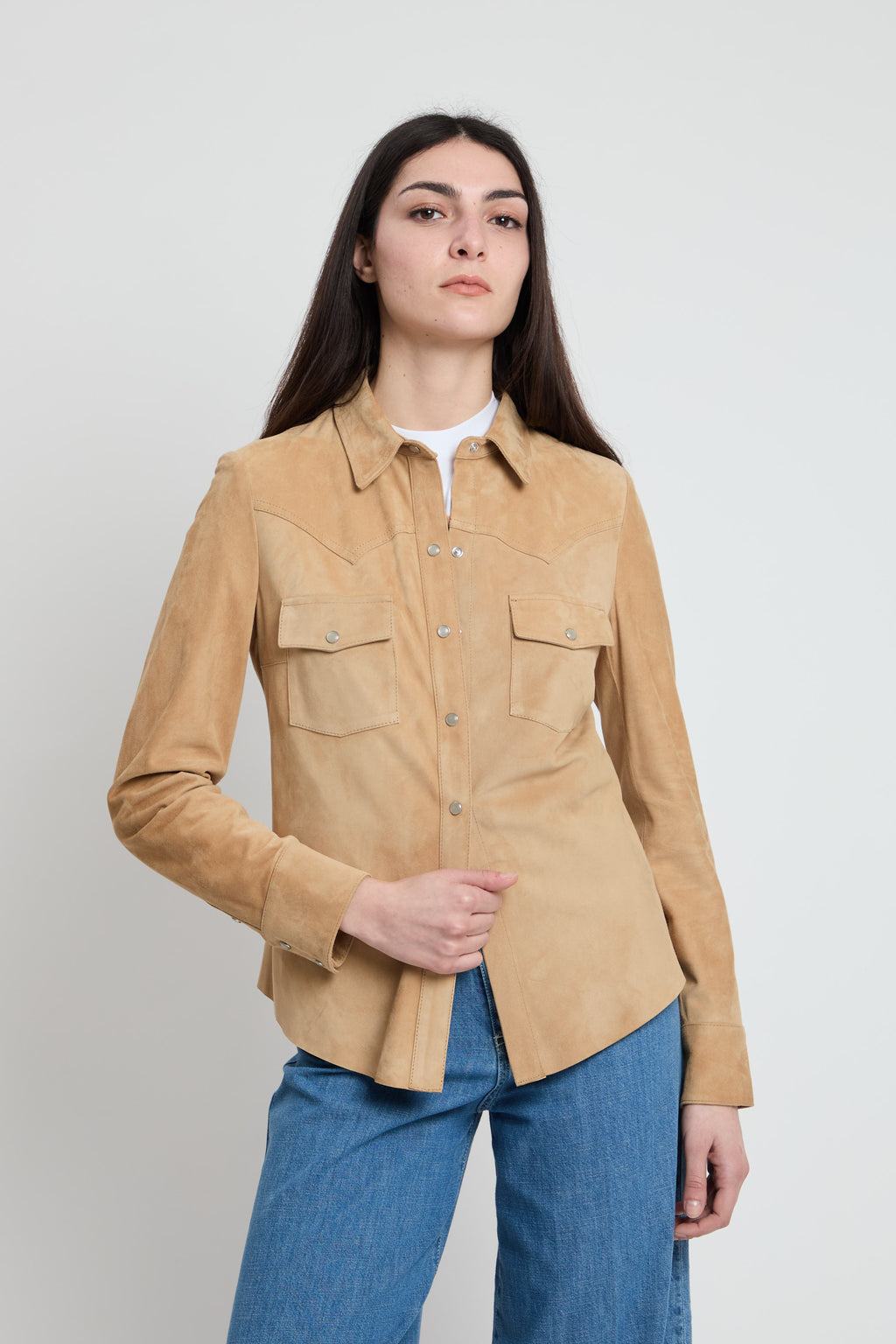 Camicia in morbido camoscio con taglio slim fittato che valorizza la silhouette. Caratterizzata da chiusura button down classica e doppie tasche frontali con pattina per uno stile raffinato e funzionale, il fondo è taglio vivo. Un capo versatile perfetto per creare look sofisticati sia in occasioni casual che più formali.