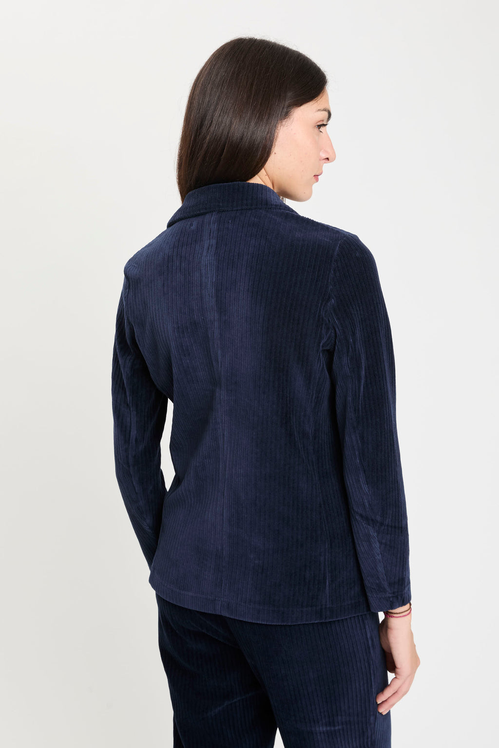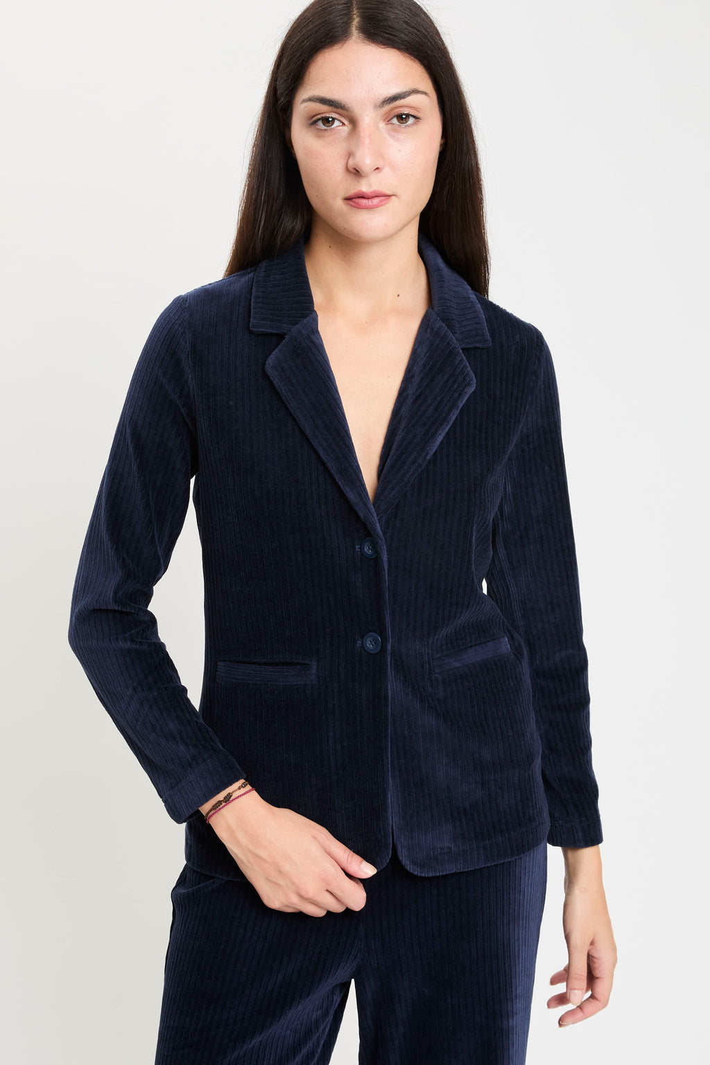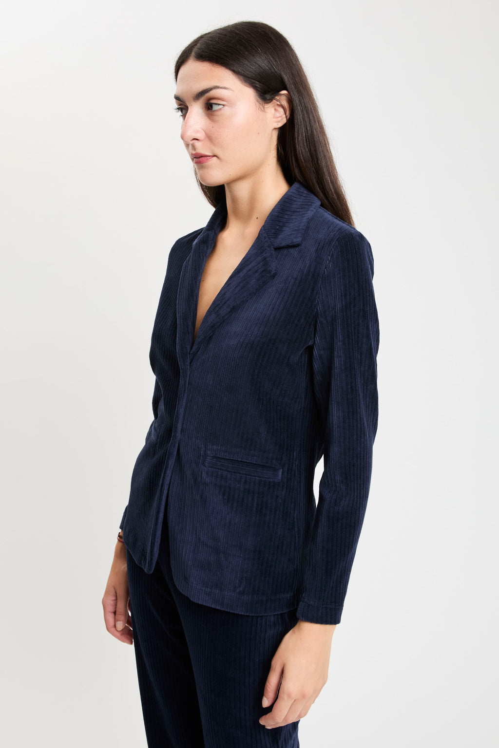 Blazer in velluto a coste color blu, dal taglio sartoriale e raffinato. La texture morbida e corposa del velluto incontra una silhouette classica con revers a lancia e chiusura frontale a due bottoni, rendendo questo capo un must-have per look eleganti e sofisticati. Perfetto da indossare come pezzo unico o come parte di un completo coordinato.