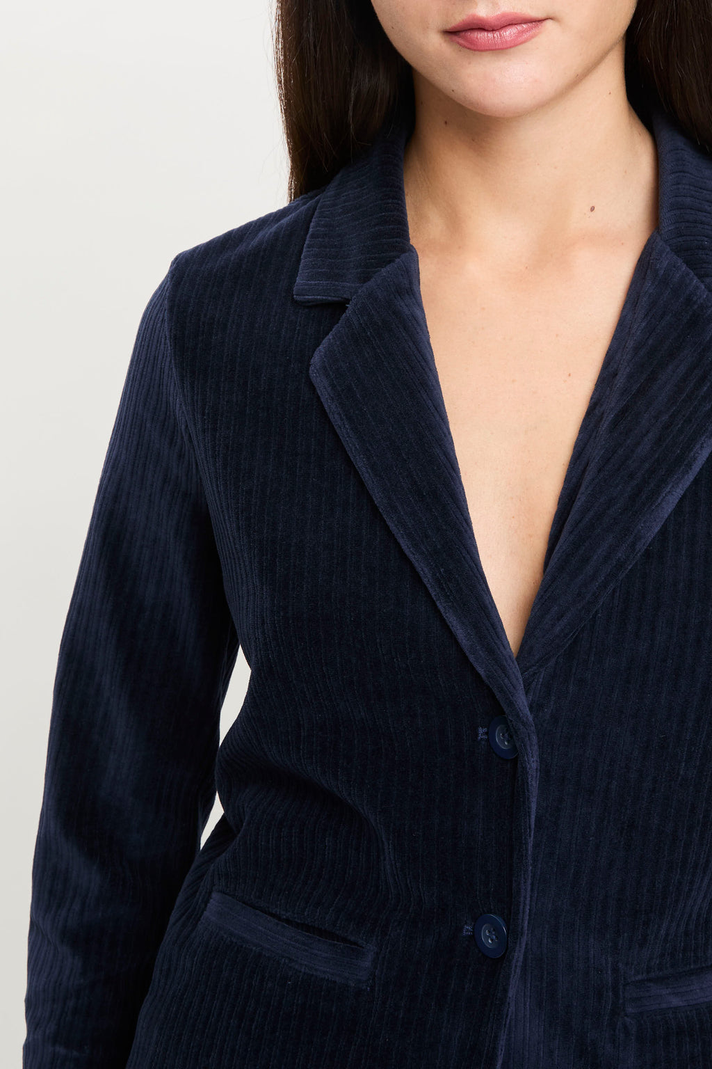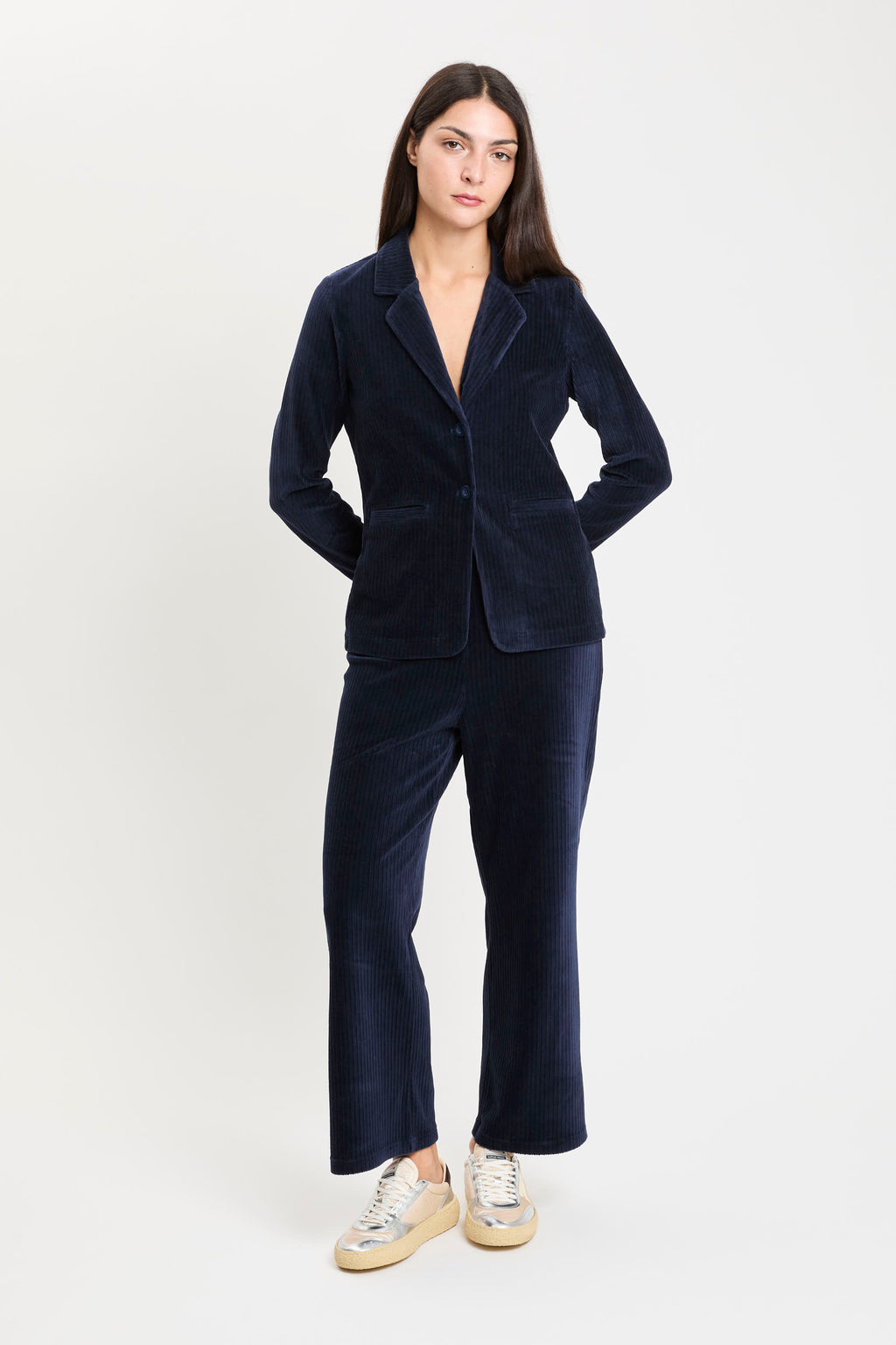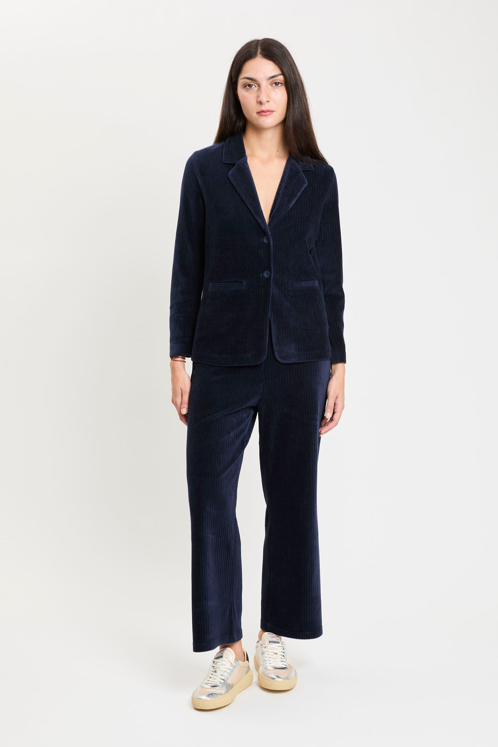 Blazer in velluto a coste color blu, dal taglio sartoriale e raffinato. La texture morbida e corposa del velluto incontra una silhouette classica con revers a lancia e chiusura frontale a due bottoni, rendendo questo capo un must-have per look eleganti e sofisticati. Perfetto da indossare come pezzo unico o come parte di un completo coordinato.