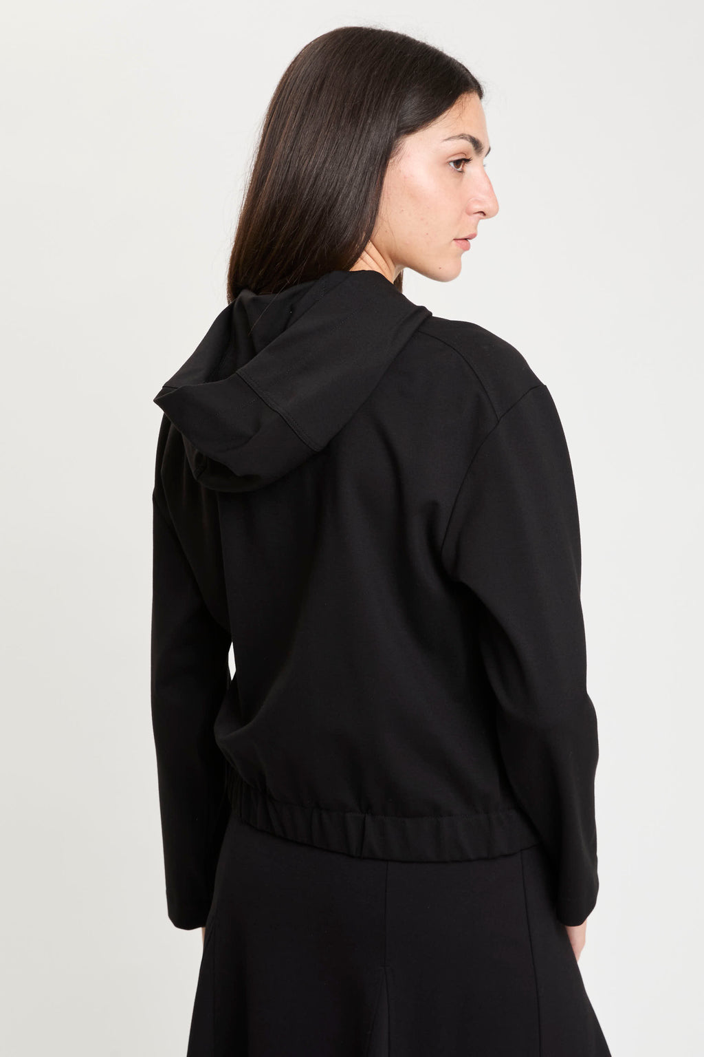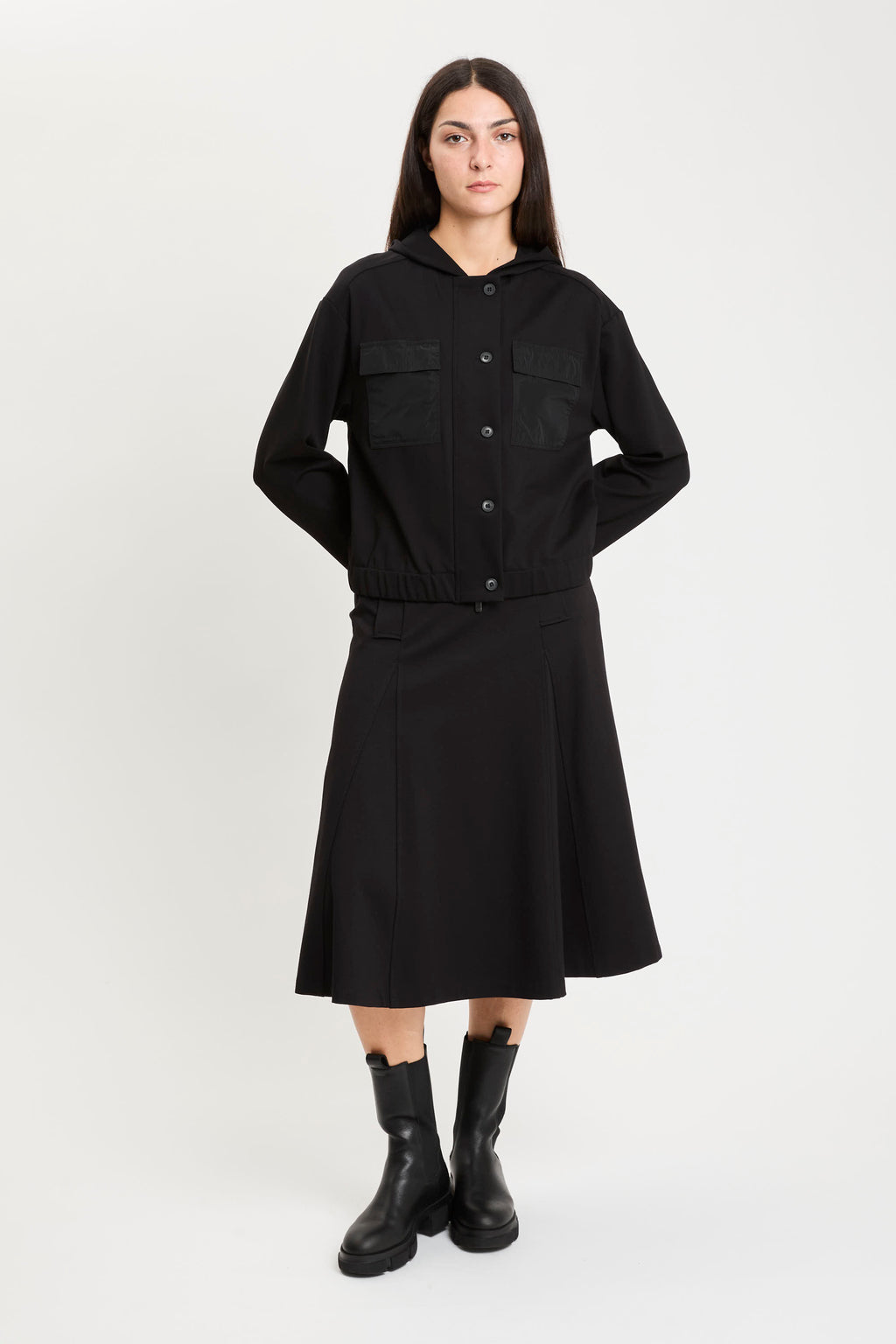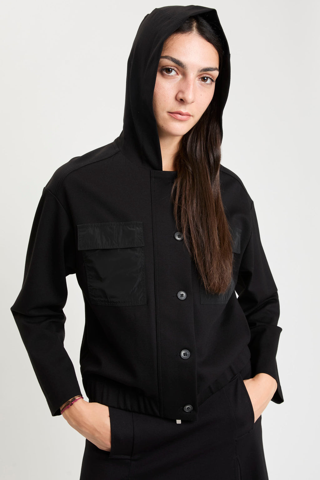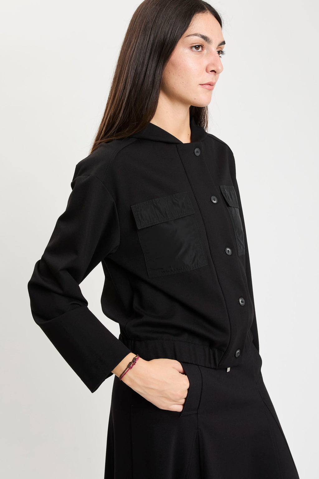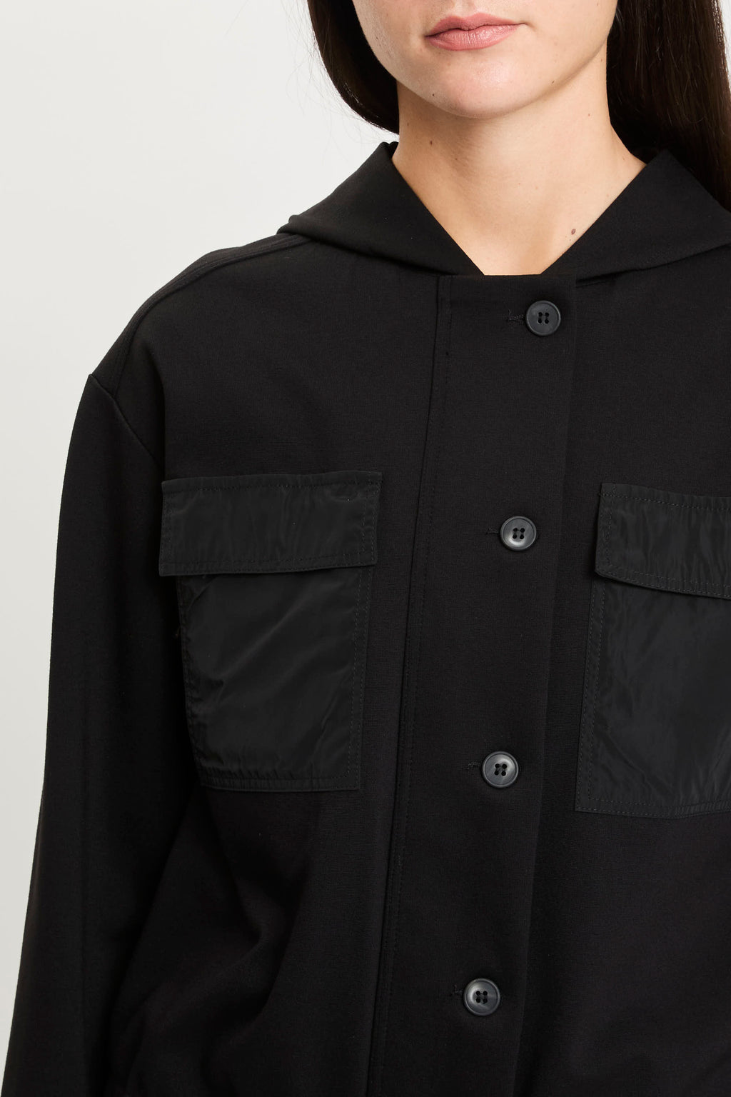 Giacca-camicia dal design minimal in tessuto nero compatto, arricchita da due taschini applicati sul petto in tessuto tecnico lucido. La chiusura frontale è con bottoni a vista tono su tono, mentre il fondo elasticizzato garantisce comfort e una vestibilità pratica. Le maniche sono lunghe con polso semplice e il cappuccio completa il capo con un tocco sportivo-contemporaneo.