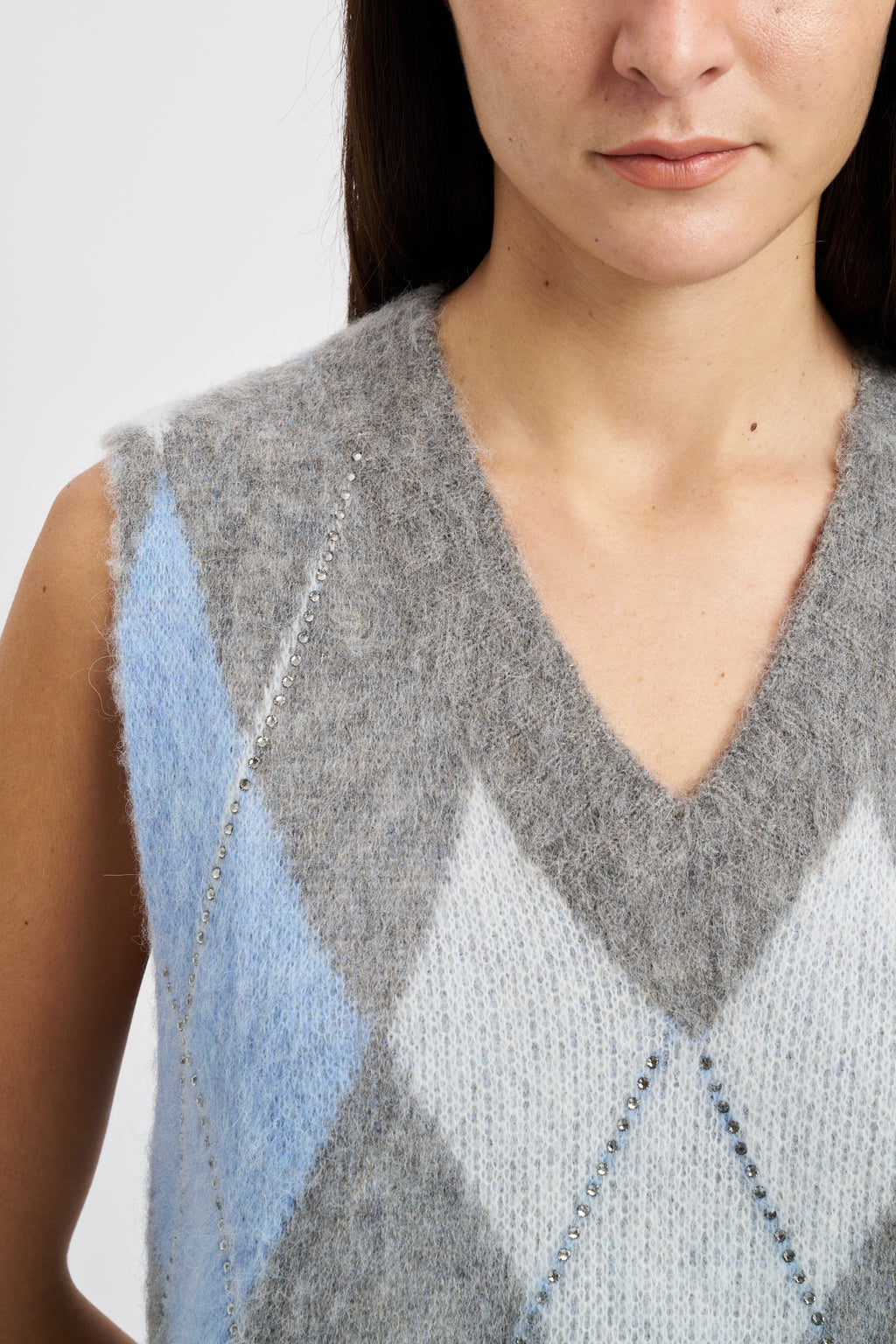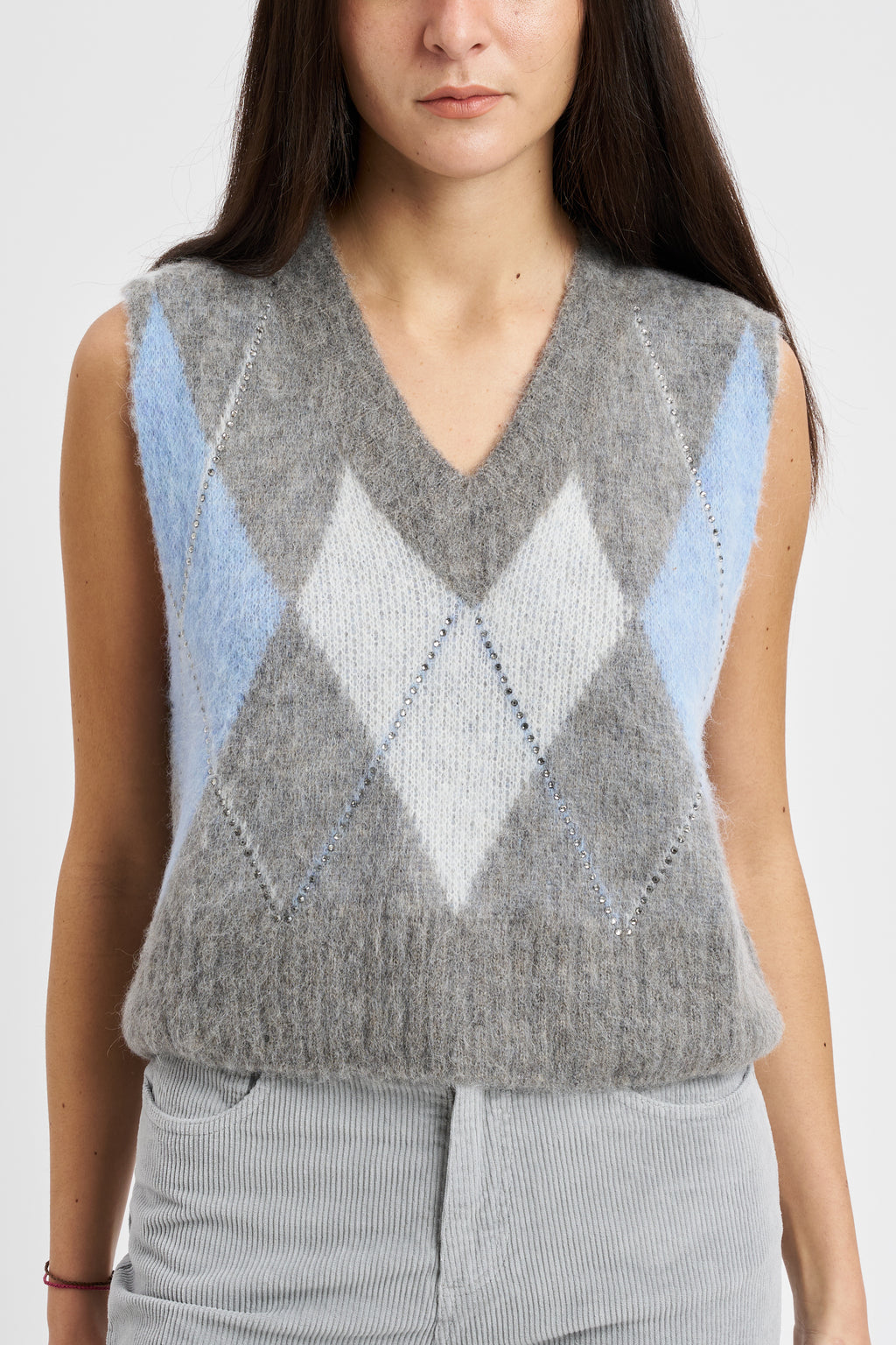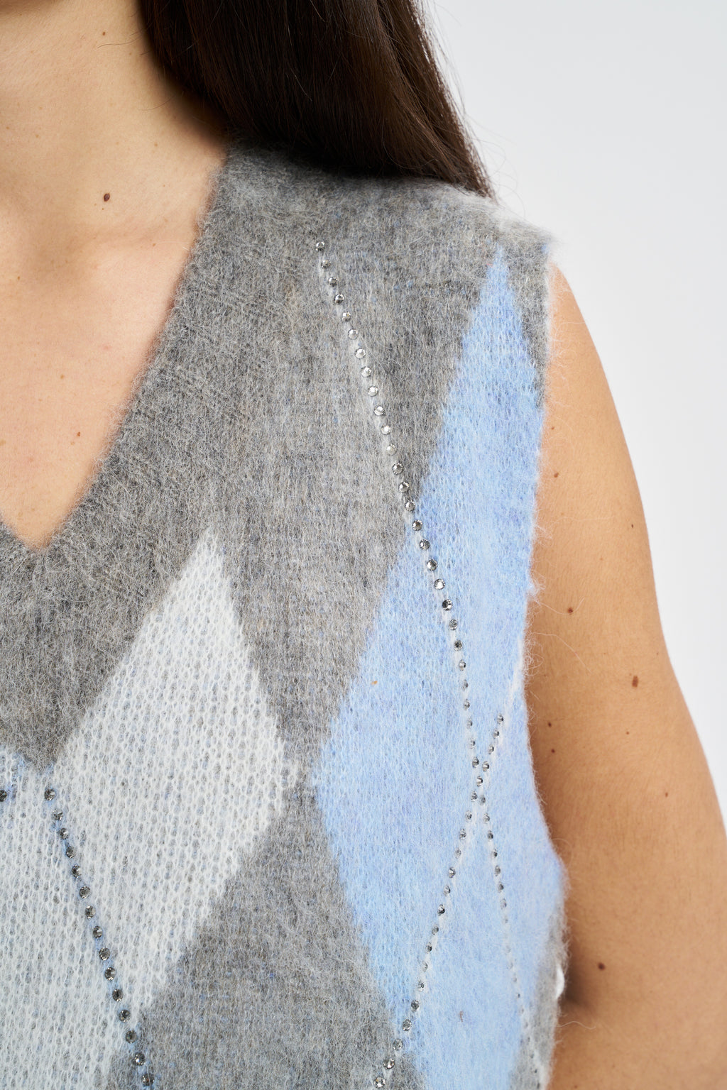 Gilet in misto alpaca motivo losanghe con piccole file di strass