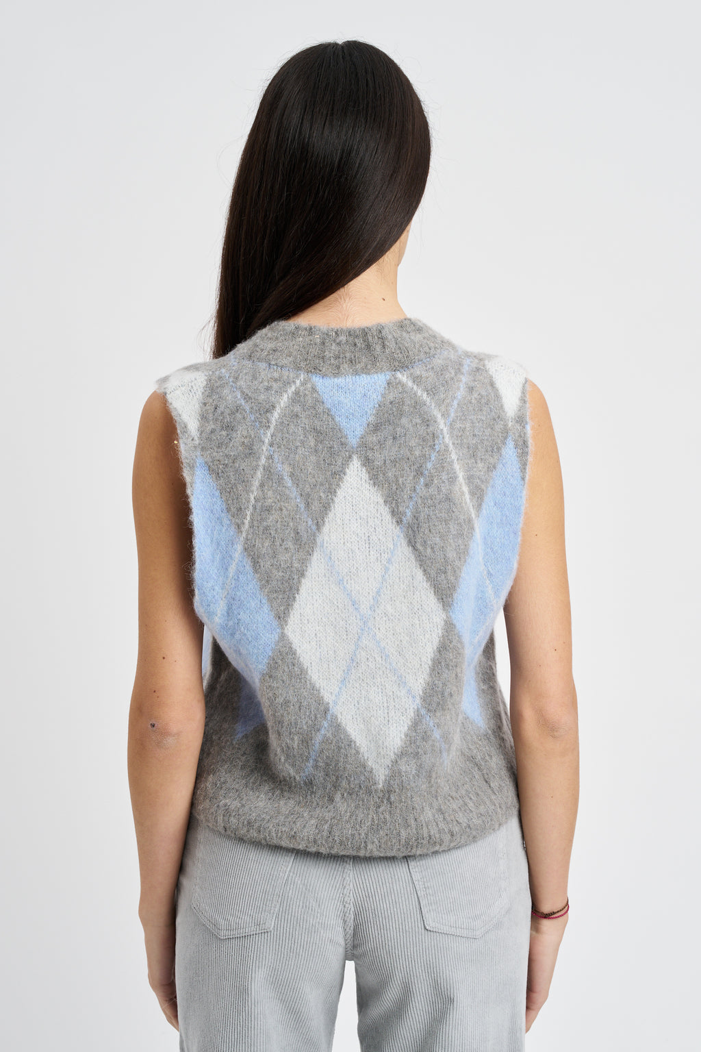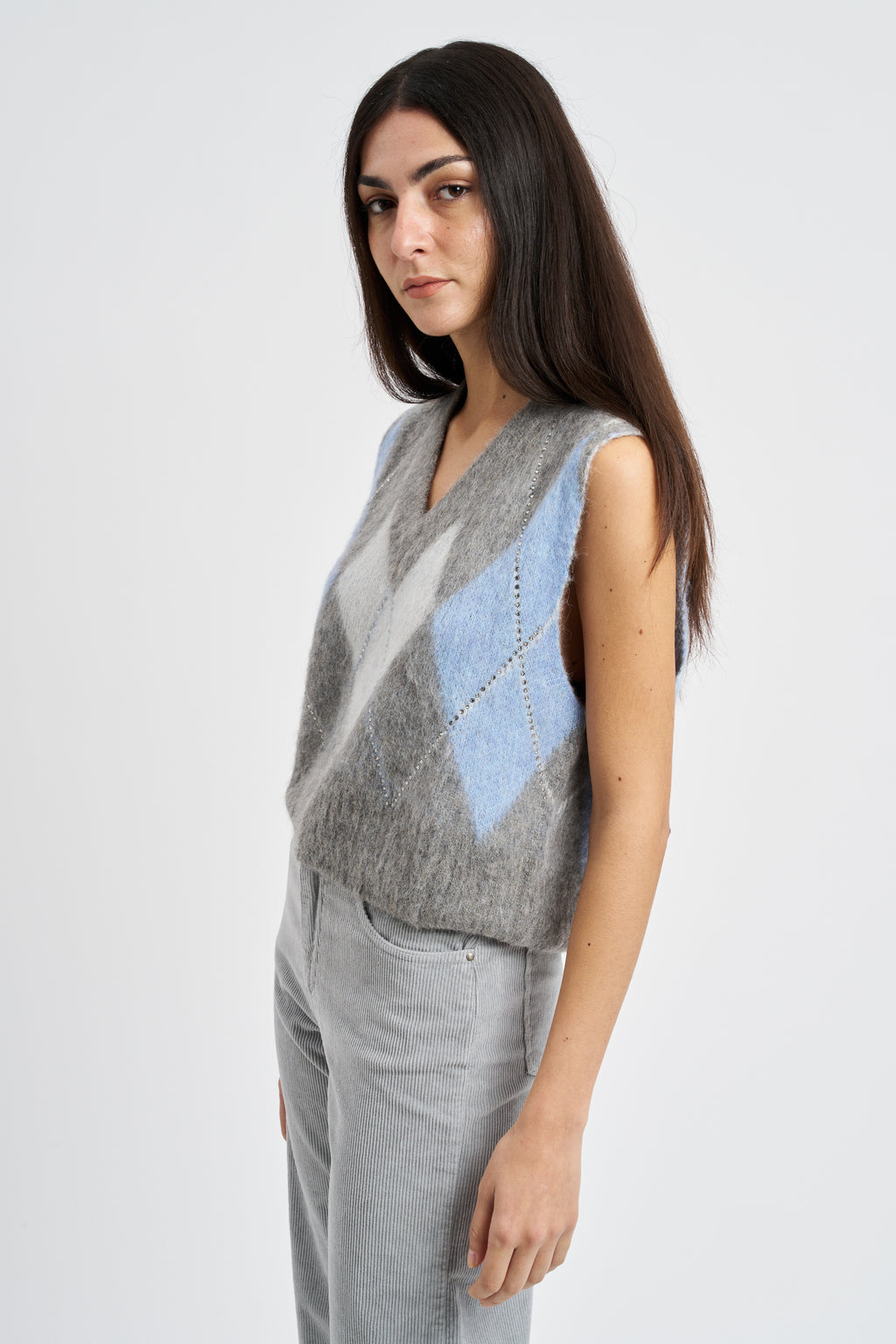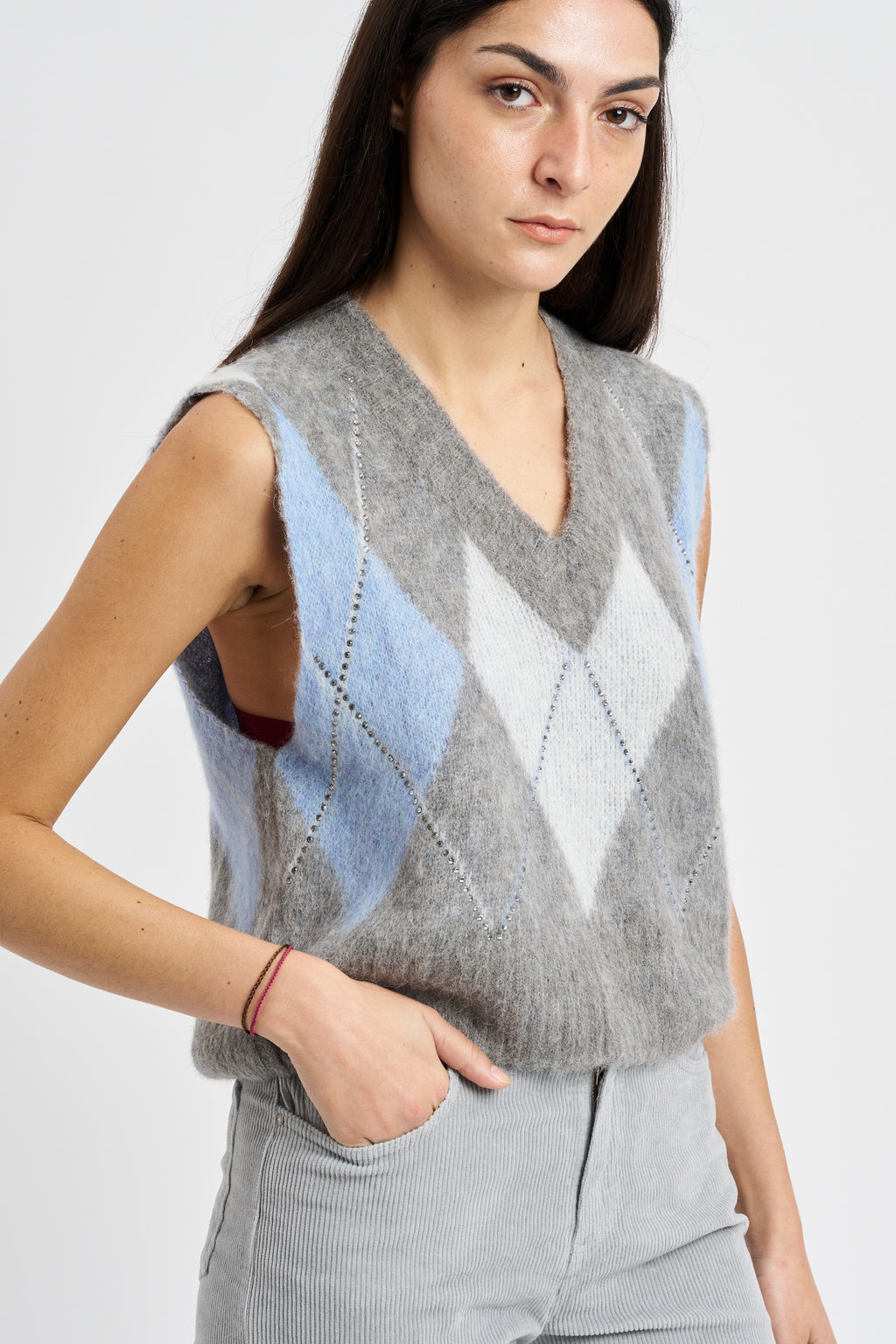 Gilet in misto alpaca motivo losanghe con piccole file di strass