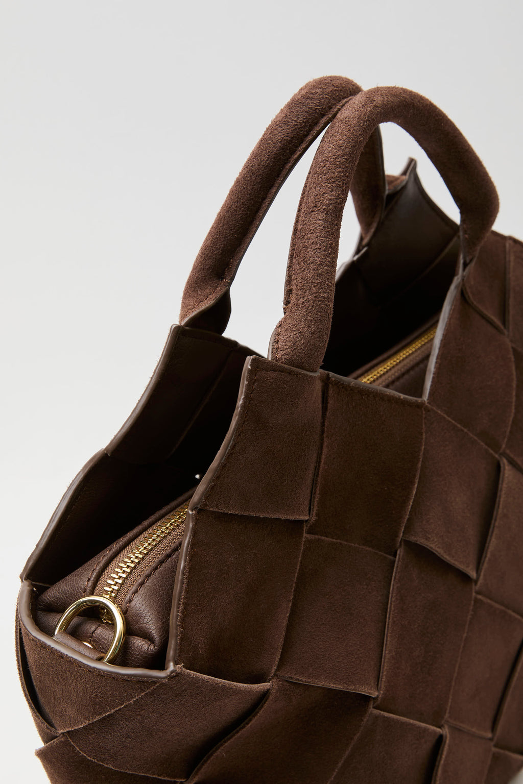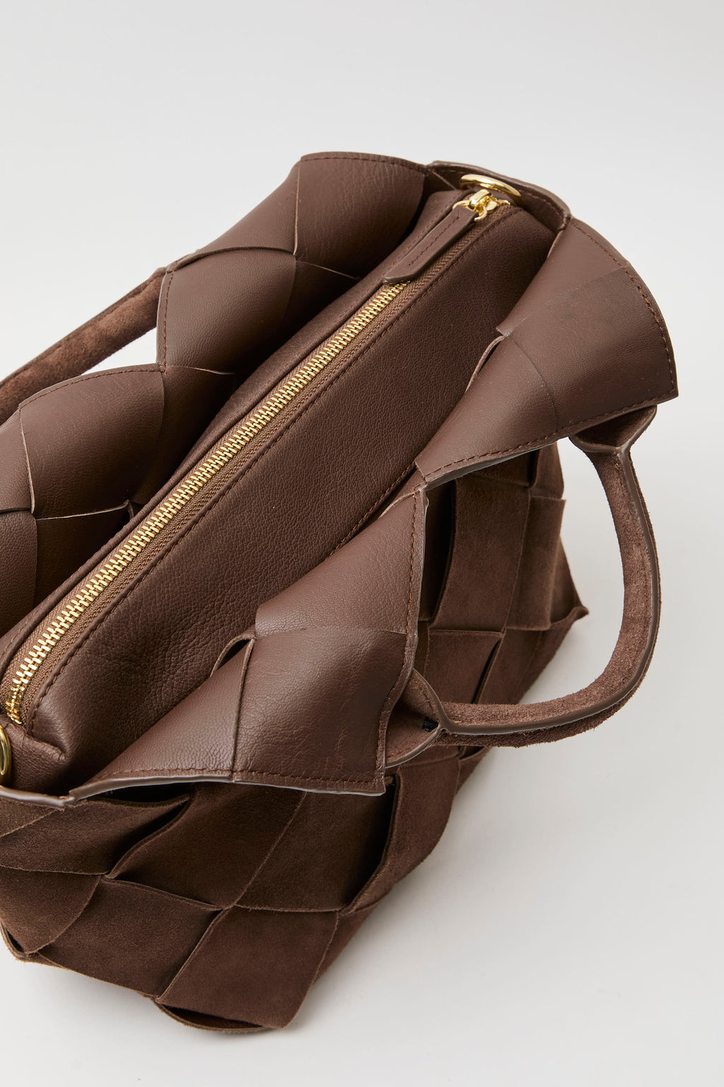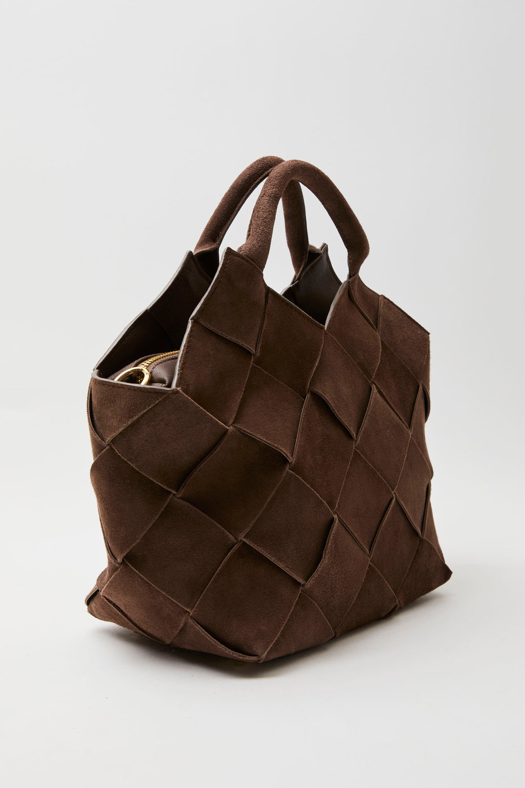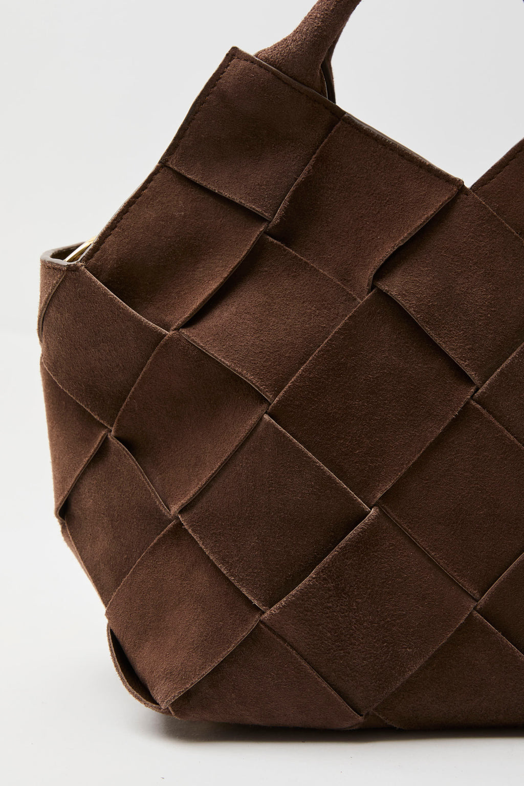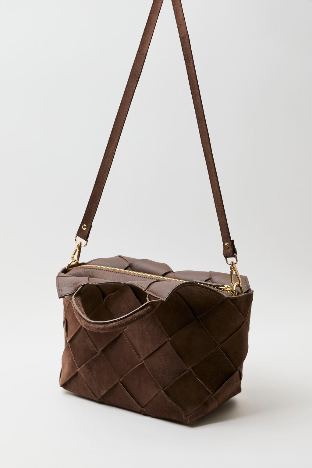 Borsa intrecciata in pelle scamosciata, borsa interna con zip, tasca interna e tracolla in pelle.